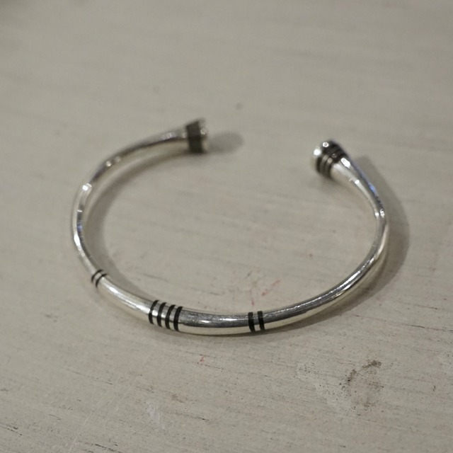 青の民と呼ばれるサハラ砂漠周辺で暮らす遊牧民"トゥアレグ族"の伝統的なシルバージュエリーが入荷致しました。 こちらは本場アフリカ西部のニジェール地方で現代まで技術を引き継ぐ職人によって生産された個体になります。 トゥアレグジュエリーの1番の特徴は、使用される銀の純度。 銀の含有量が非常に高くほぼ純銀に近い"トゥアレグシルバー"と呼ばれる素材を使用することで生まれる独特の柔らかさ、美しい光沢が大変魅力的です。 元々はキャラバンのお守りとして製作されていたもので、旅の途中で迷わないための魔除け、襲撃にも負けないまじないなどの意味を持つとされ、遊牧民として生きてきた歴史そのものが刻まれております。 丸線をベースに、節のような意匠を組み込んだデザインの一本。 単調になりがちな丸線バングルにリズムを与える構造になっております。 彫刻自体は最小限に留められており、形状の変化そのものをデザインとして成立させた一本。 大量生産では決して生まれない時間と手仕事の痕跡がそのまま形になったジュエリーです。 この機会に是非お試しください。 Size: 開口部約3cm内周約15.5cm太さ約0.5cm ◎こちらの商品は送料無料にて 発送させて頂きます。 ※一部例外を除き、 基本的に返品、交換は受け付けません。 ※ 商品についてのご質問、お問い合わせは お問い合わせフォームまで。