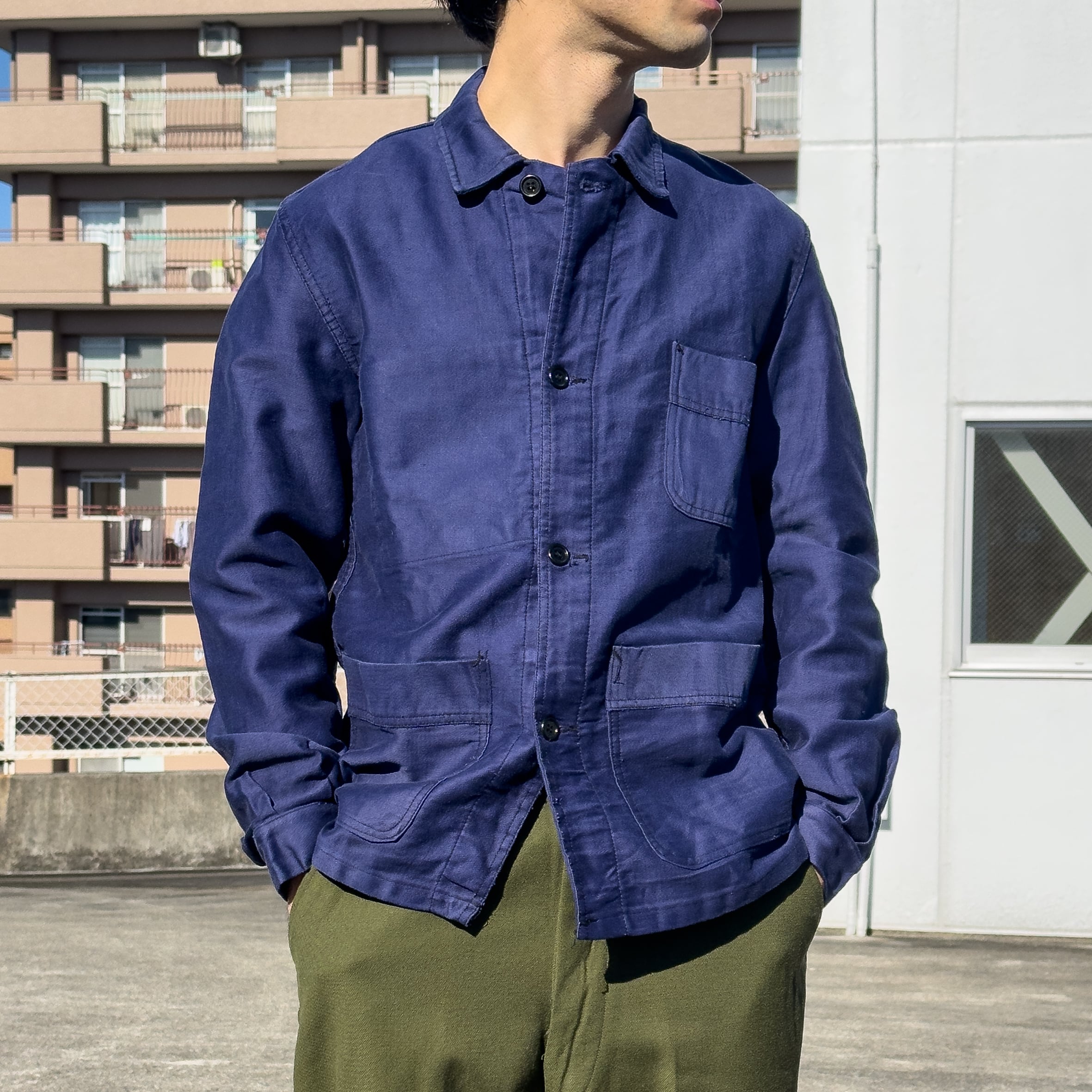 胸ポケット1つ + 大型のパッチポケット2つの3つポケ仕様、ラウンド気味に削られた小ぶりの襟、当時らしい 4ボタンのフロントなどディテールはフレンチワーク定番の仕様。