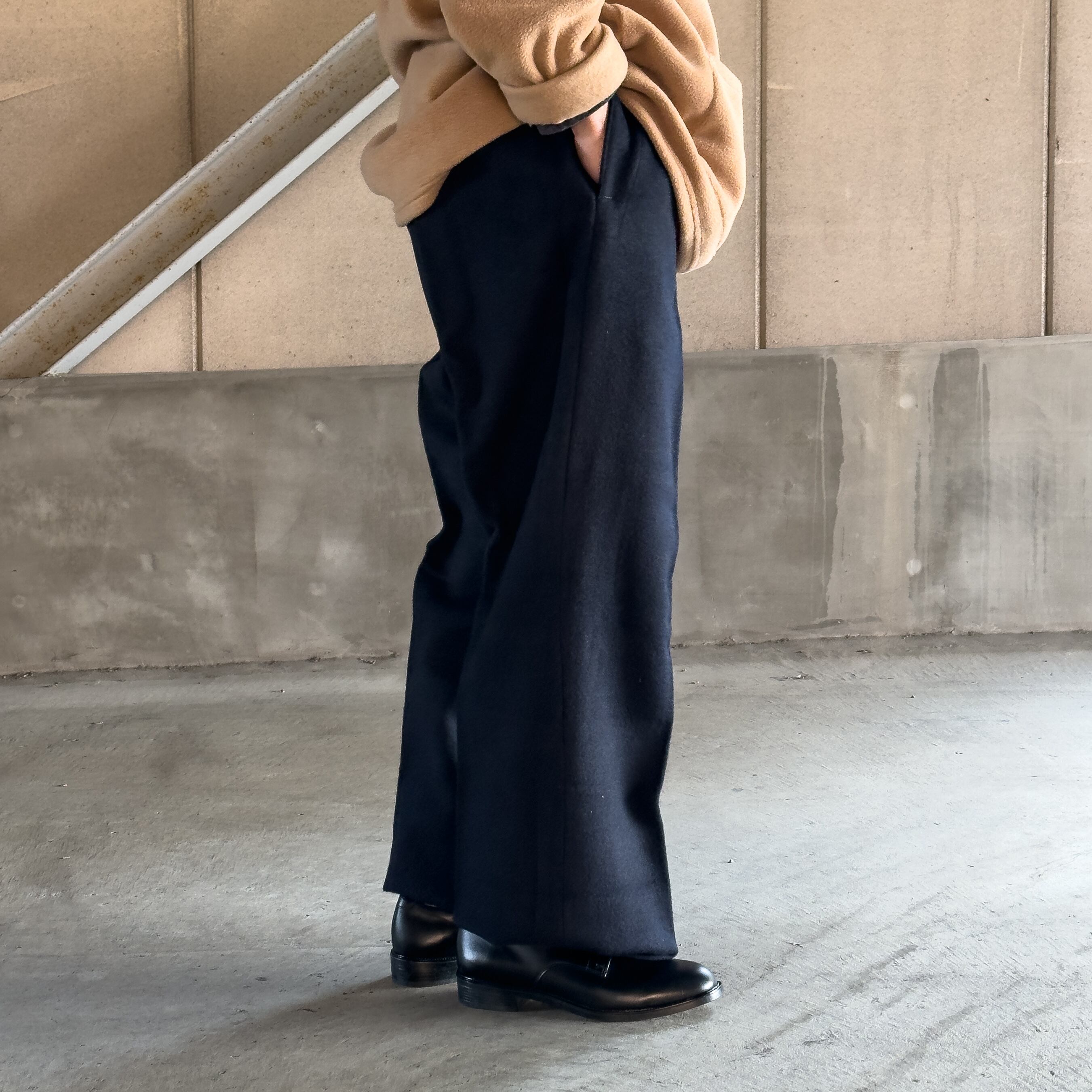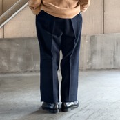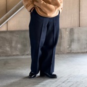 腰回りに余裕を持たせ裾に向かってストンと落ちるワイドストレートで、太さがしっかりある上に上品というこのパンツならではの魅力が詰まっております。
