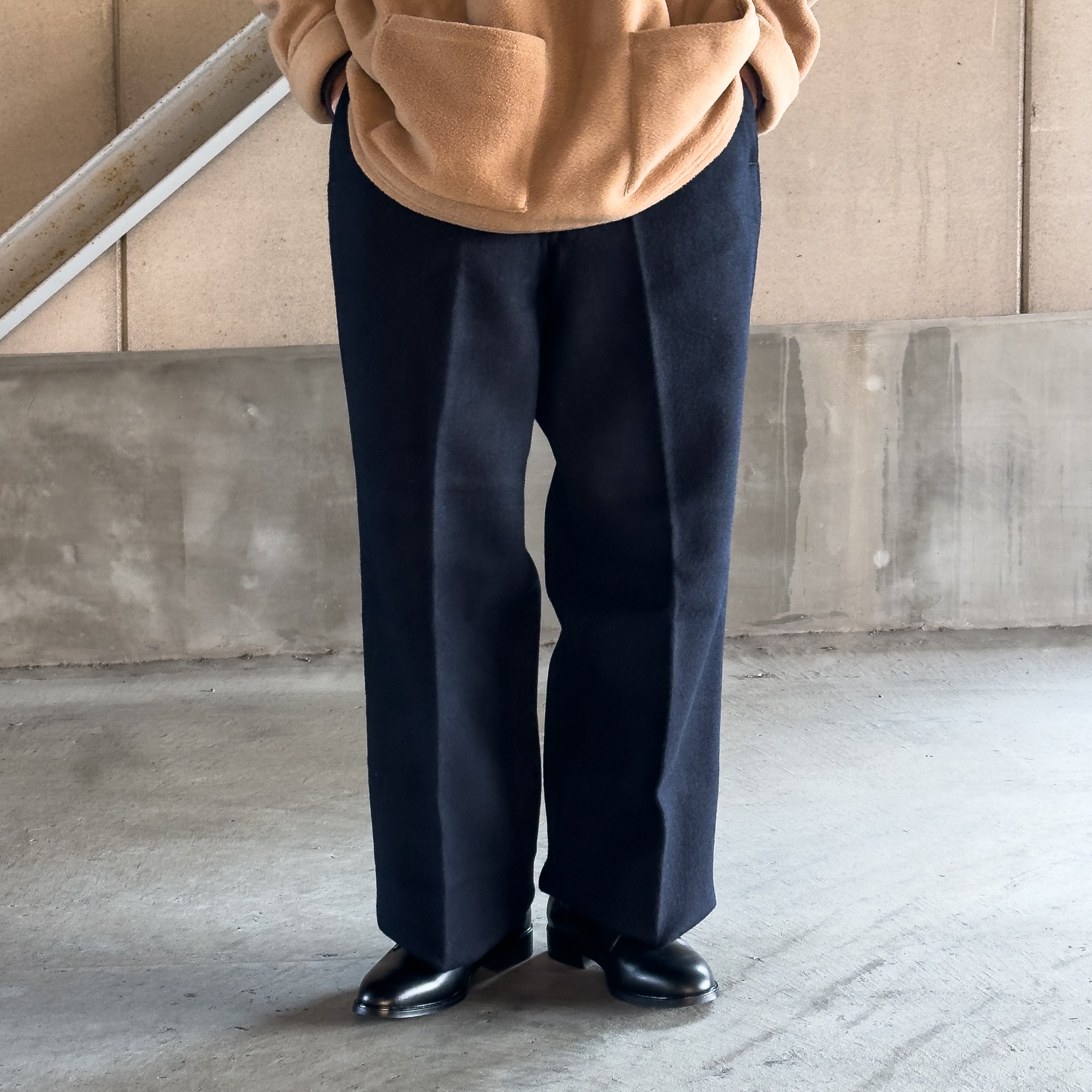 しっかりとした肉感があり、防寒性と耐久性を重視した実用品らしい質感を持ちながら、穿いた際には自然な落ち感が生まれ無骨さの中にどこか上品な表情を感じさせます。
