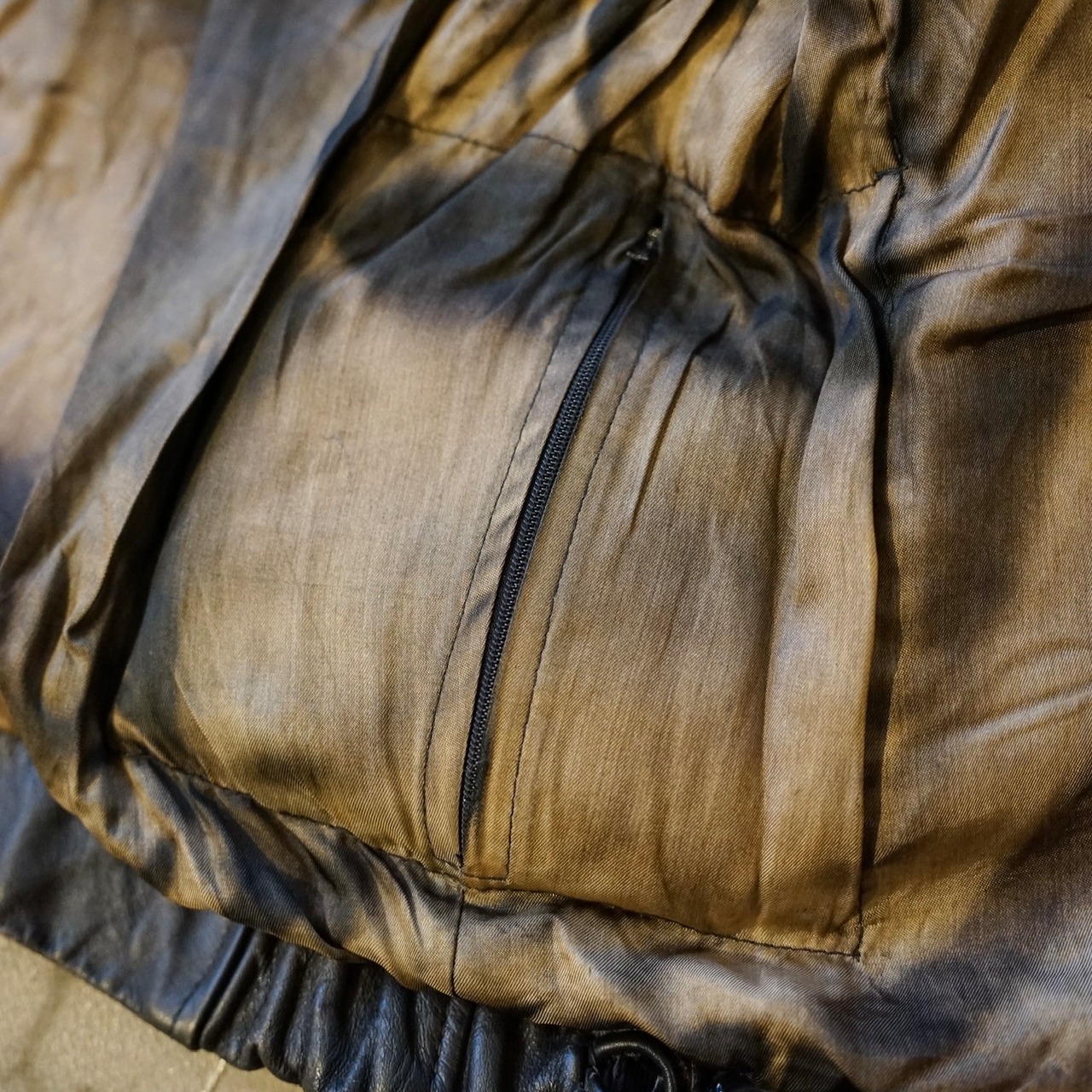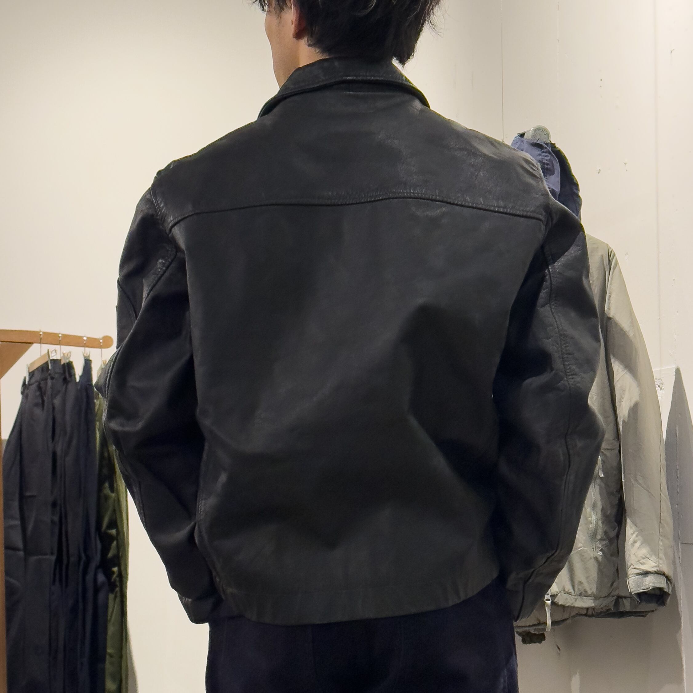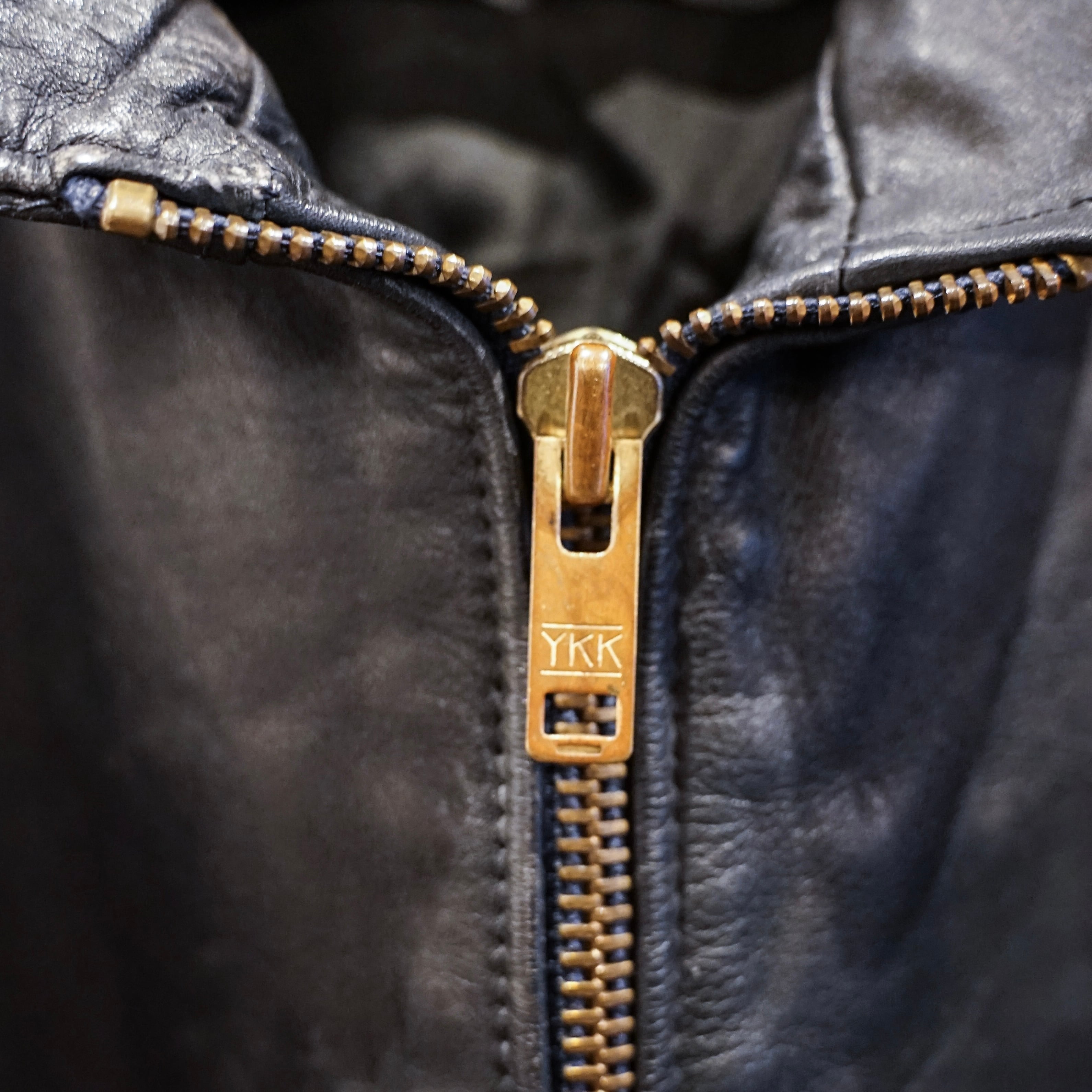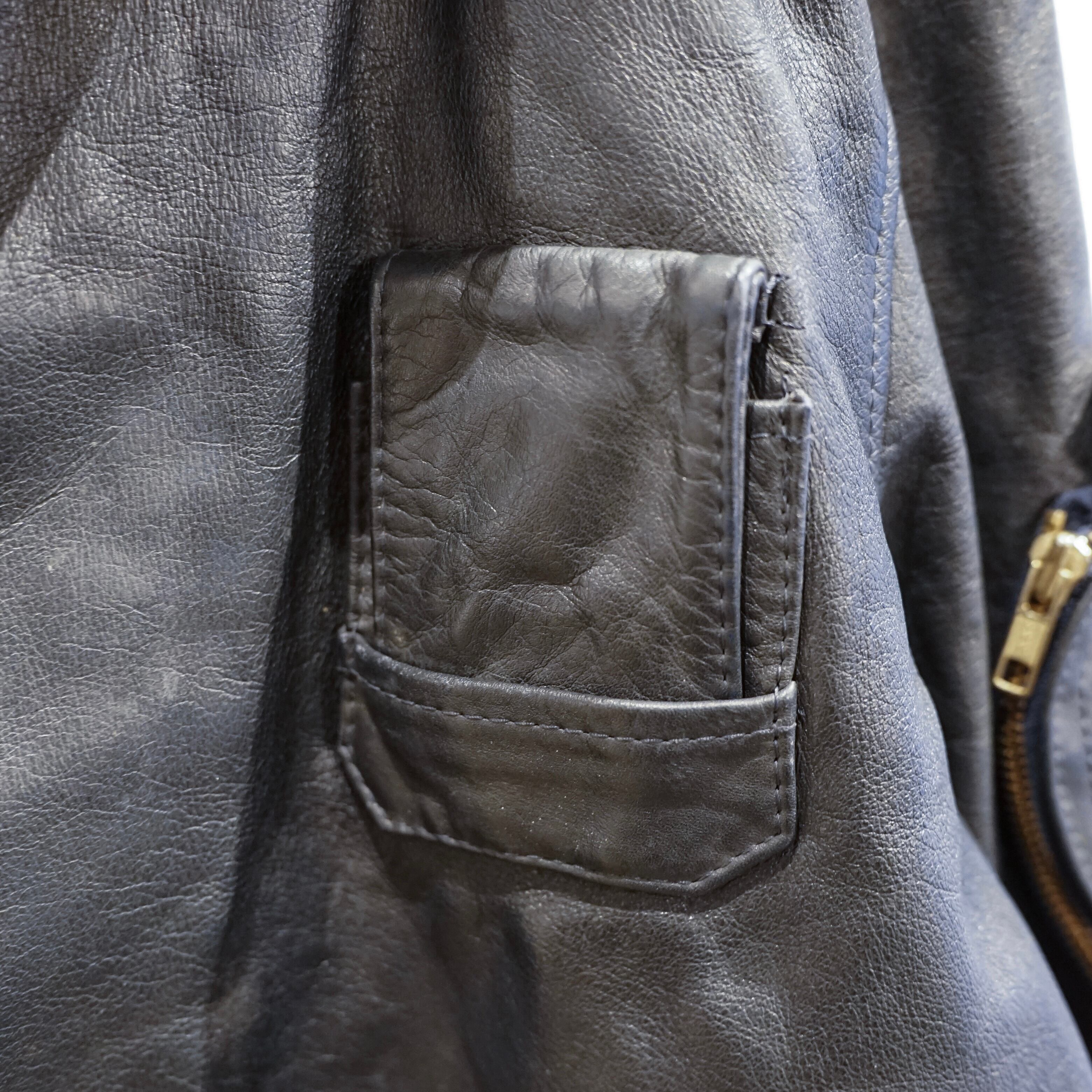 この当時のレザーは現行のファッションレザーとは異なり、耐摩耗性や防風性を最優先に考えられた実用素材で、長年の使用によって表面には独特のシワや色ムラが生じています。これらは経年劣化ではなく、実際の使用環境を反映した「使用痕」と言えます。