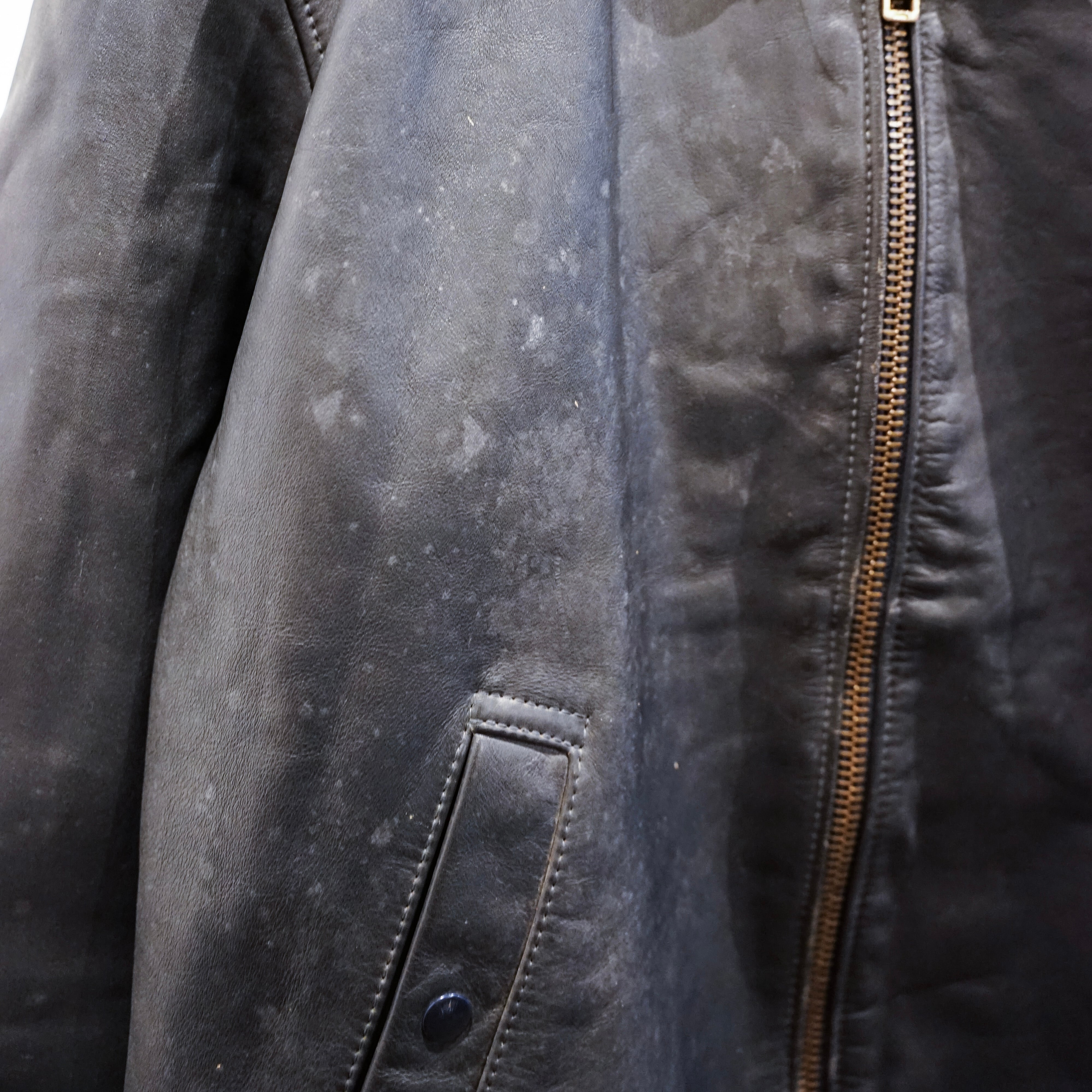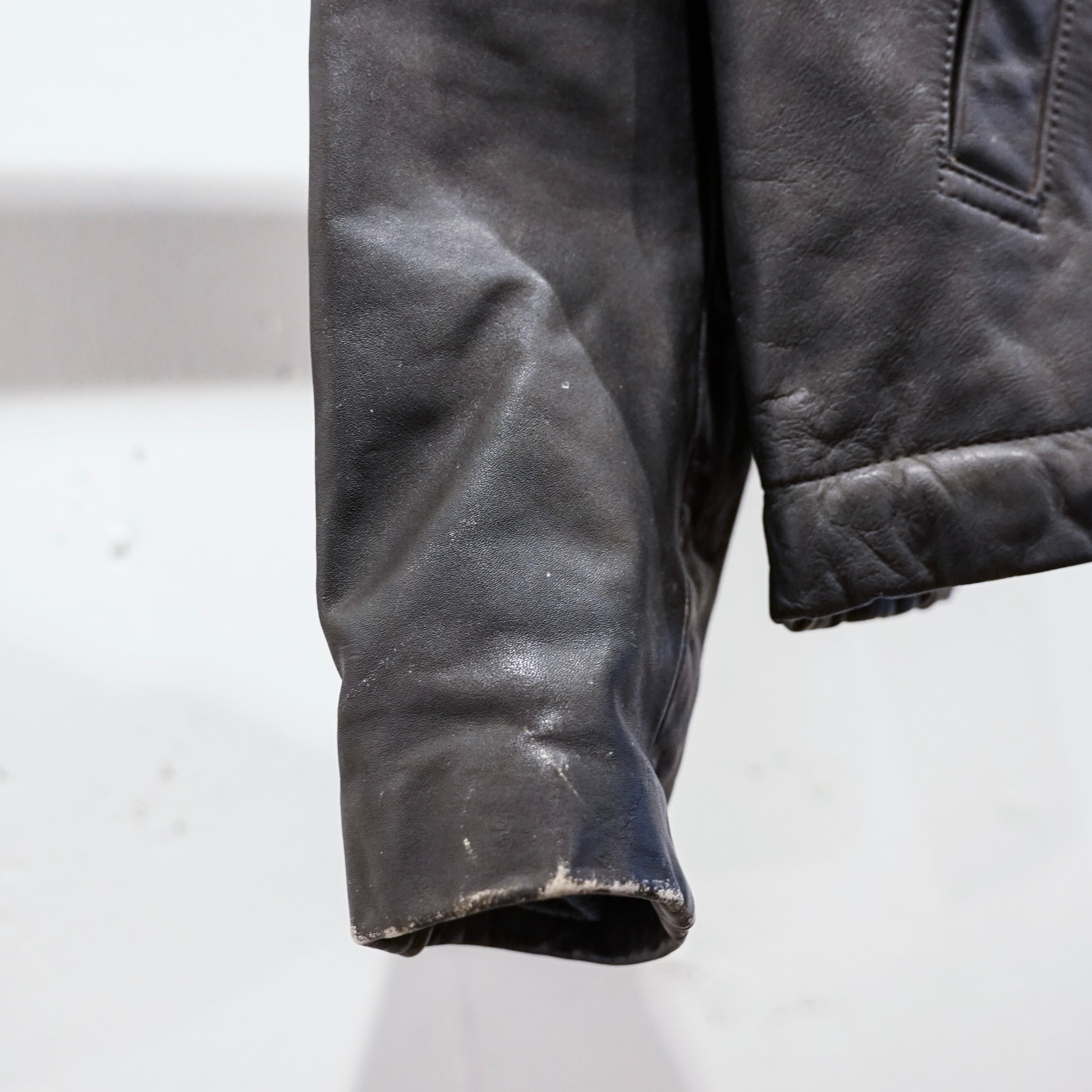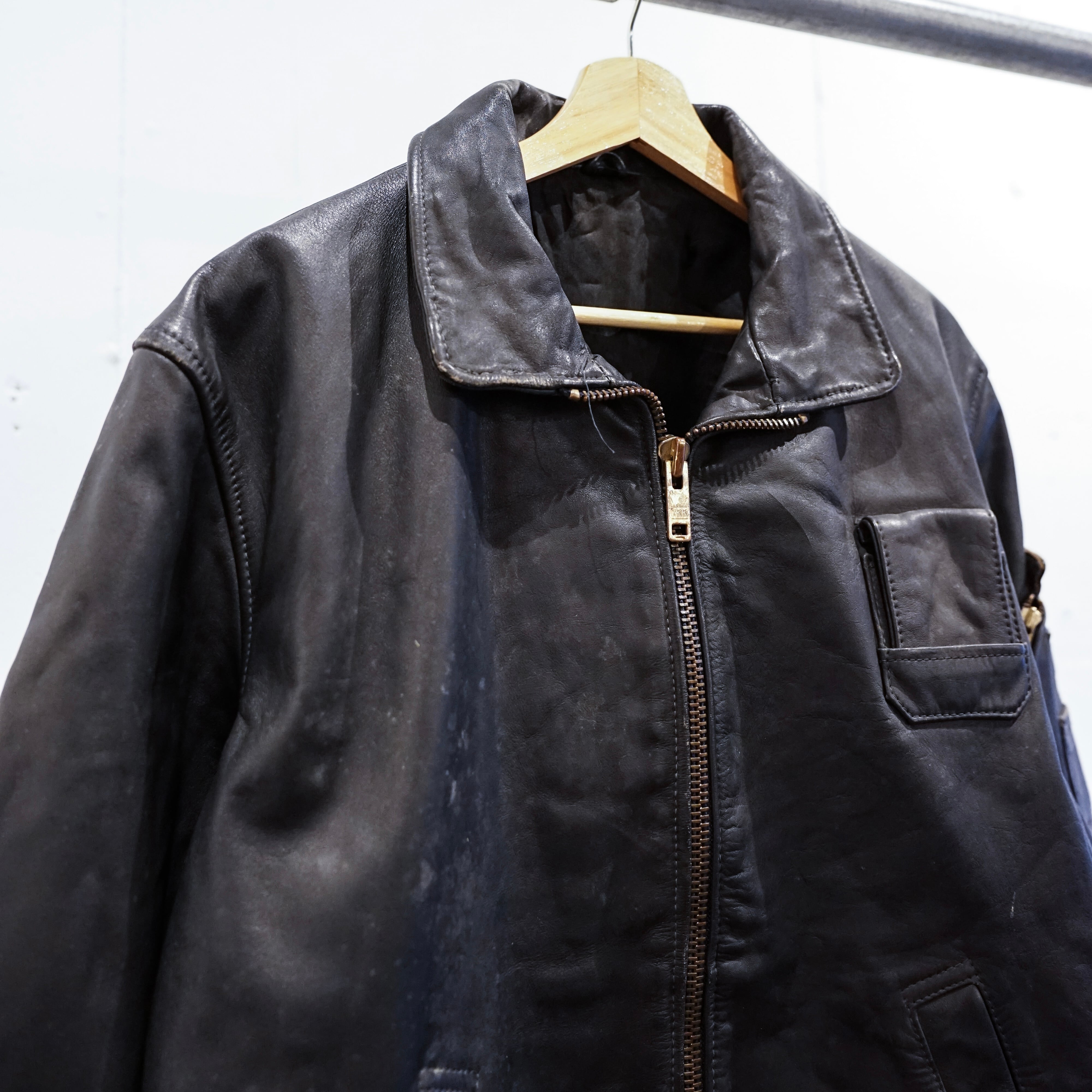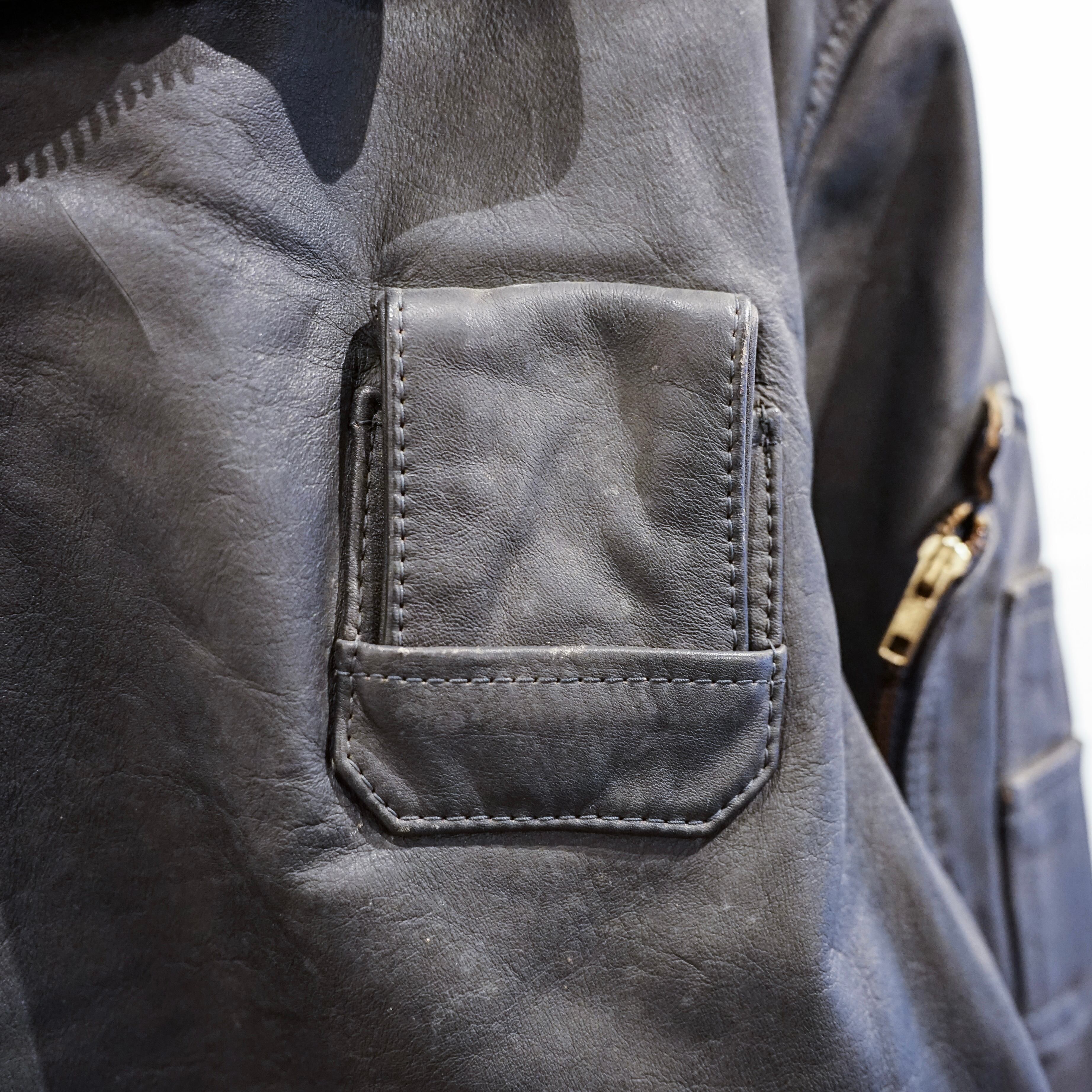 この当時のレザーは現行のファッションレザーとは異なり、耐摩耗性や防風性を最優先に考えられた実用素材で、長年の使用によって表面には独特のシワや色ムラが生じています。これらは経年劣化ではなく、実際の使用環境を反映した「使用痕」と言えます。