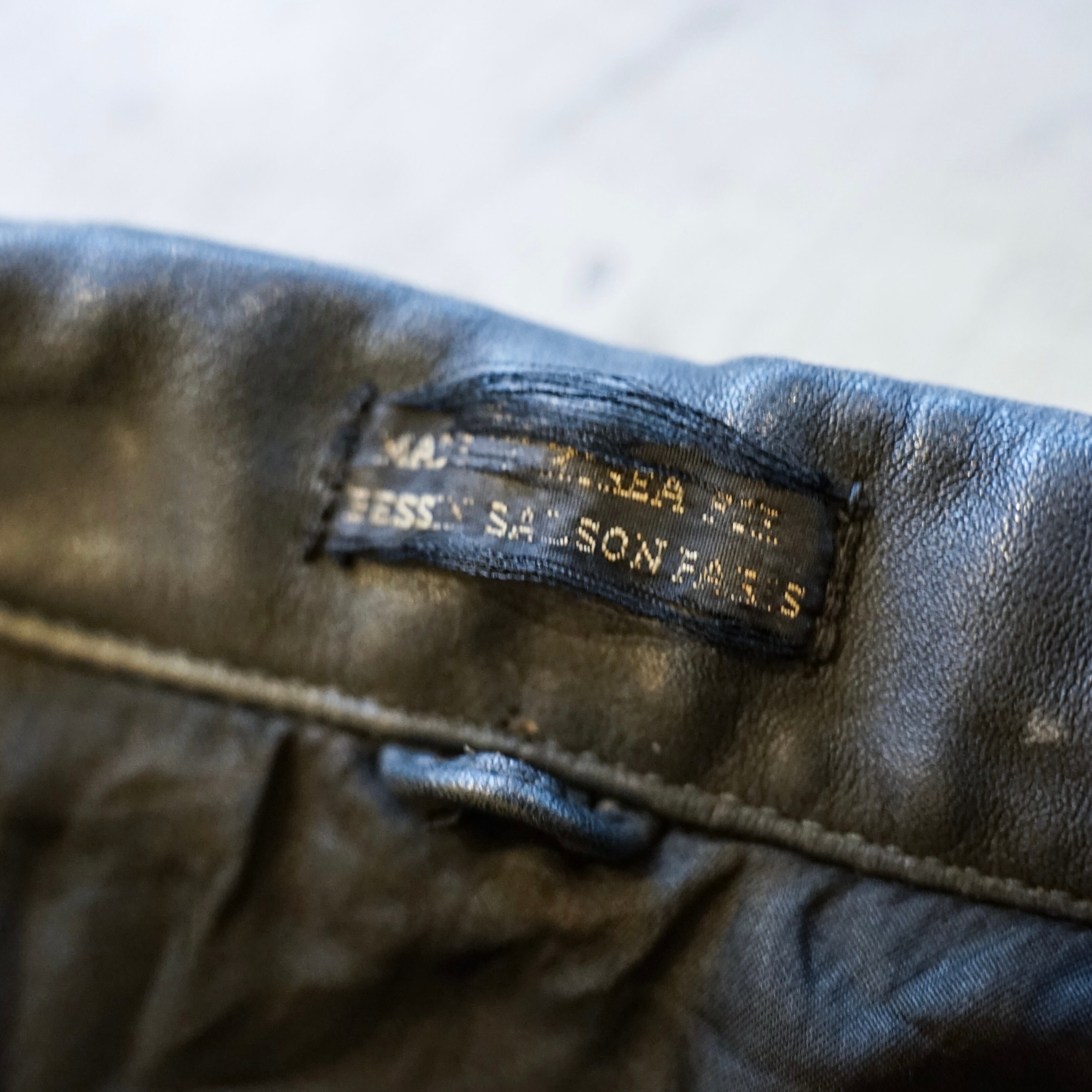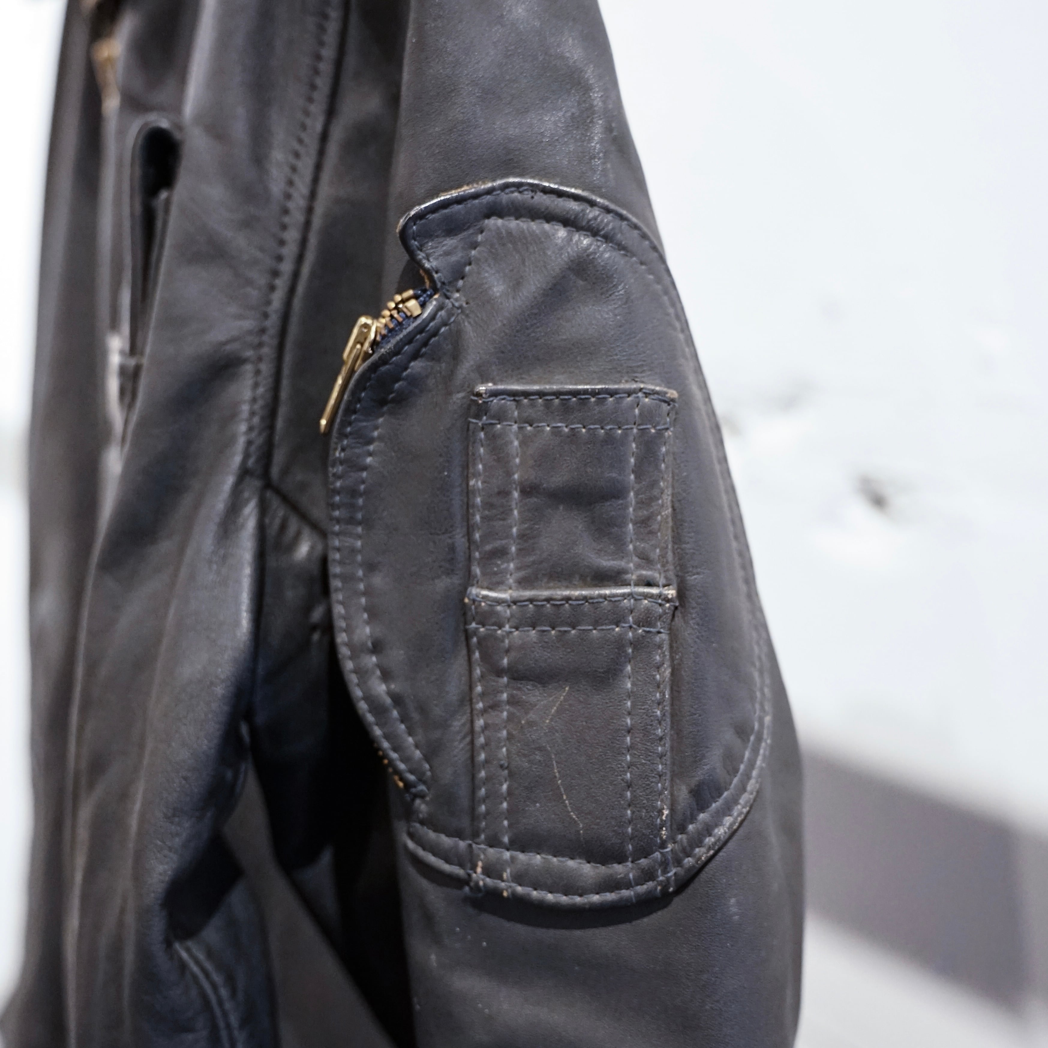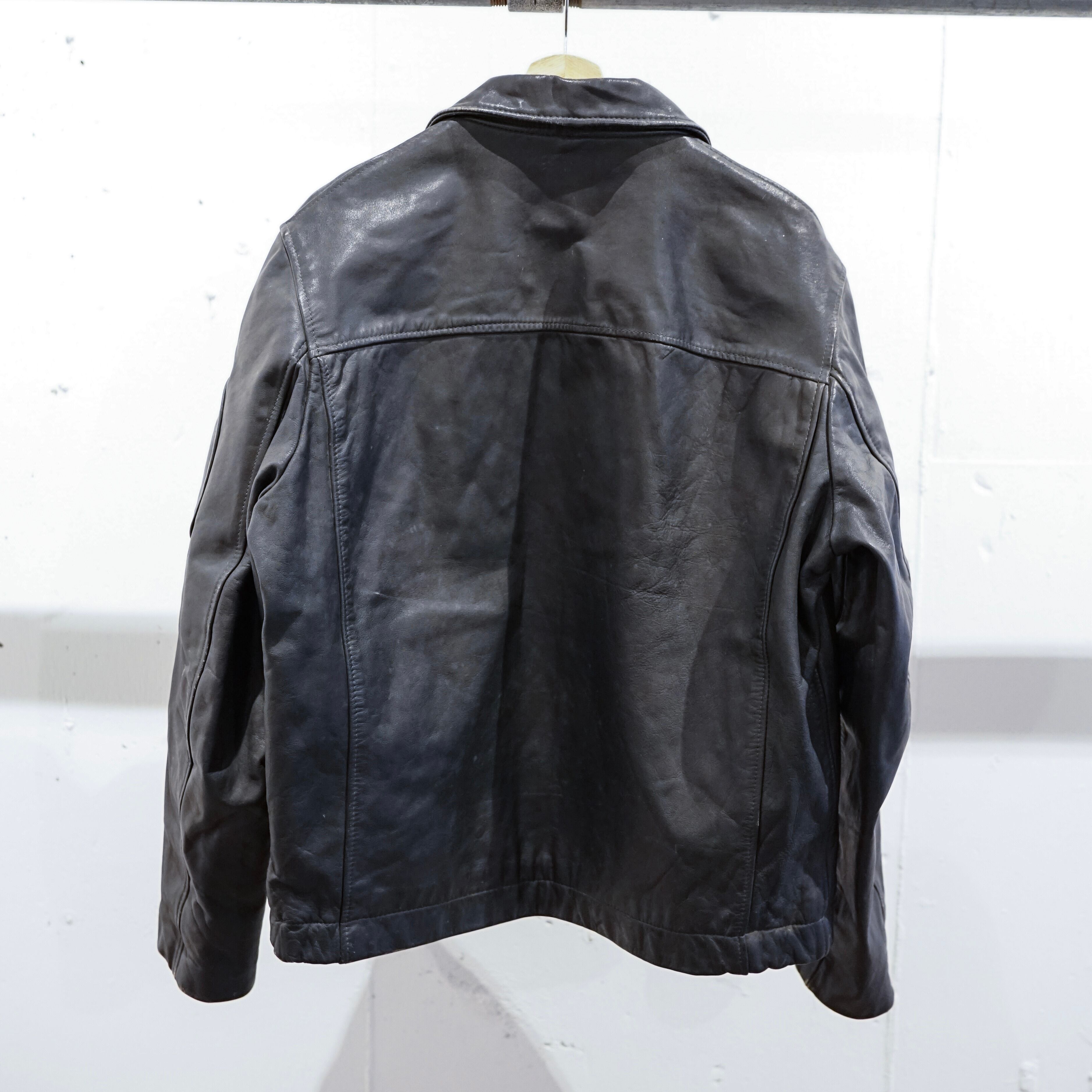 この当時のレザーは現行のファッションレザーとは異なり、耐摩耗性や防風性を最優先に考えられた実用素材で、長年の使用によって表面には独特のシワや色ムラが生じています。これらは経年劣化ではなく、実際の使用環境を反映した「使用痕」と言えます。