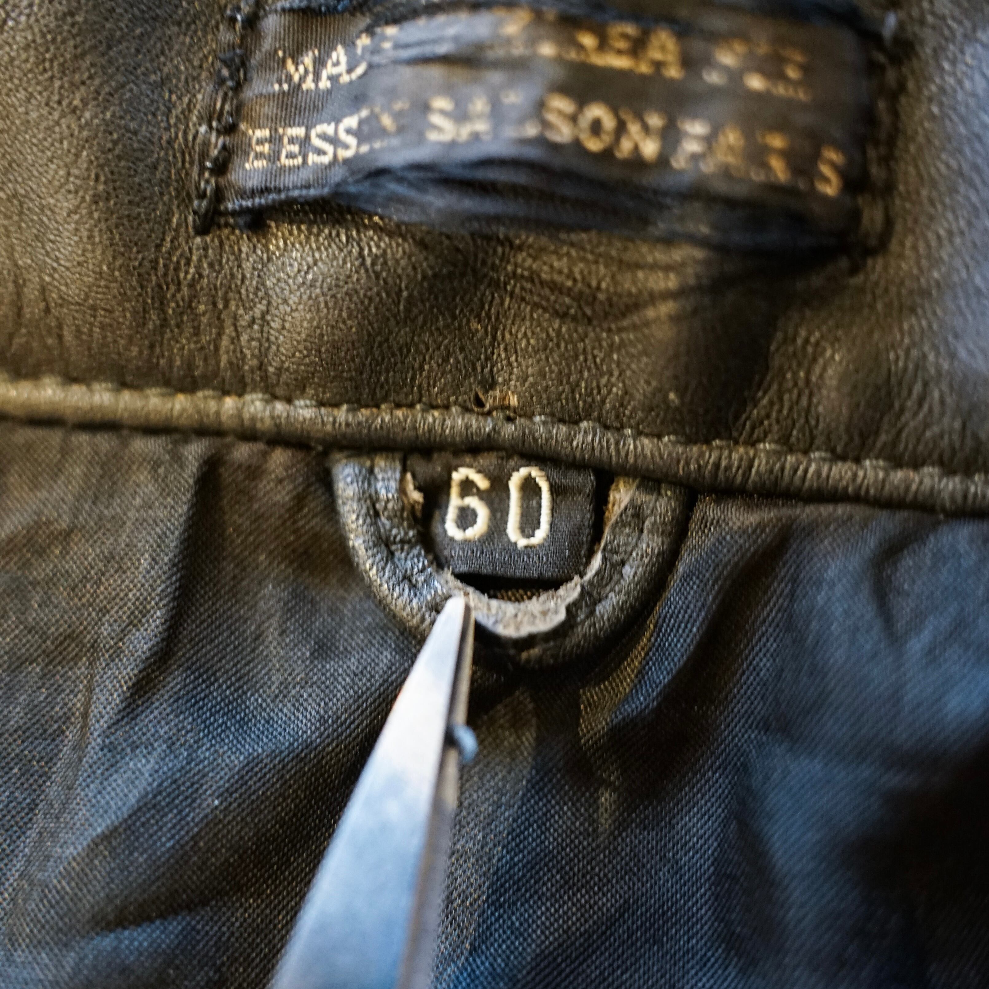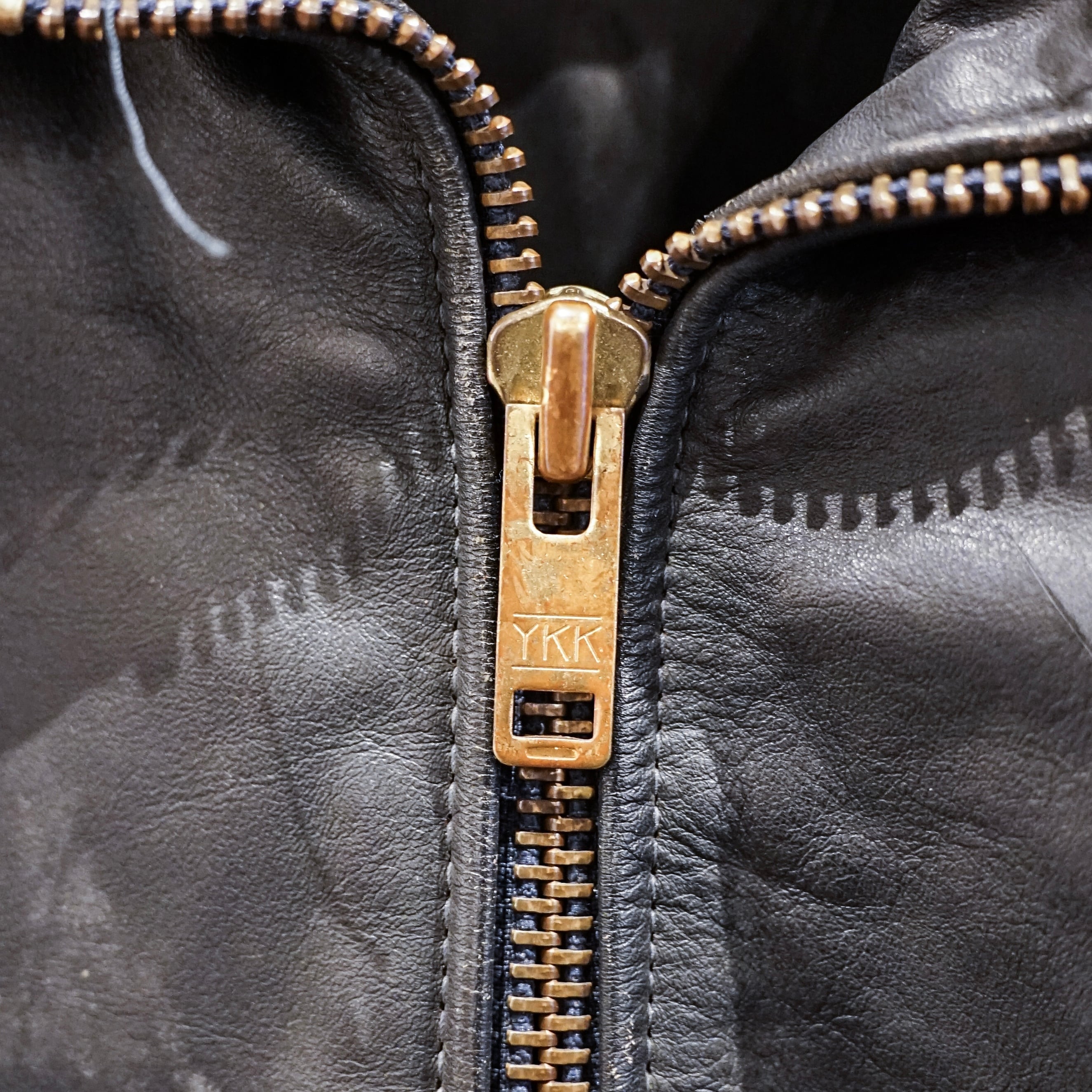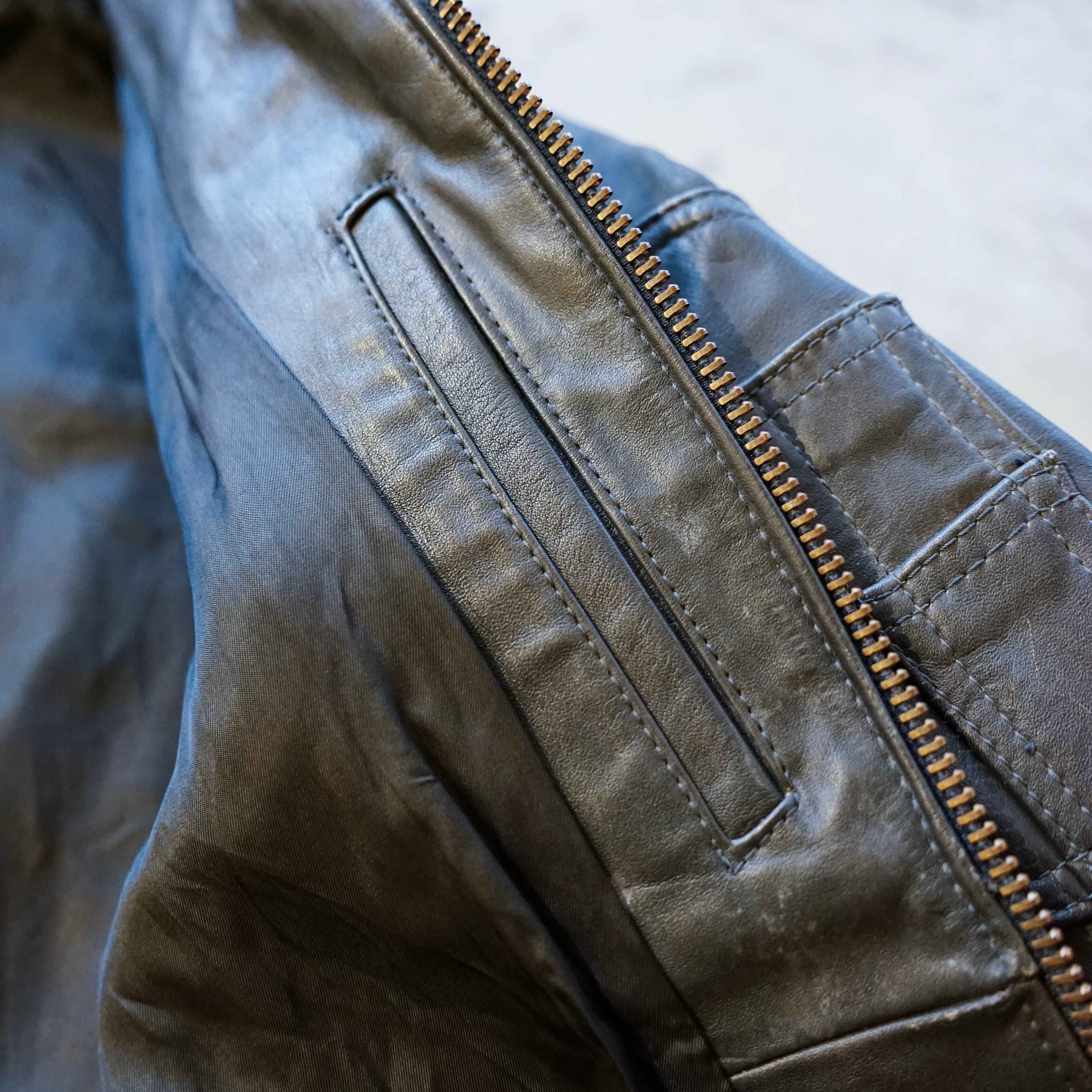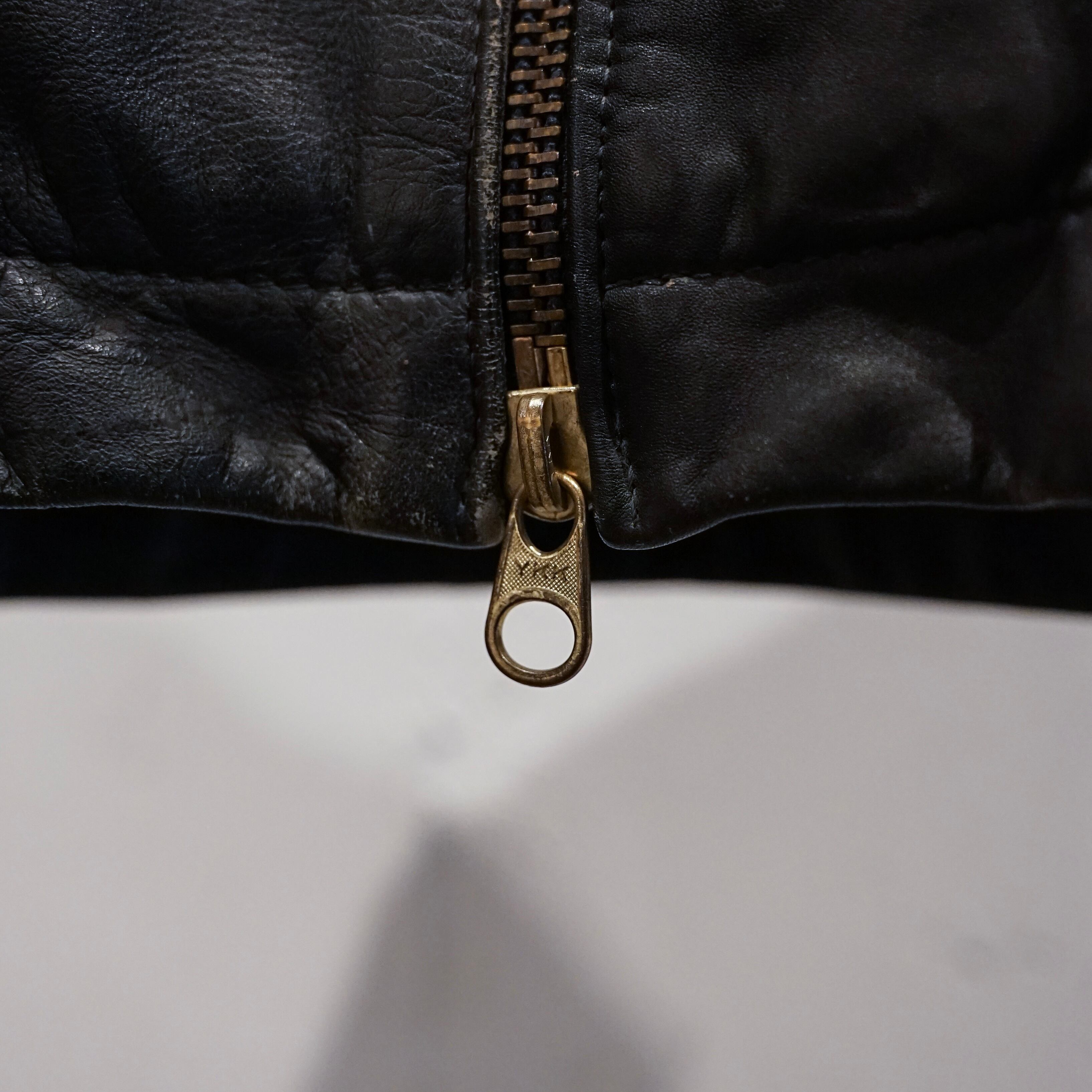 この当時のレザーは現行のファッションレザーとは異なり、耐摩耗性や防風性を最優先に考えられた実用素材で、長年の使用によって表面には独特のシワや色ムラが生じています。これらは経年劣化ではなく、実際の使用環境を反映した「使用痕」と言えます。