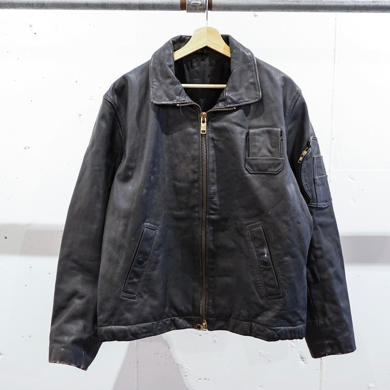 1970年代という時代は、レザー製フライトジャケットが徐々に化繊素材へ移行していく過渡期でもあり、本品は「実用装備としてのレザーフライトジャケット」がまだ主流だった最後期に近い存在。