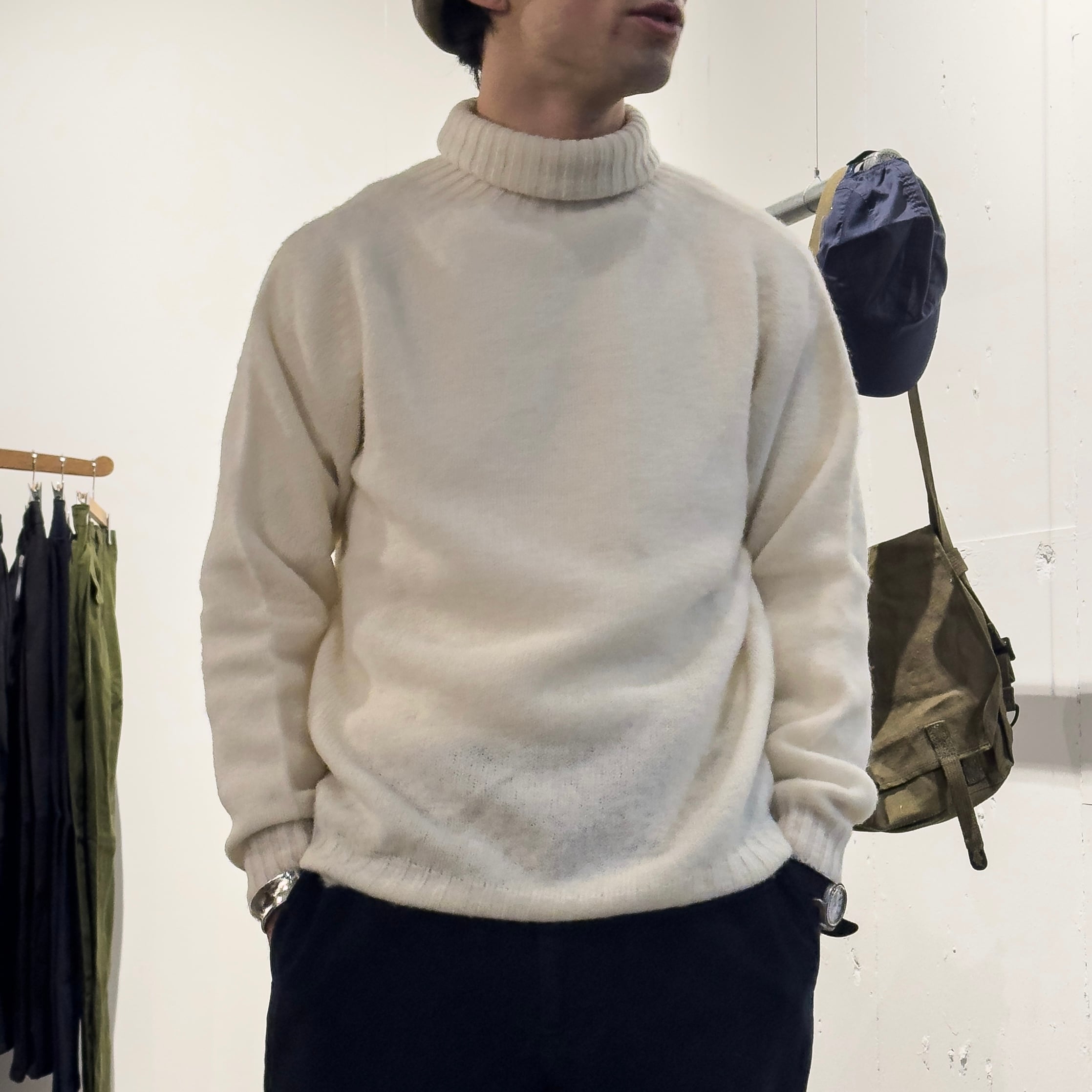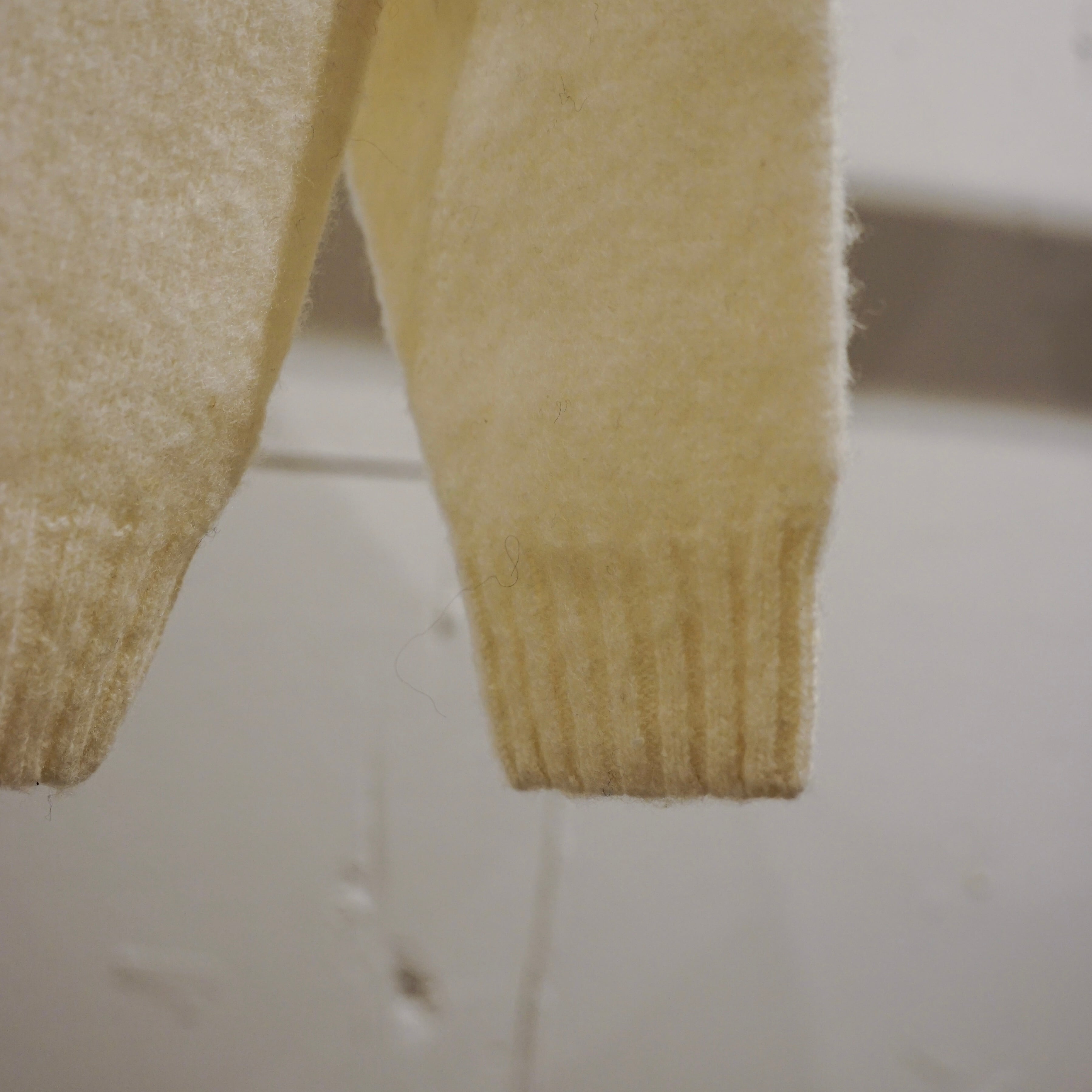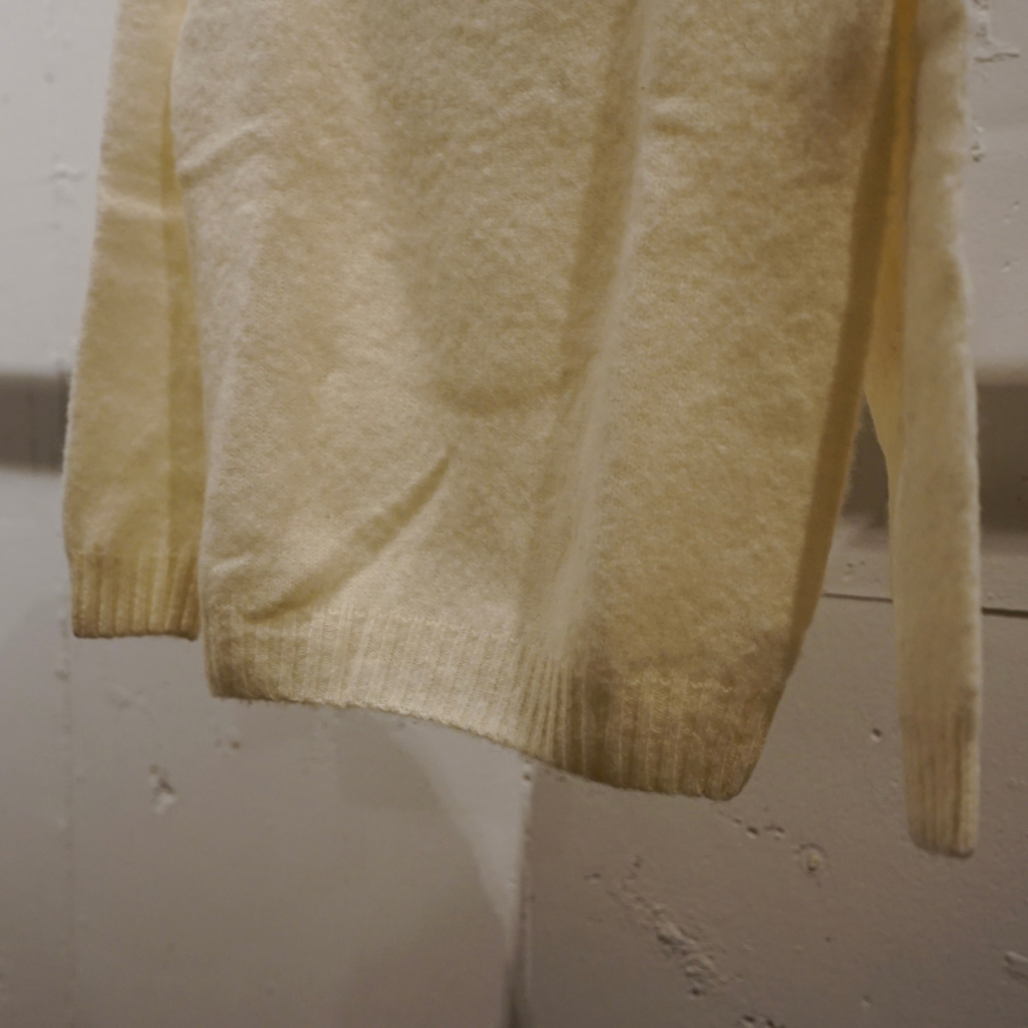 通常のシェットランドニットと比べ、編み上げ後に強めの起毛加工を施すことで、モヘヤと見紛うほどの長い毛足と嵩高感を持たせております。