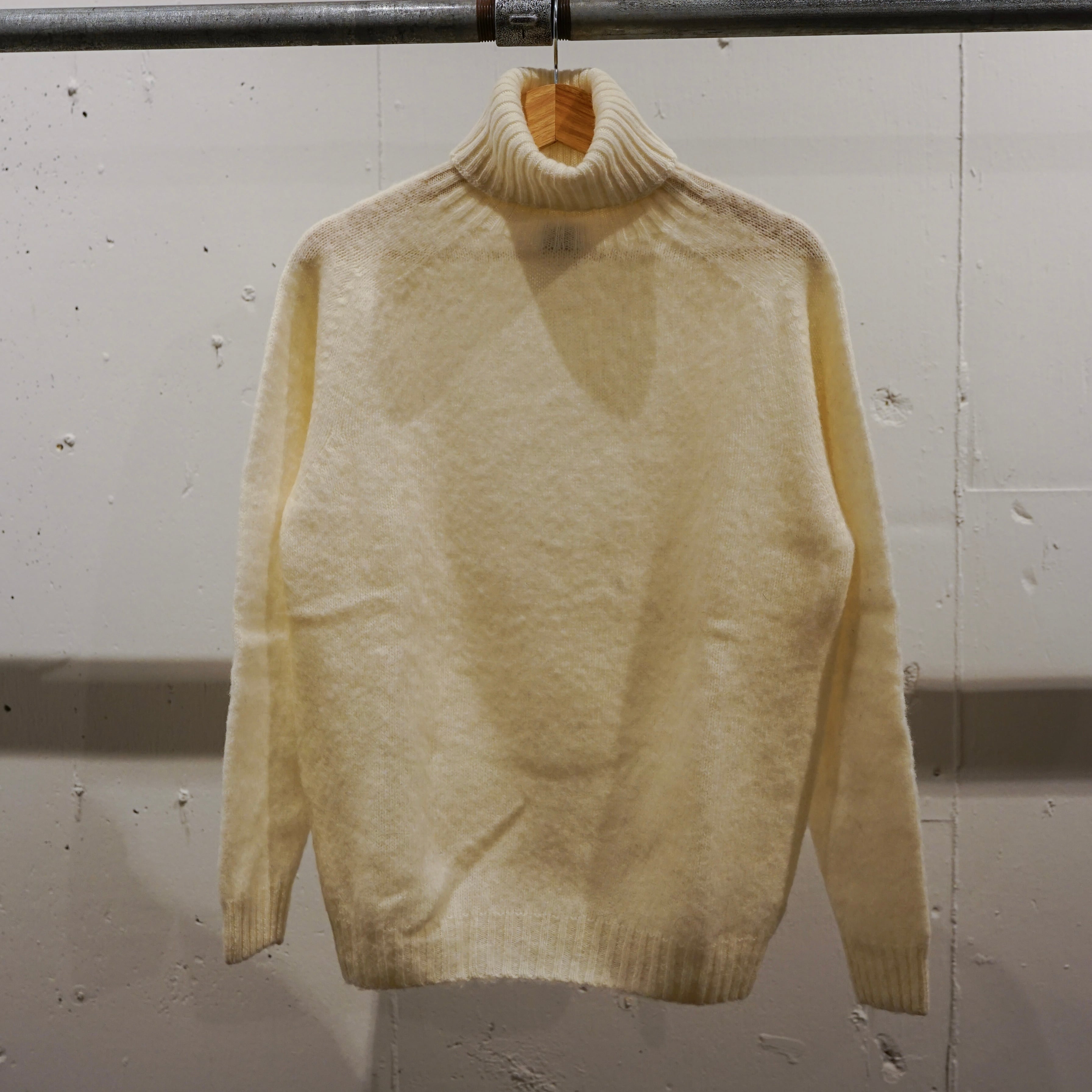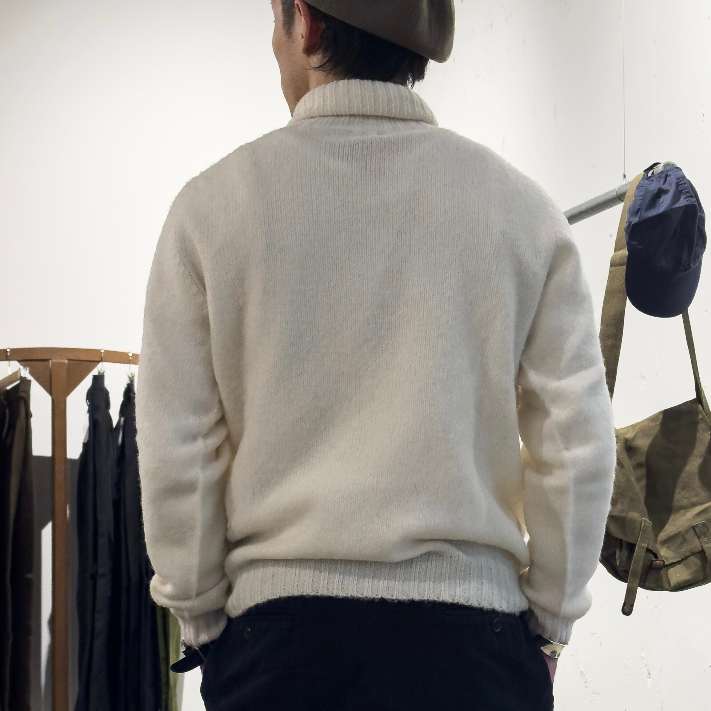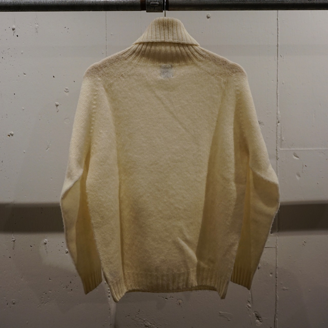 通常のシェットランドニットと比べ、編み上げ後に強めの起毛加工を施すことで、モヘヤと見紛うほどの長い毛足と嵩高感を持たせております。