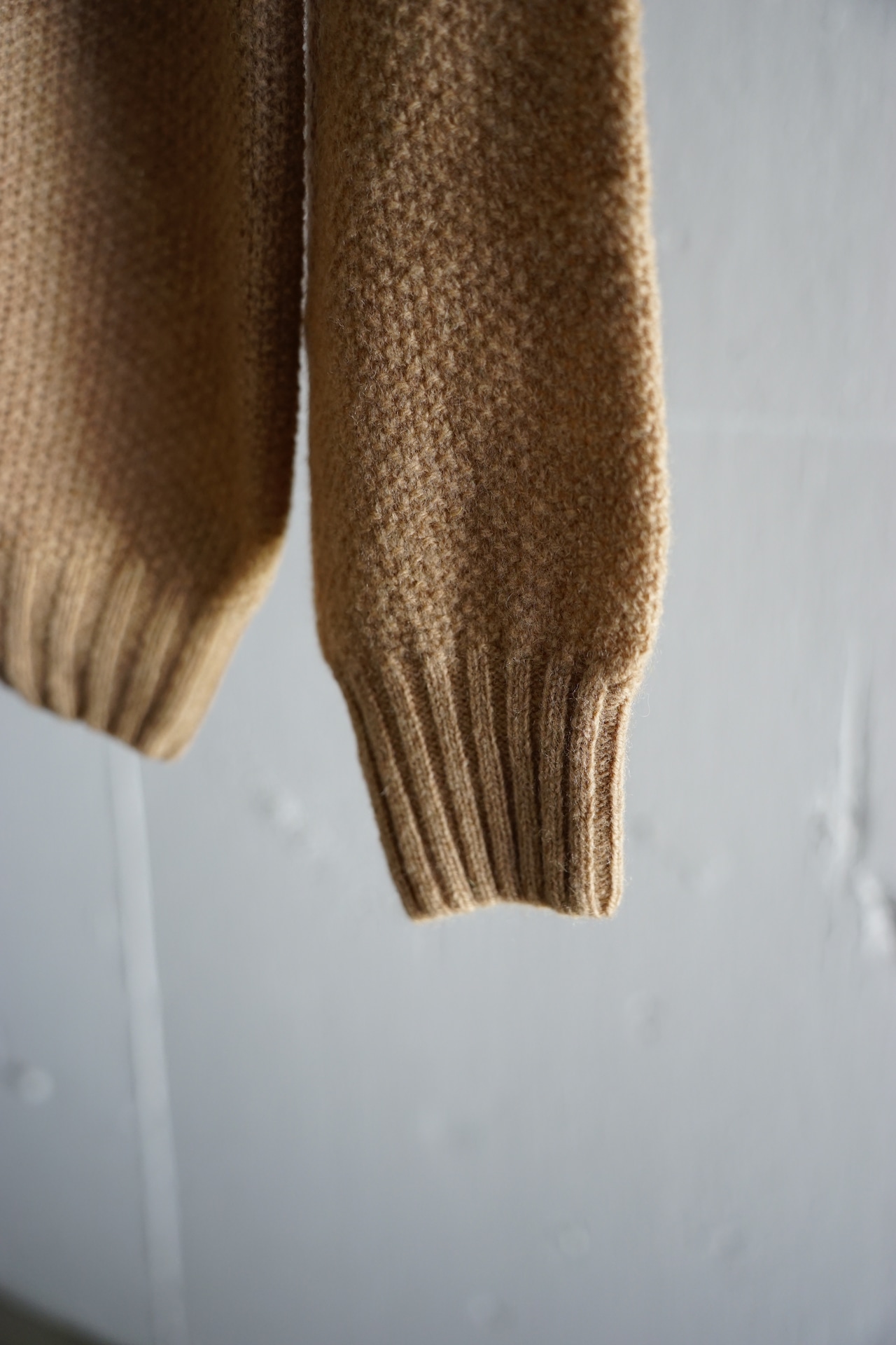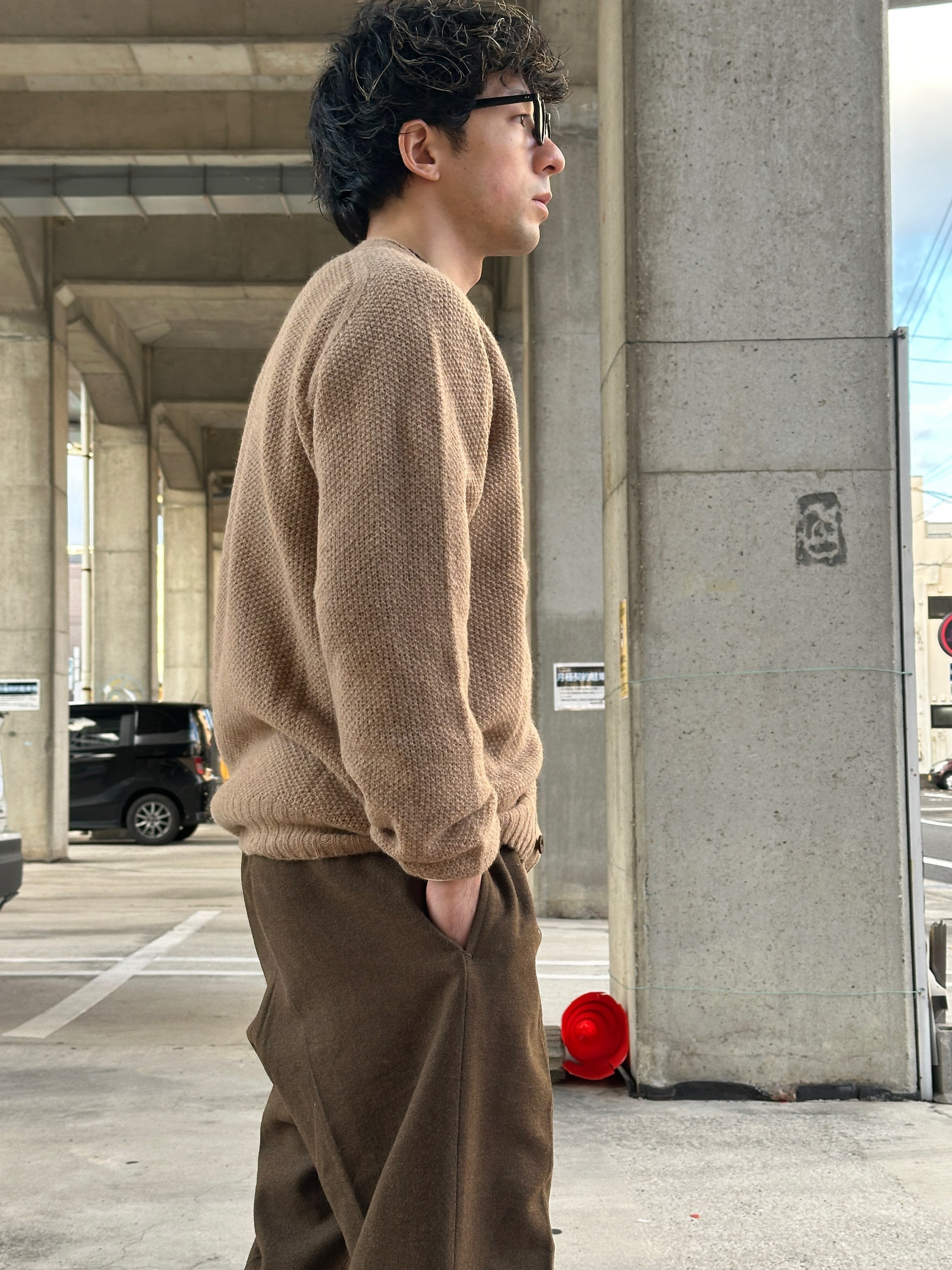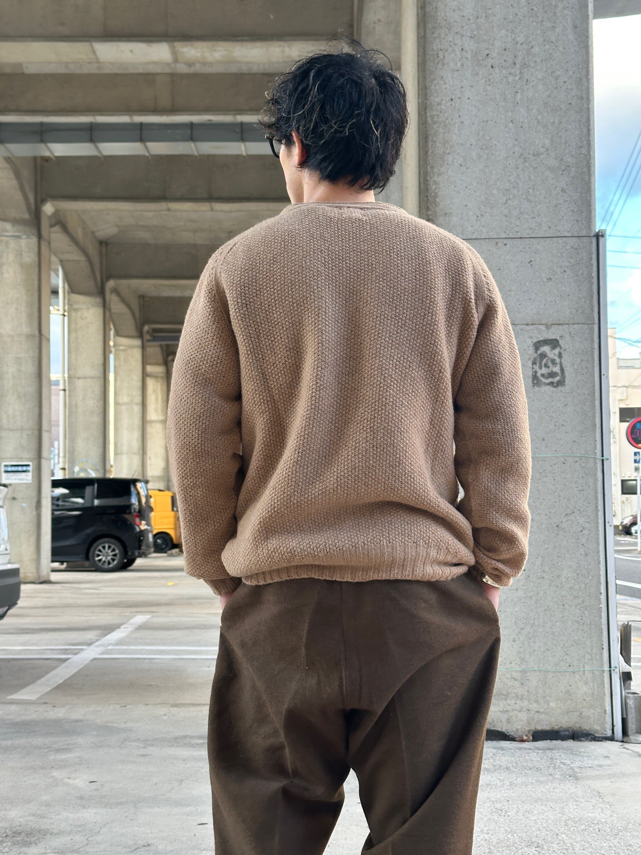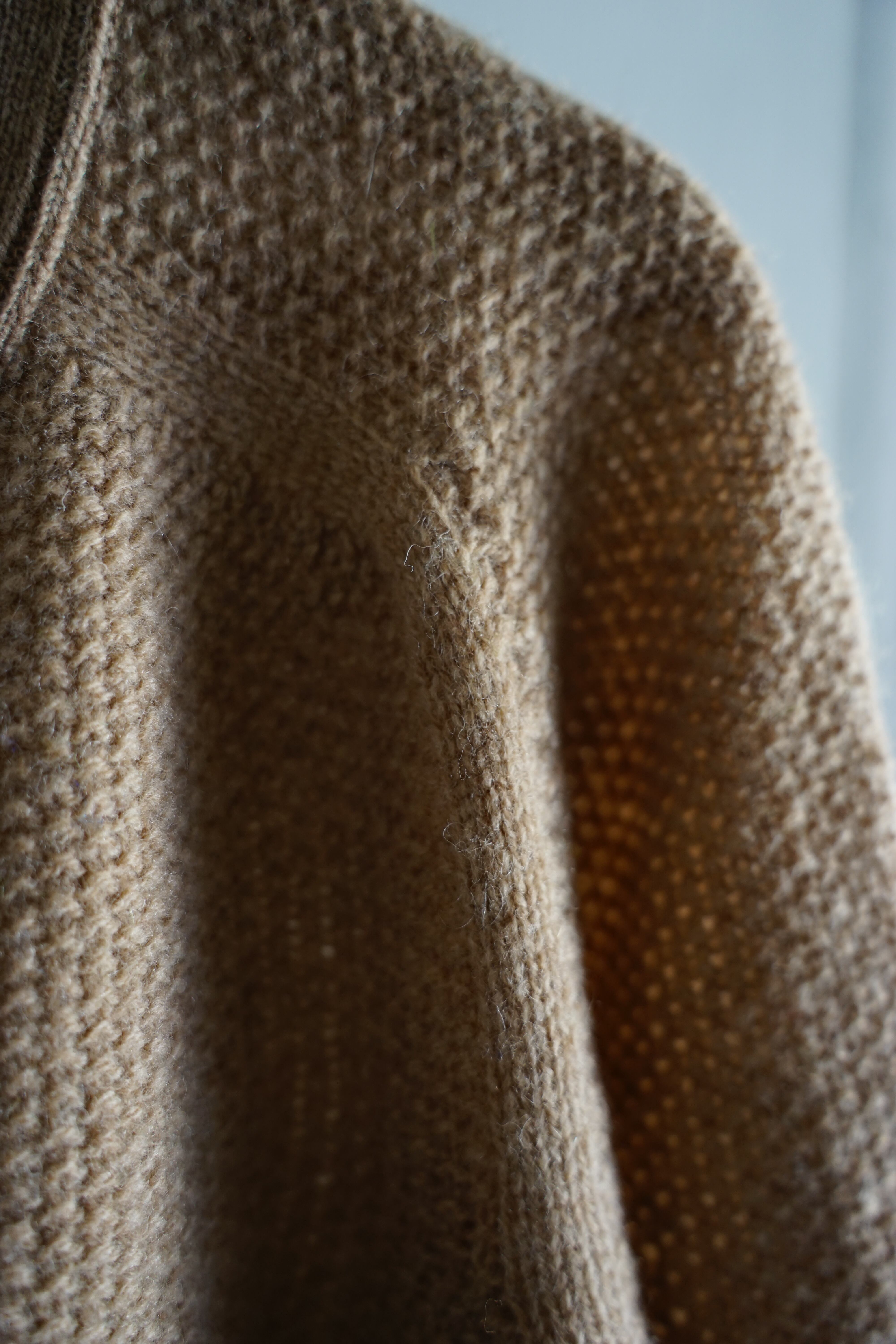 通常のシェットランドニットと比べ、編み上げ後に強めの起毛加工を施すことで、嵩高感を持たせております。