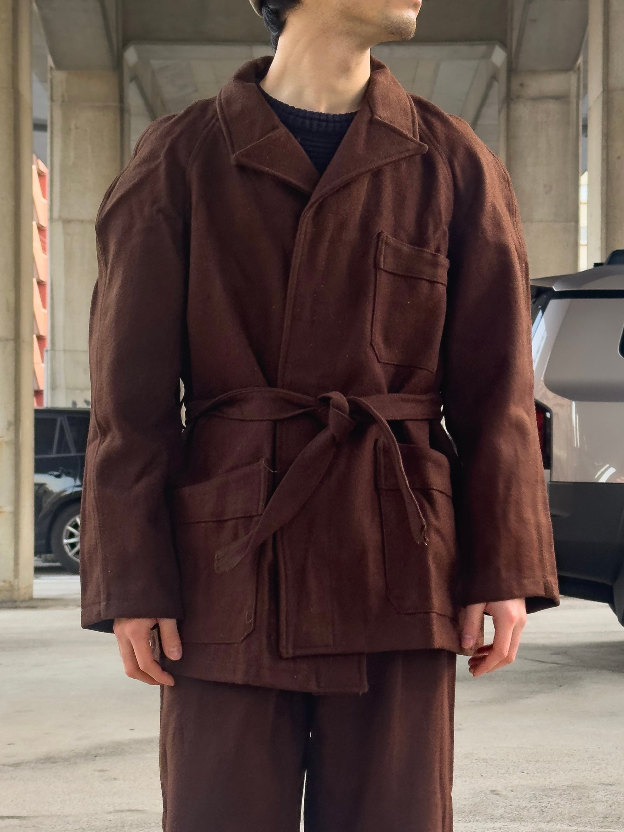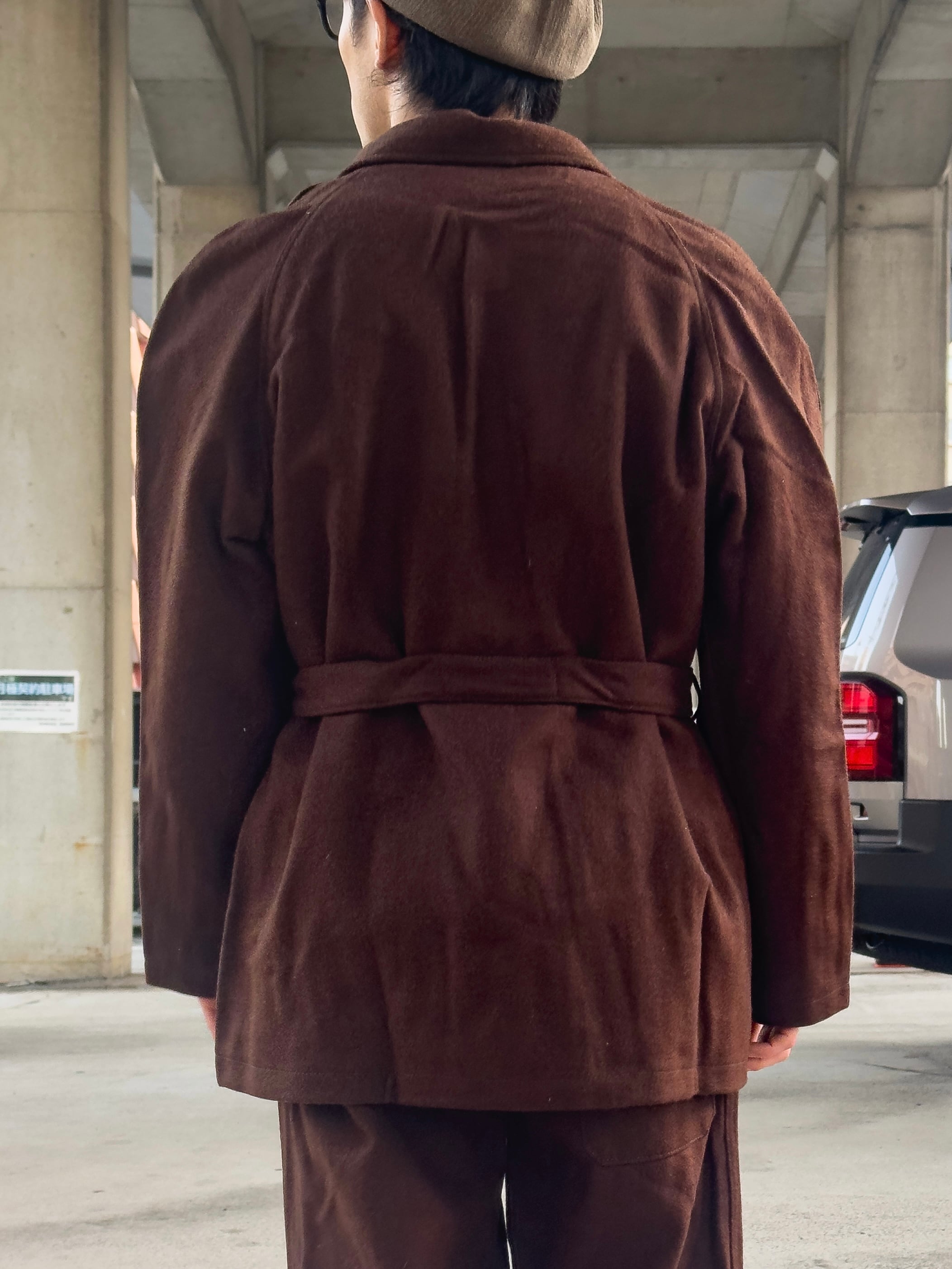 軍属の医師や医療スタッフが院内で着用することを想定し、機能性と作業性を重視した設計が特徴の一着。
