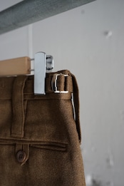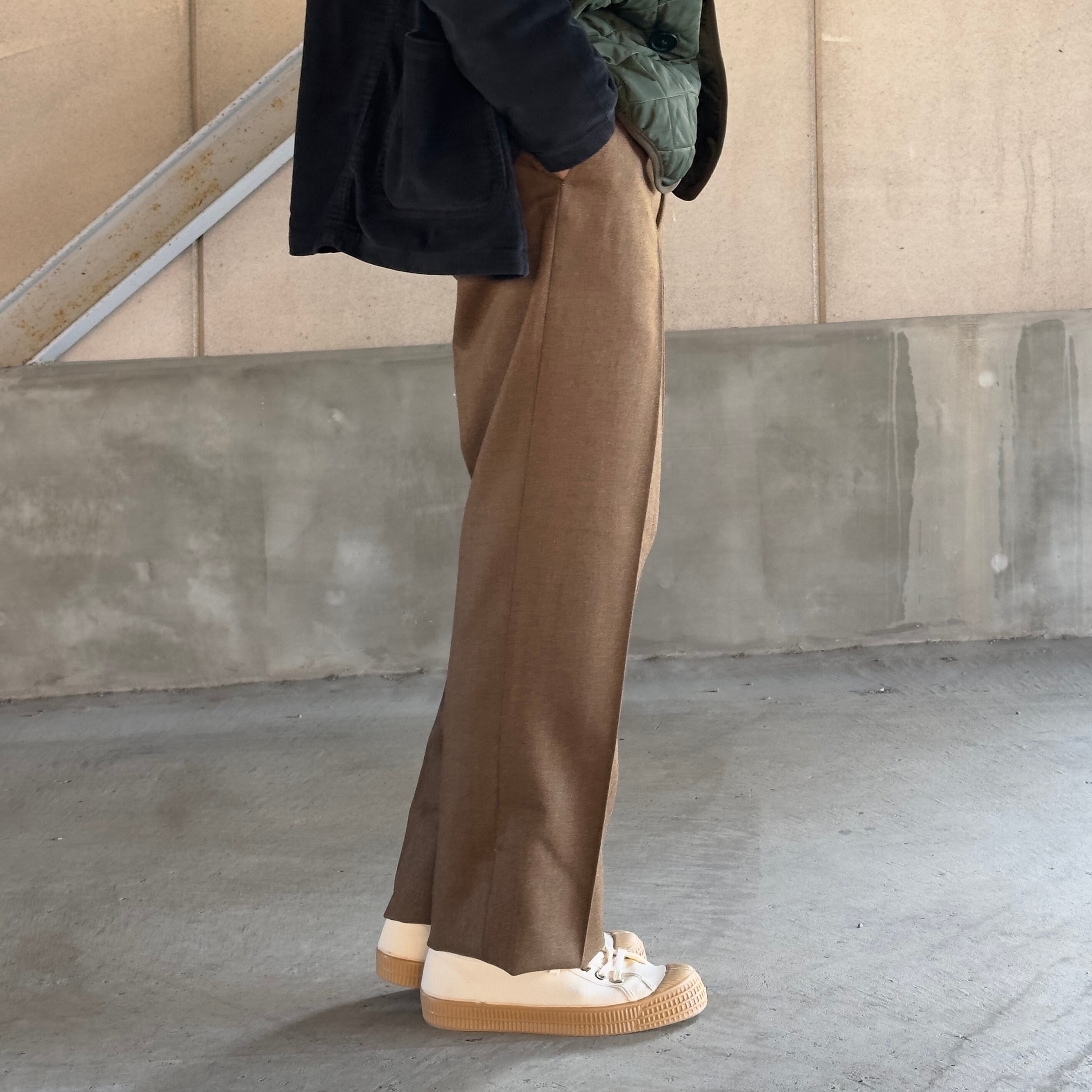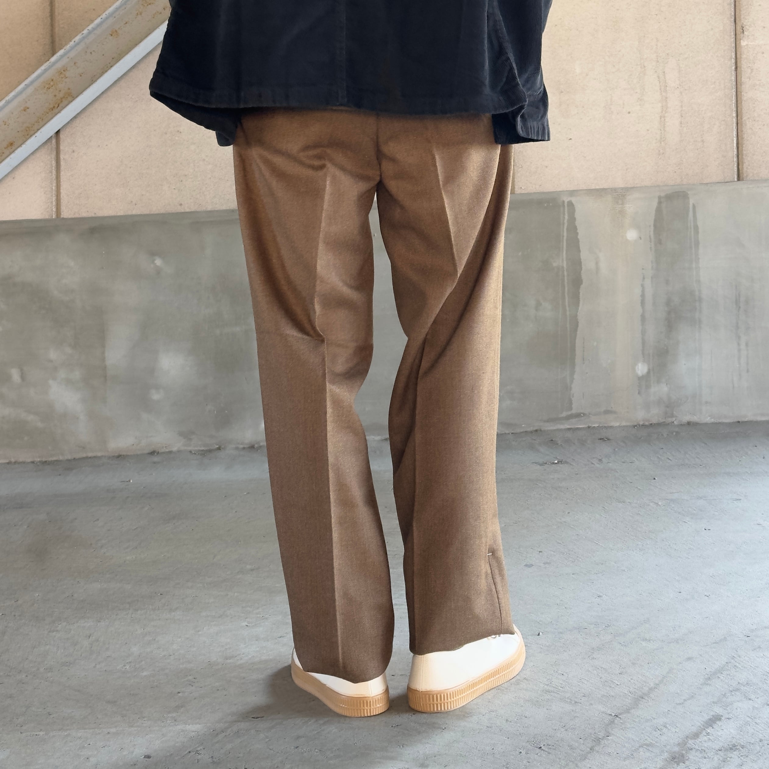 腰回りにやや分量を持たせつつ、センタークリースが美しく落ちる設計で、立ち姿・歩行時ともに端正なシルエットを保ちます。