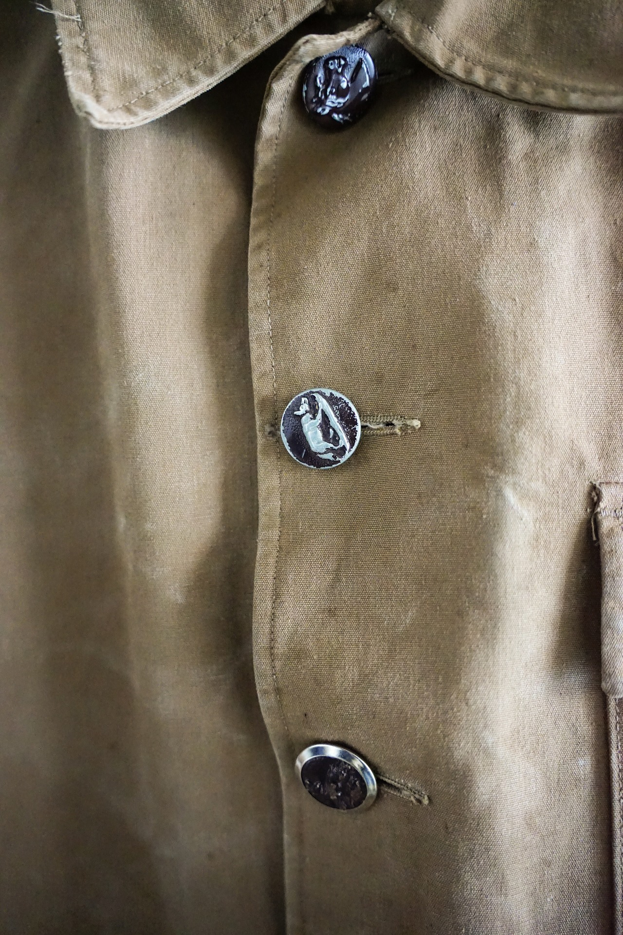 フロントやポケットに配された動物ボタンは、当時のハンティング用途を色濃く反映したディテールであり、実用品でありながらもフランスらしい美意識を感じさせます。
