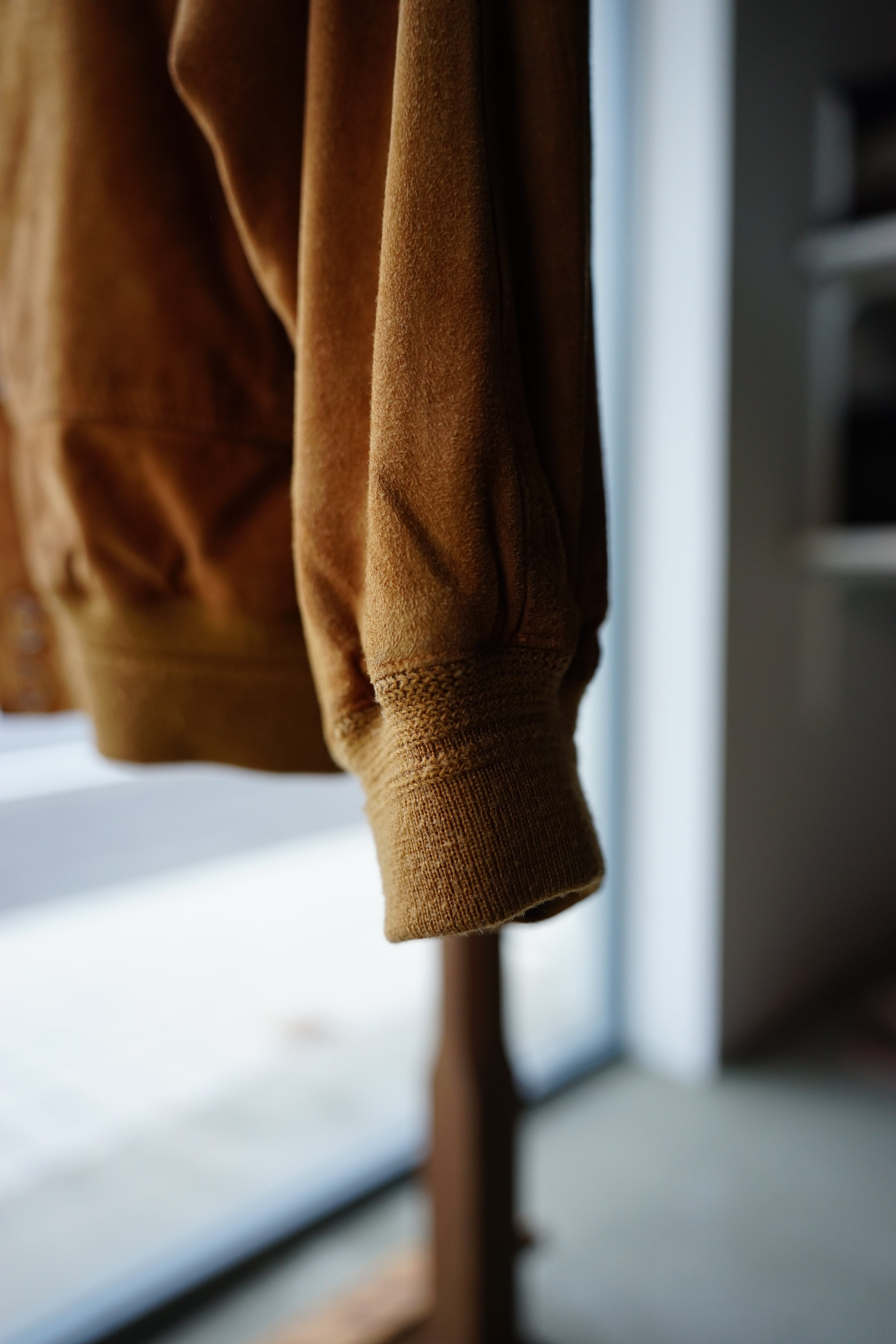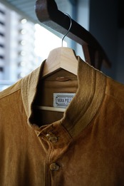 起毛した表情と柔らかな質感が特徴で、着用を重ねることで色味や毛並みに変化が生まれ、革ならではの経年変化を楽しめます。
