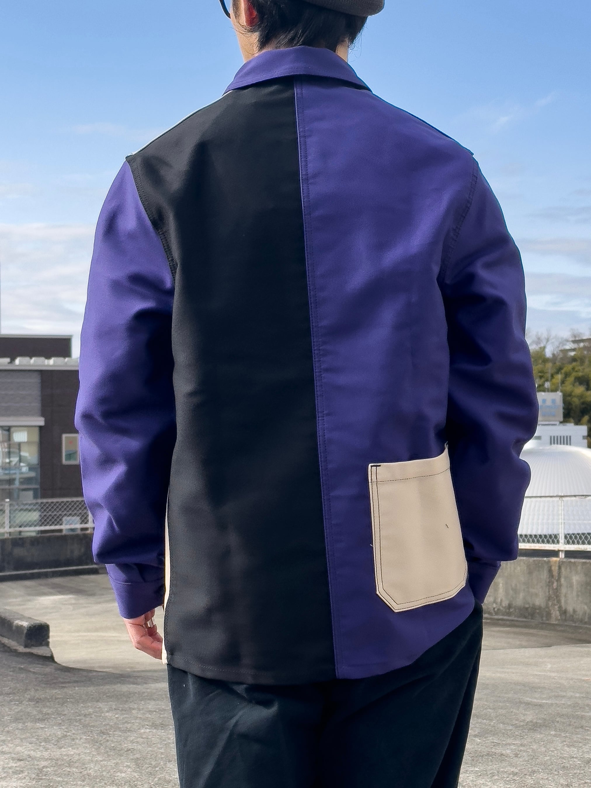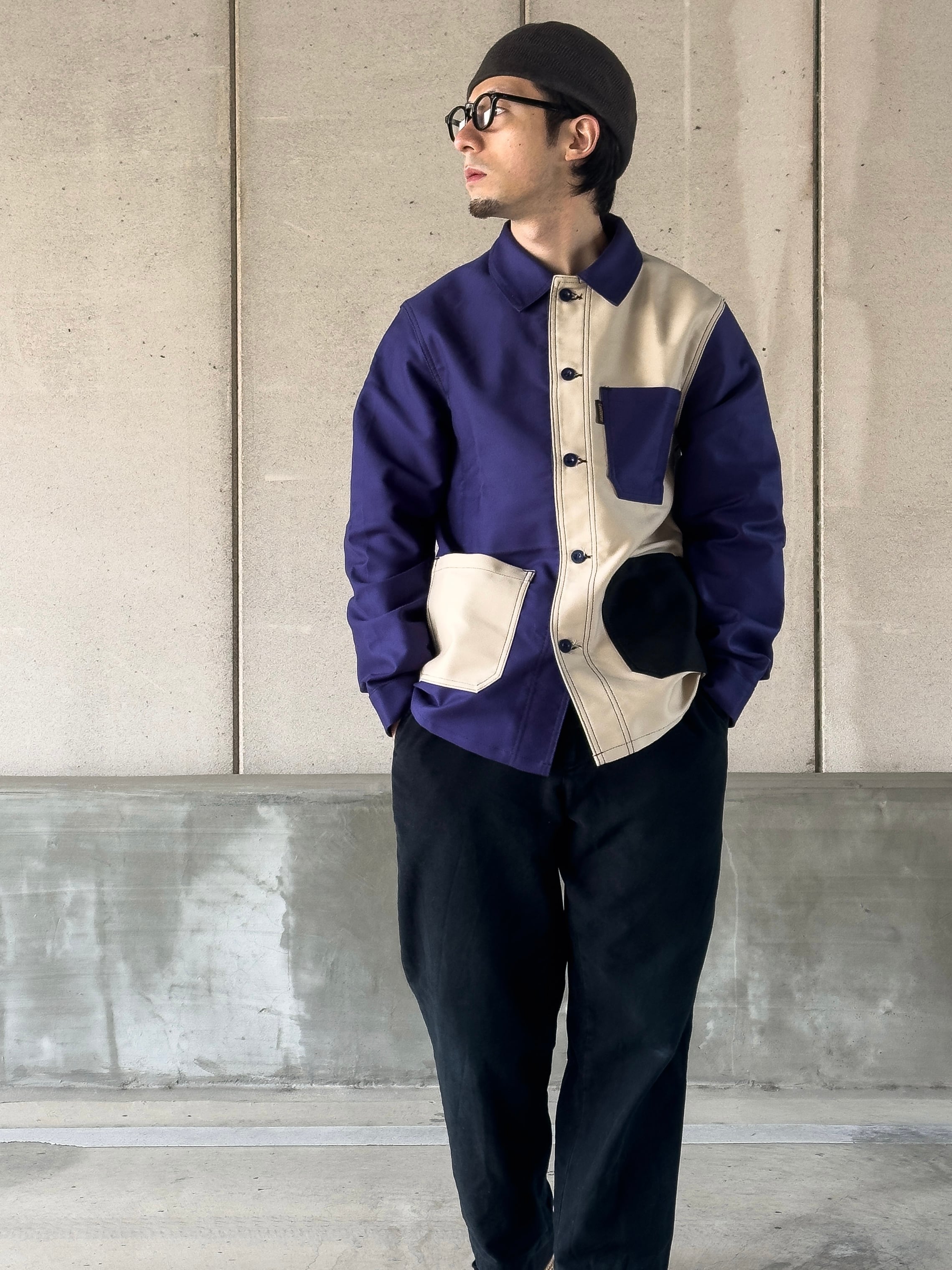 左右非対称のカラーブロッキングでありながら、ワークウェアとしての実用性やバランスは一切崩していない点も、このコラボならではの完成度です。
