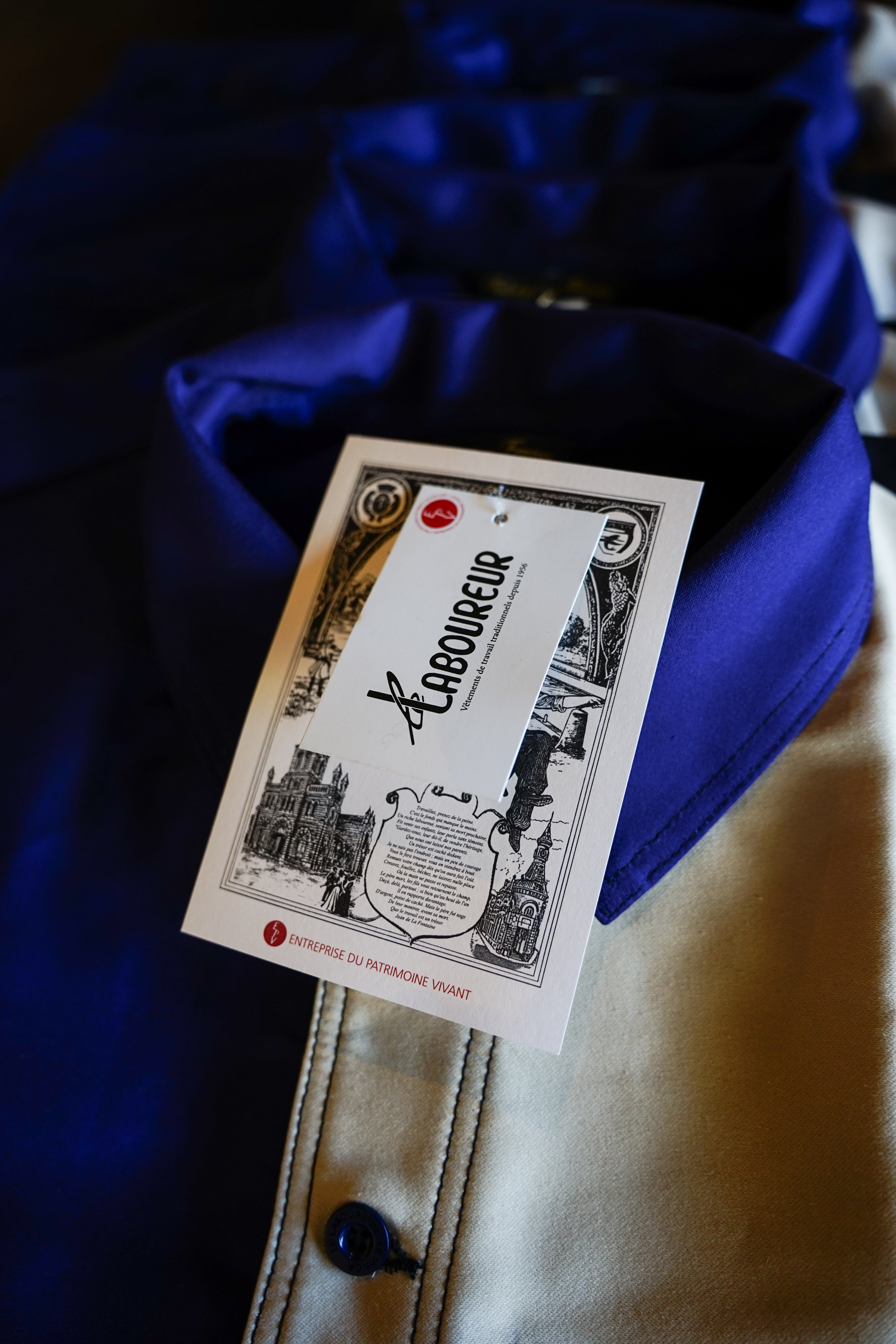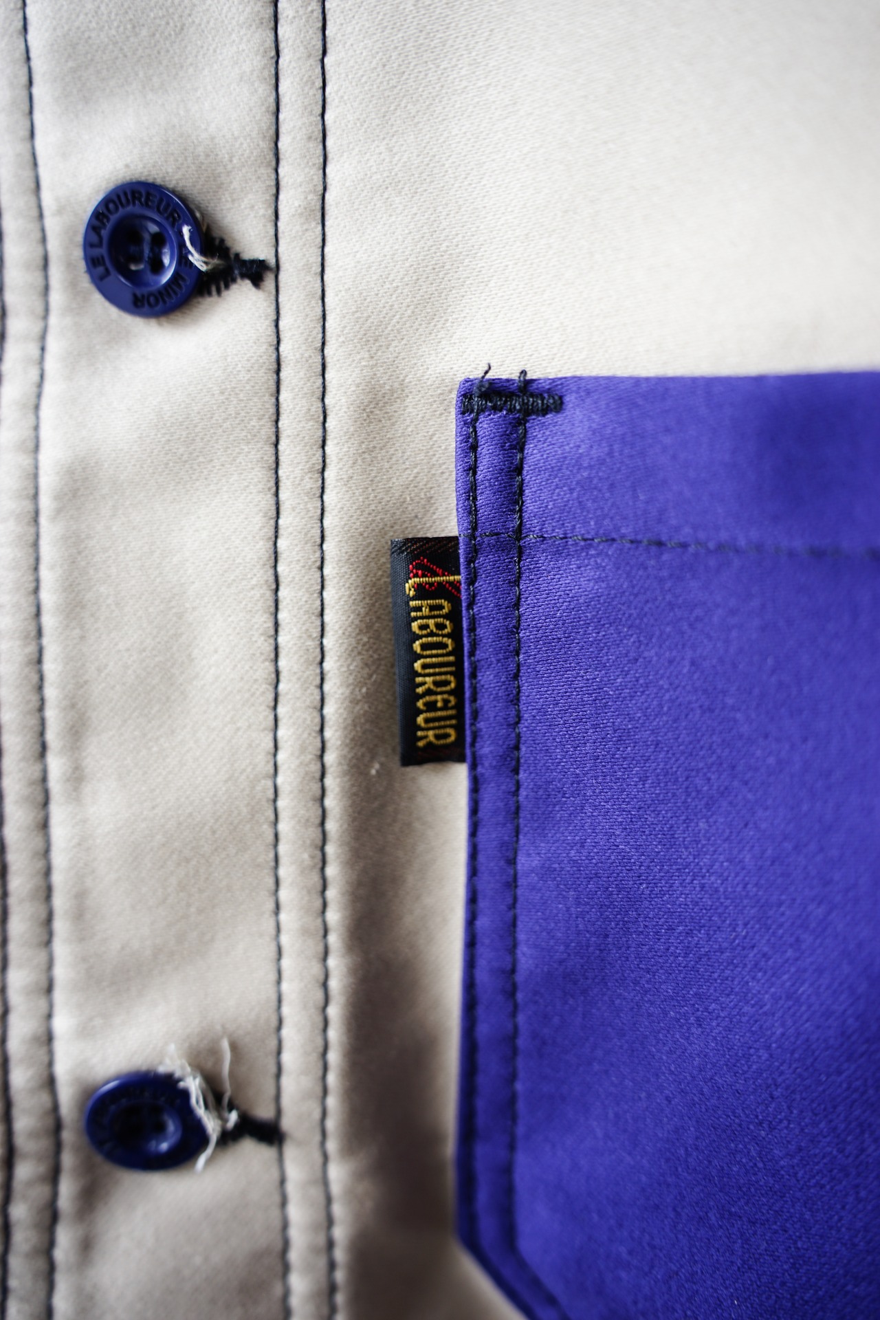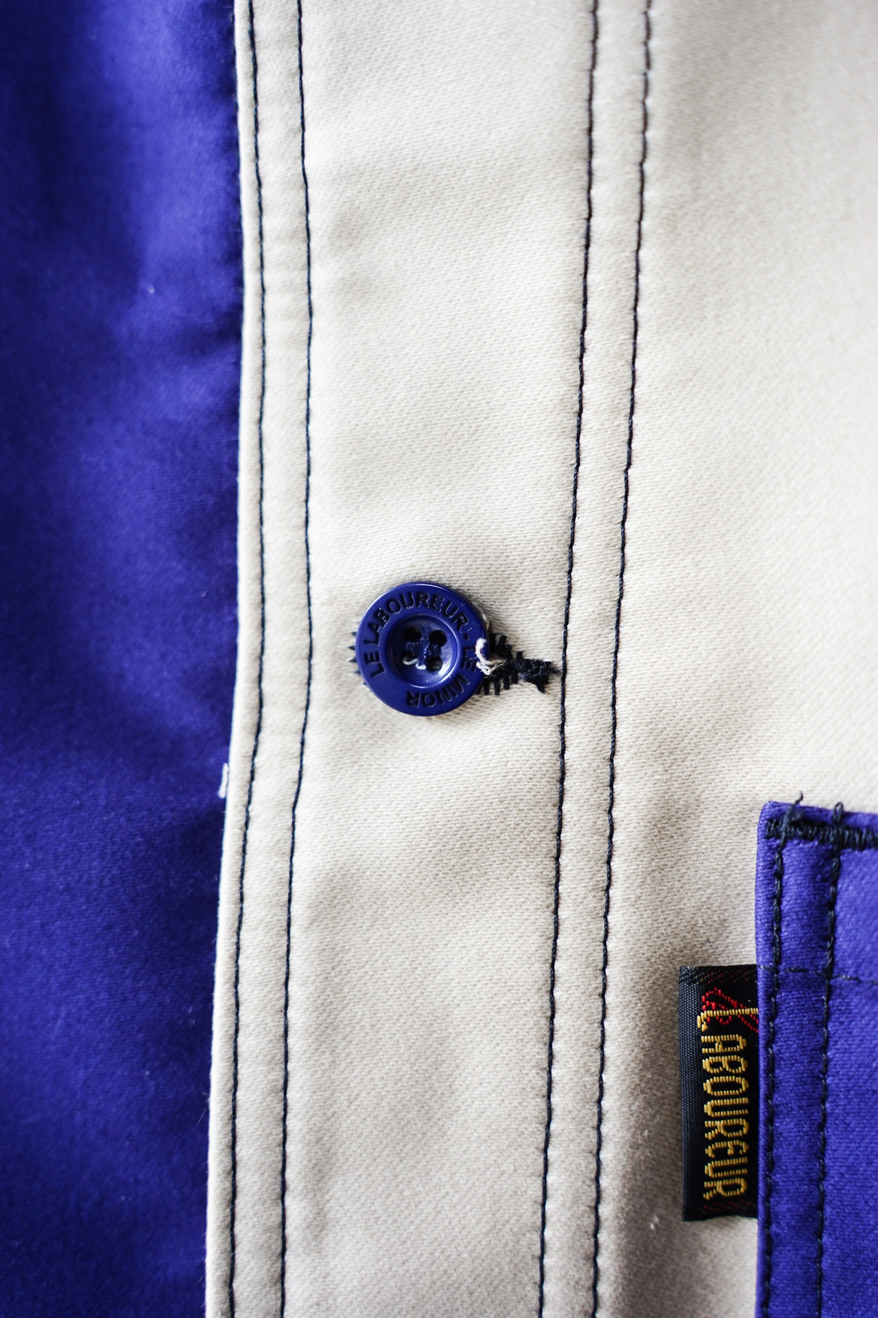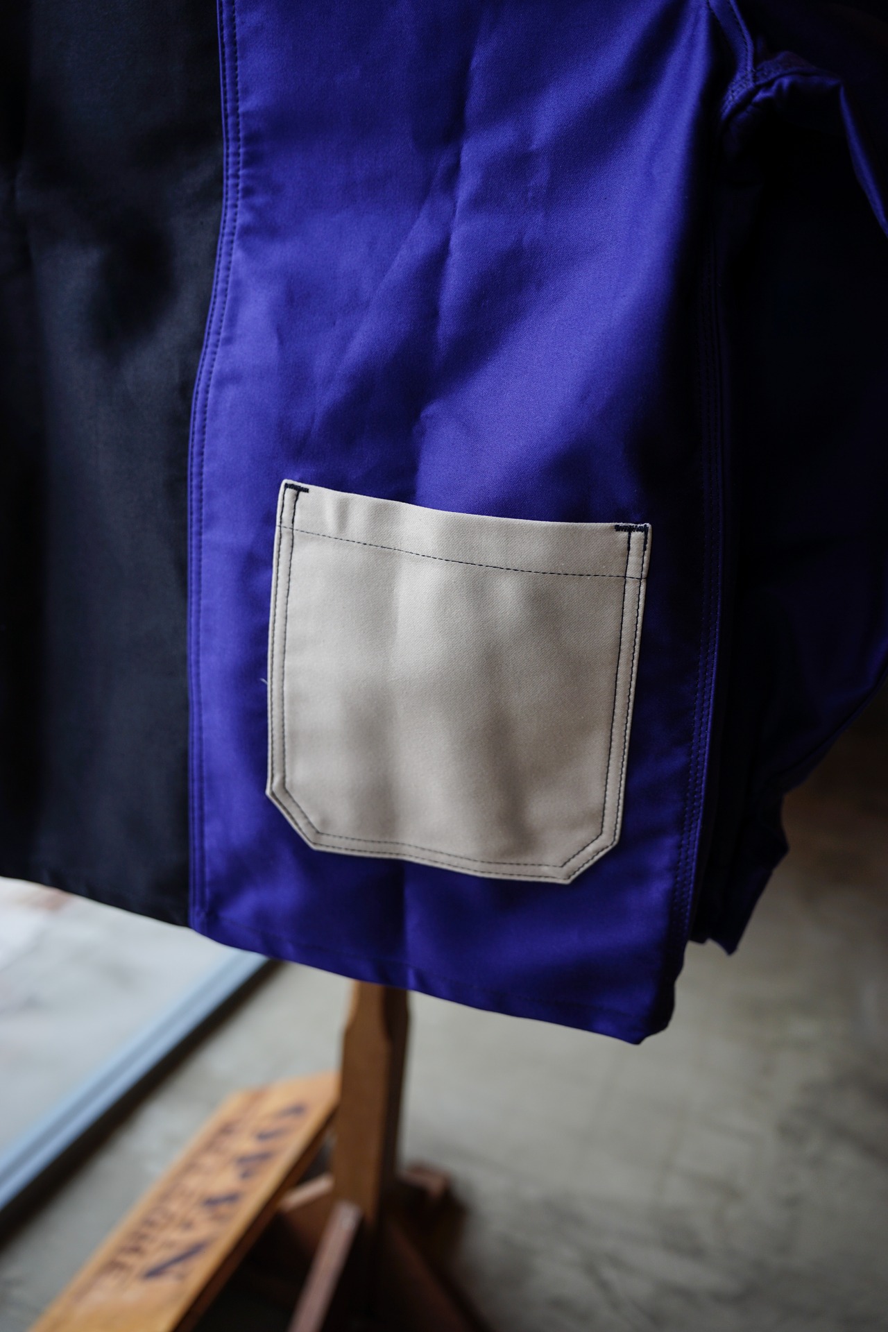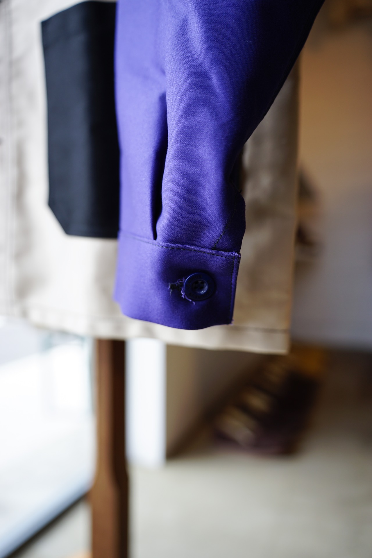 労働者のブルー、レンガ職人・石職人のエクリュ、大工のブラックとそれぞれを象徴とする3つのカラーが用いられておりますが、これはLe Minorが得意とするマリンウェア由来の配色感覚でデザインされたものになっており、他にはない唯一無二の1着に仕上がっております。