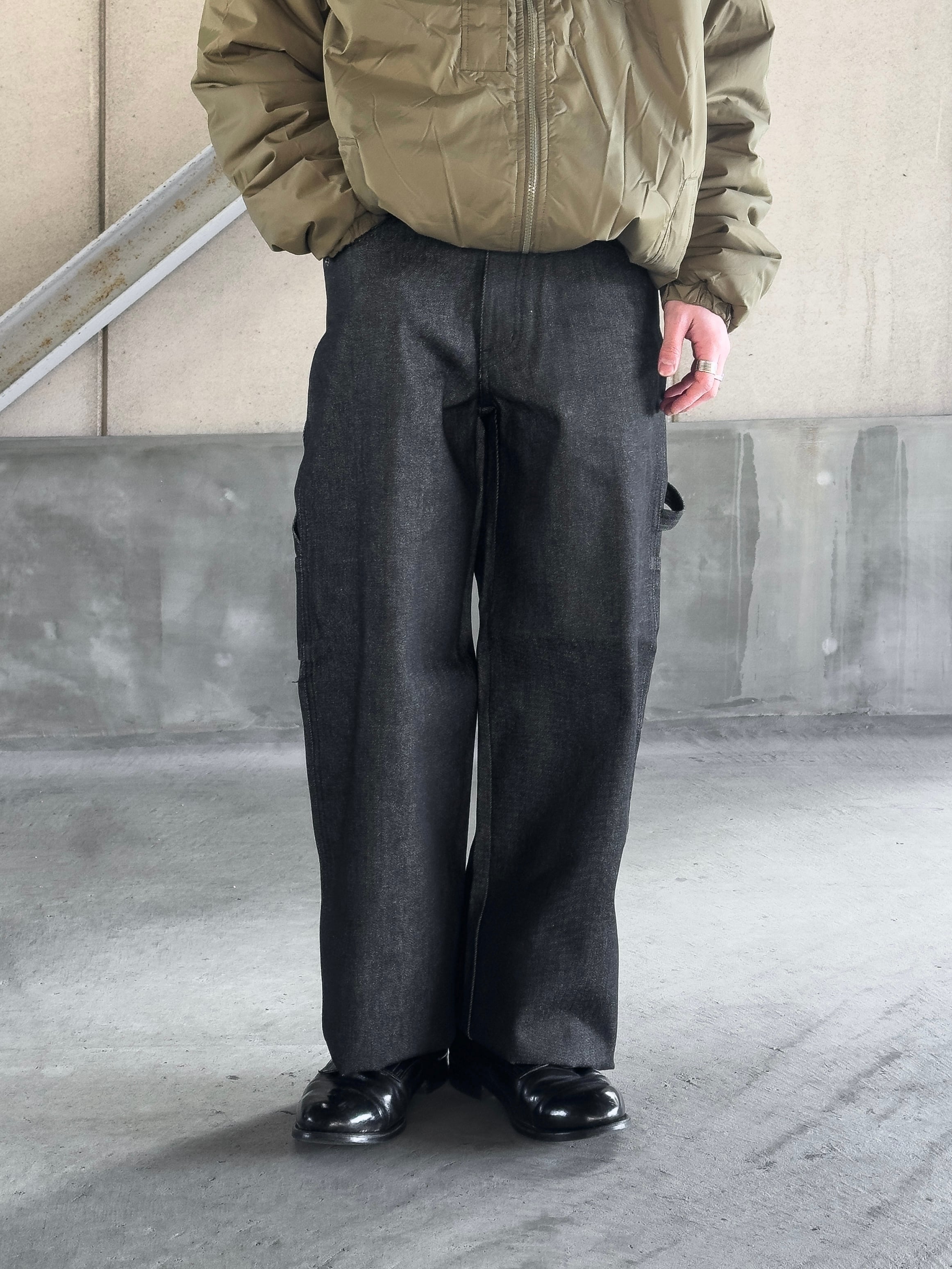 ペインターパンツは裾をためてルーズに履いたり、太めのロールアップをして履かれたりすることが多いですが、当店としては着画のように裾をすっきりさせて履くのをおすすめしております。