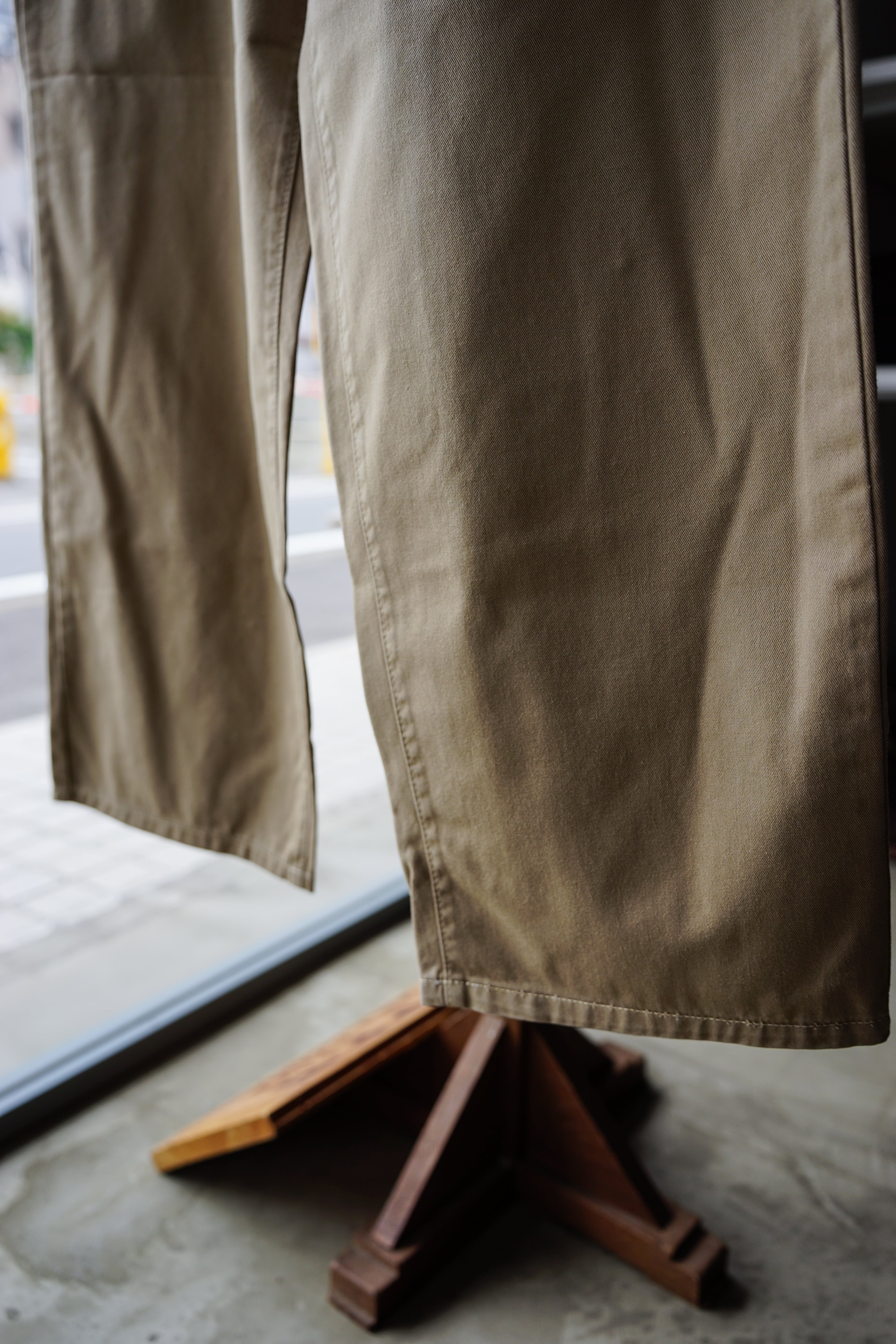 チノクロス特有の適度なハリと柔らかさを活かし、腰回りから裾にかけてダイナミックに広がるラインが特徴です。