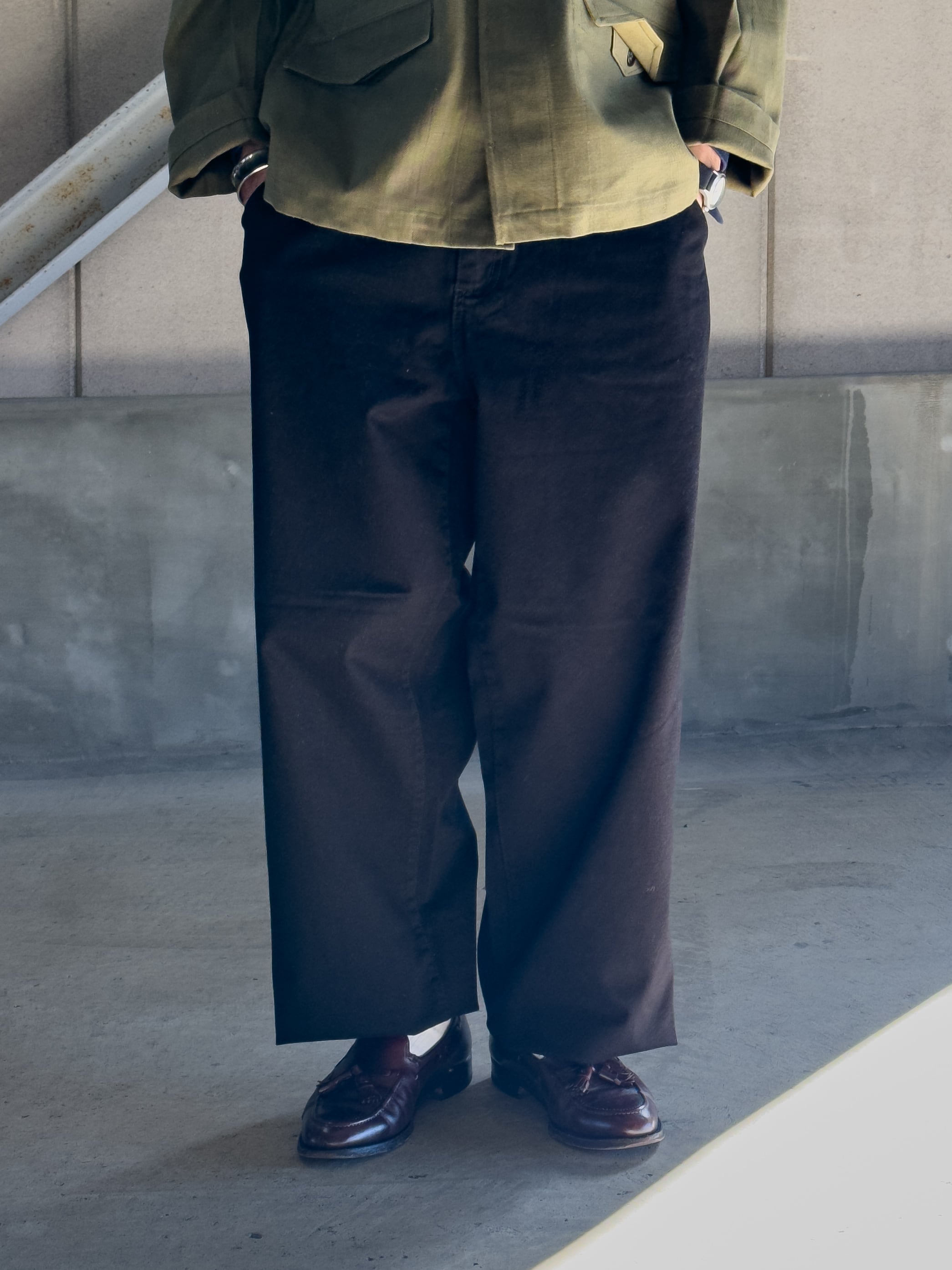 デニムよりも生地の落ち感が綺麗に出るため、ワイドながらもどこか上品で、リラックスした雰囲気を醸し出します。