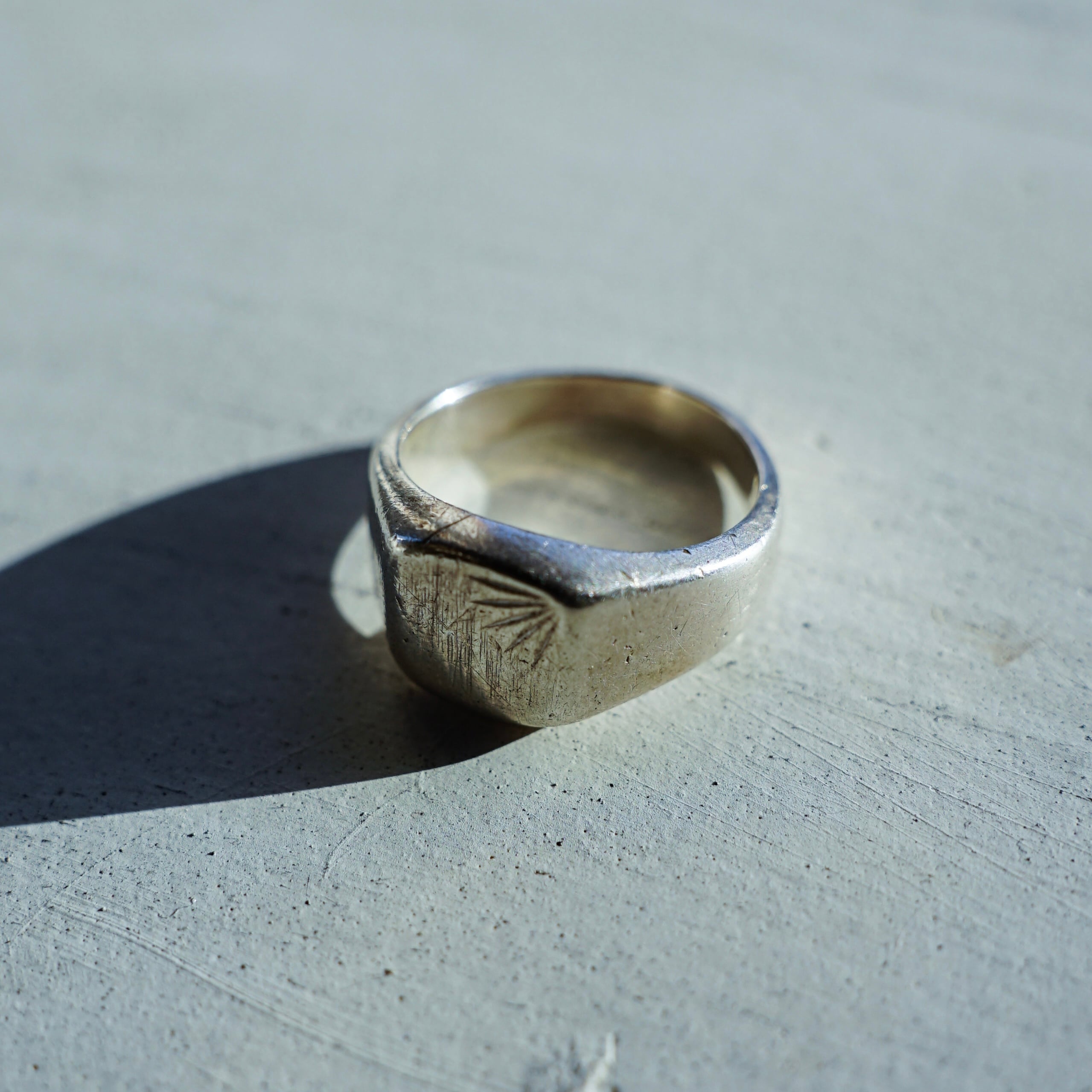 このリングの最大の魅力は現行のジュエリーではまずお目にかかれない、銀の塊をそのまま形にしたような重厚な厚みにあります。