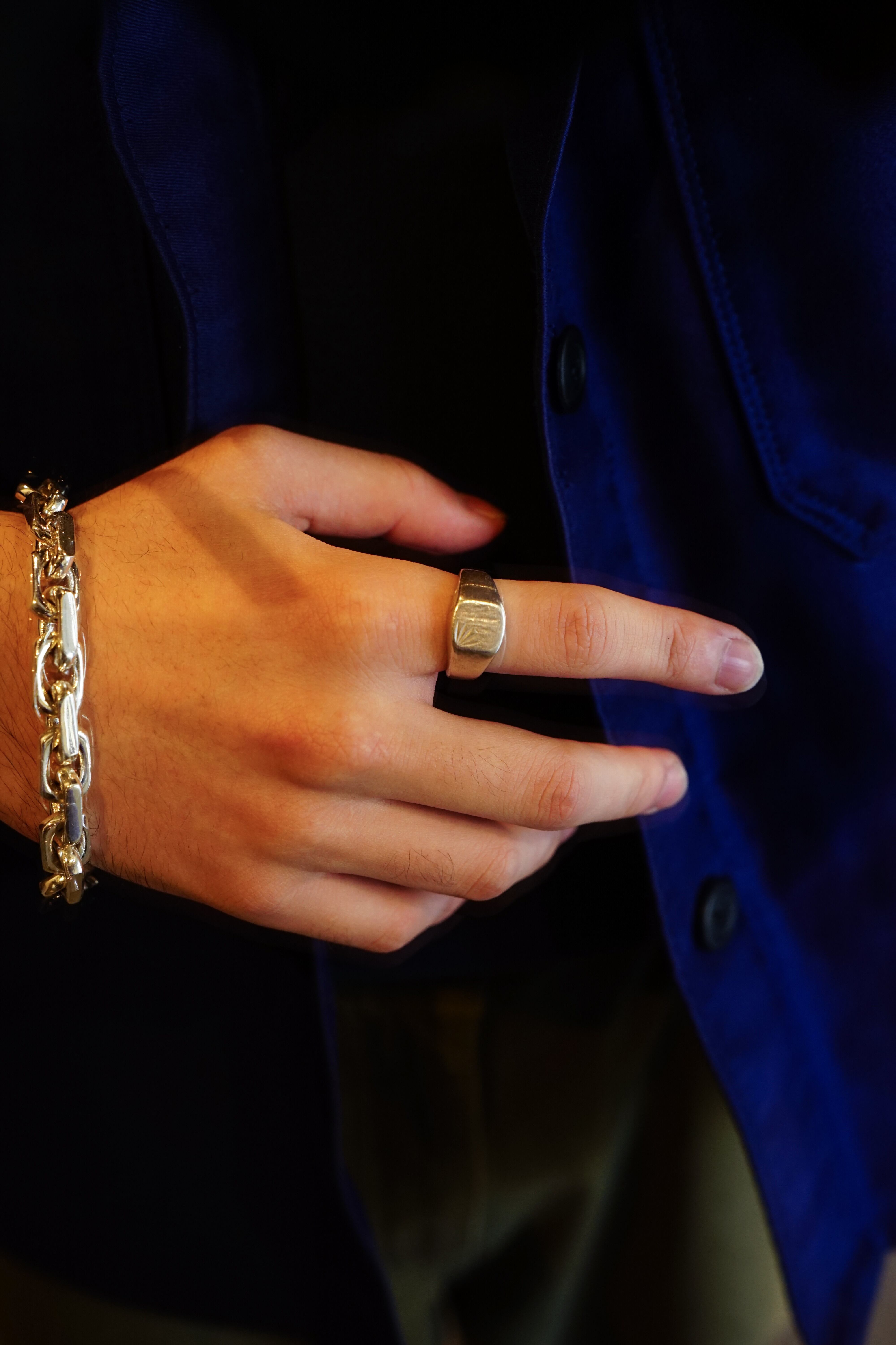 同じく厚みのあるヘビーゲージのバングルや、使い込まれたレザーストラップの時計など、素材の力強さが際立つアイテムと合わせるのがおすすめです。