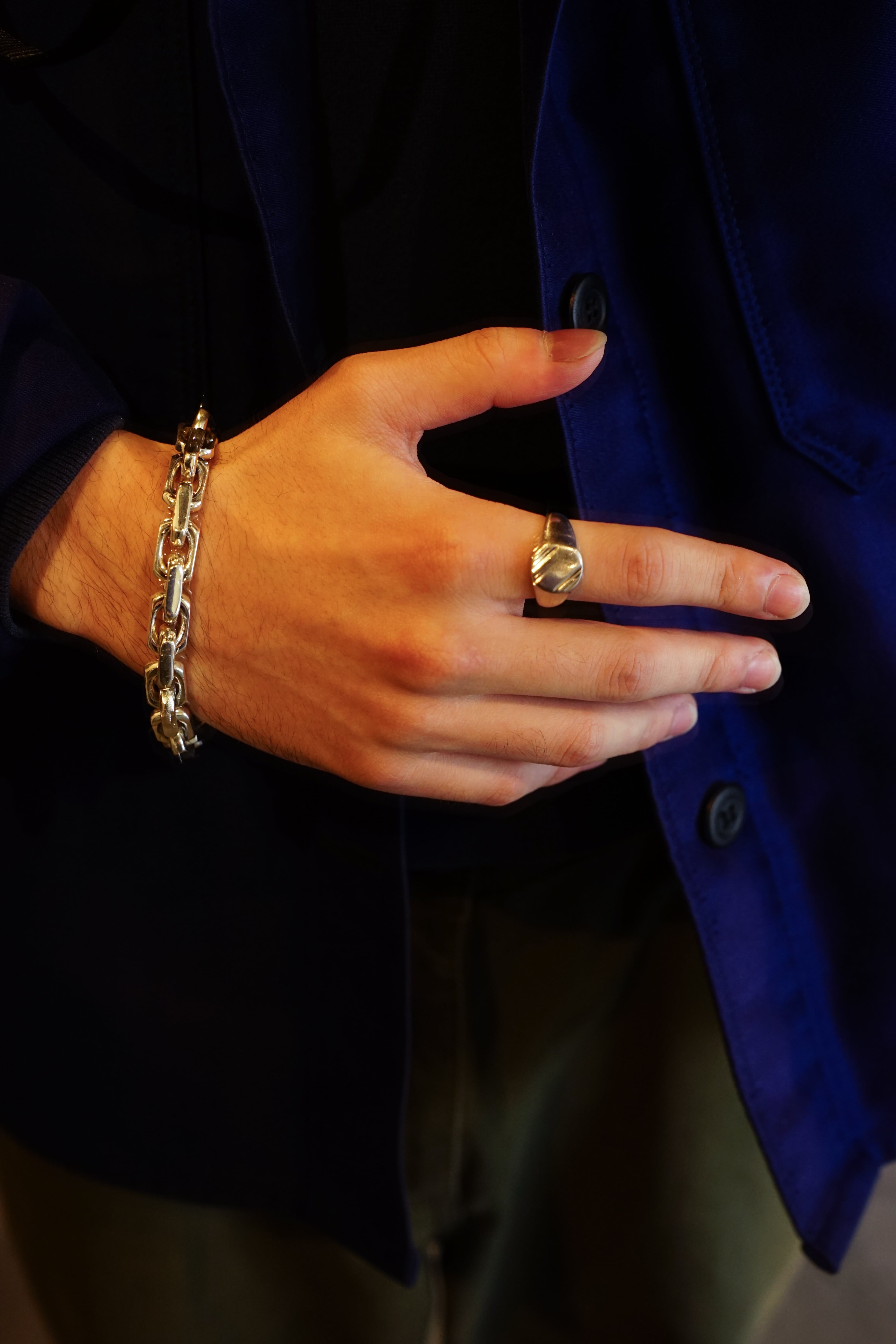 デザインに動きがあるため、シンプルなバンドリングと並べて付けたり、インディアンジュエリーのようなスタンプワークのあるリングとミックスして、個性を強調するスタイルによく映えます。