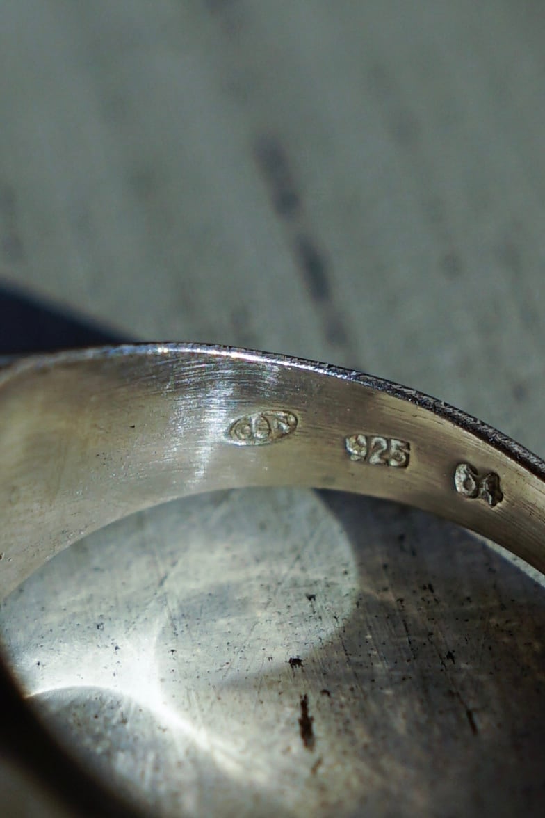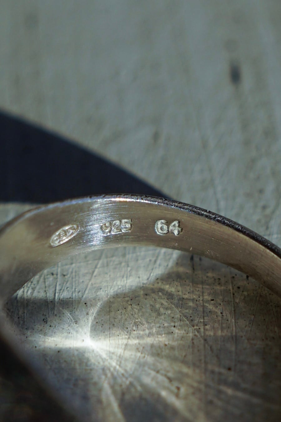 またリングの内側には、シルバー925の純度印とともに、制作した工房を証明する『メーカーズマーク』(左)と、欧州規格のサイズ表記(右)(64=日本サイズ約23号)が刻印されています。