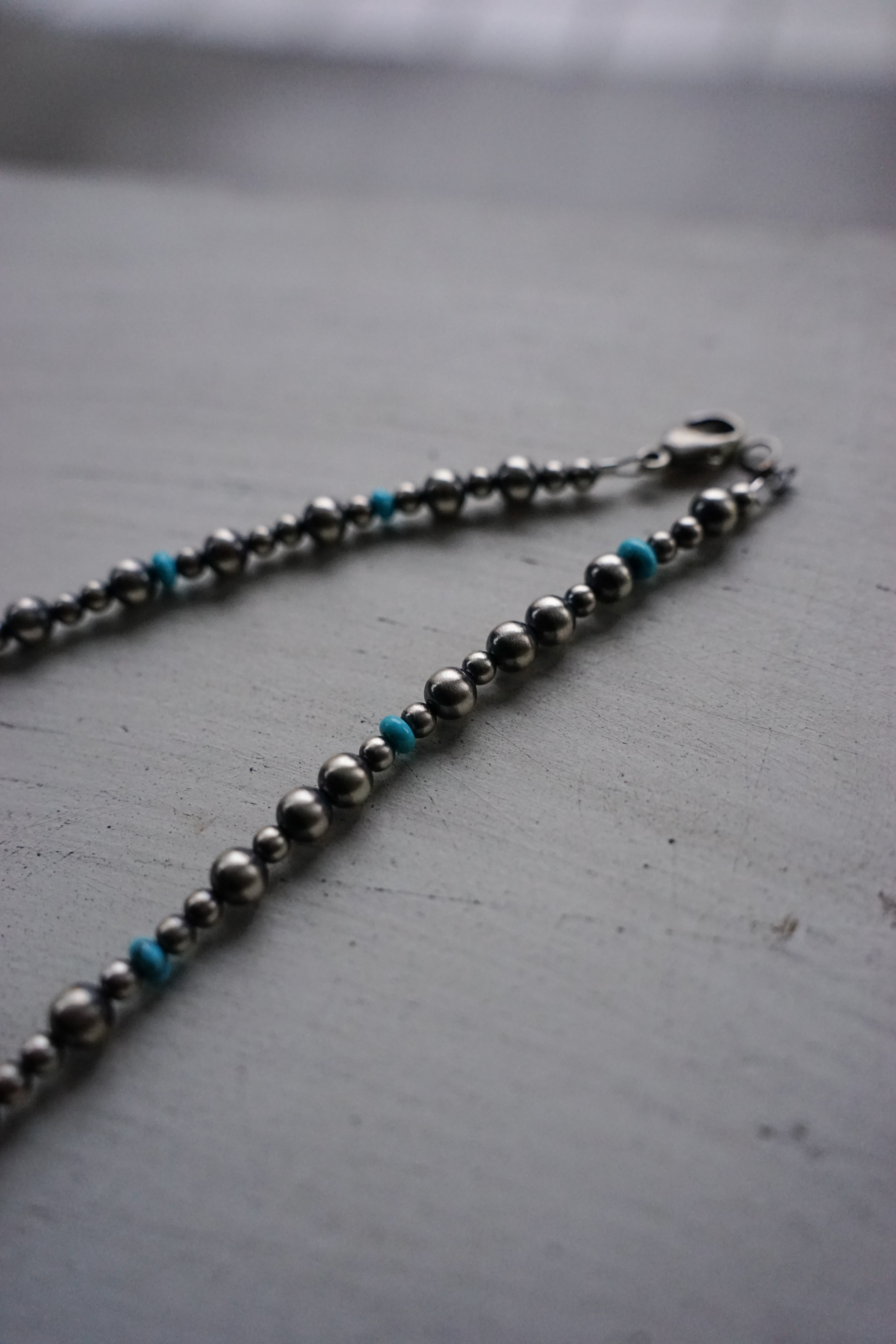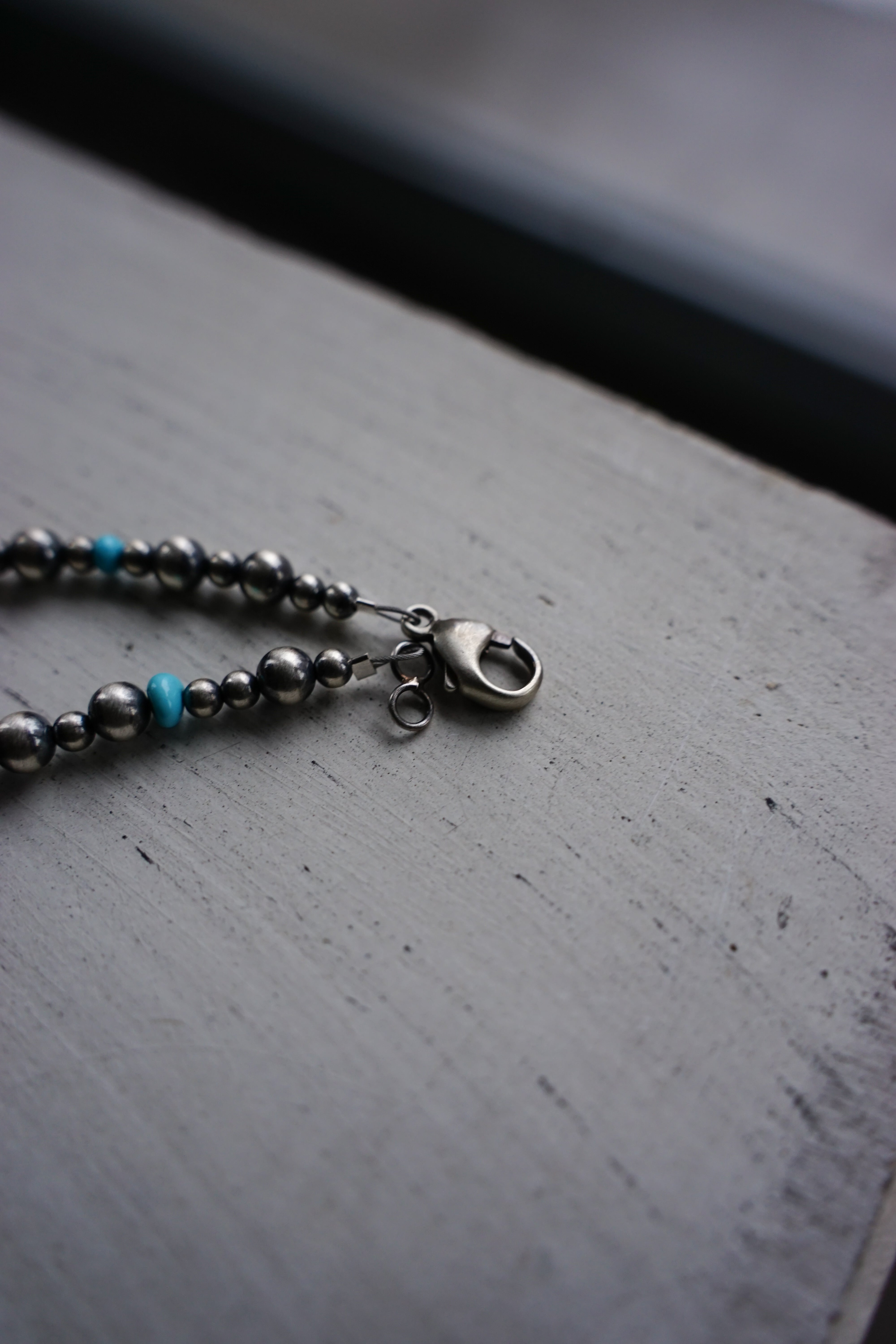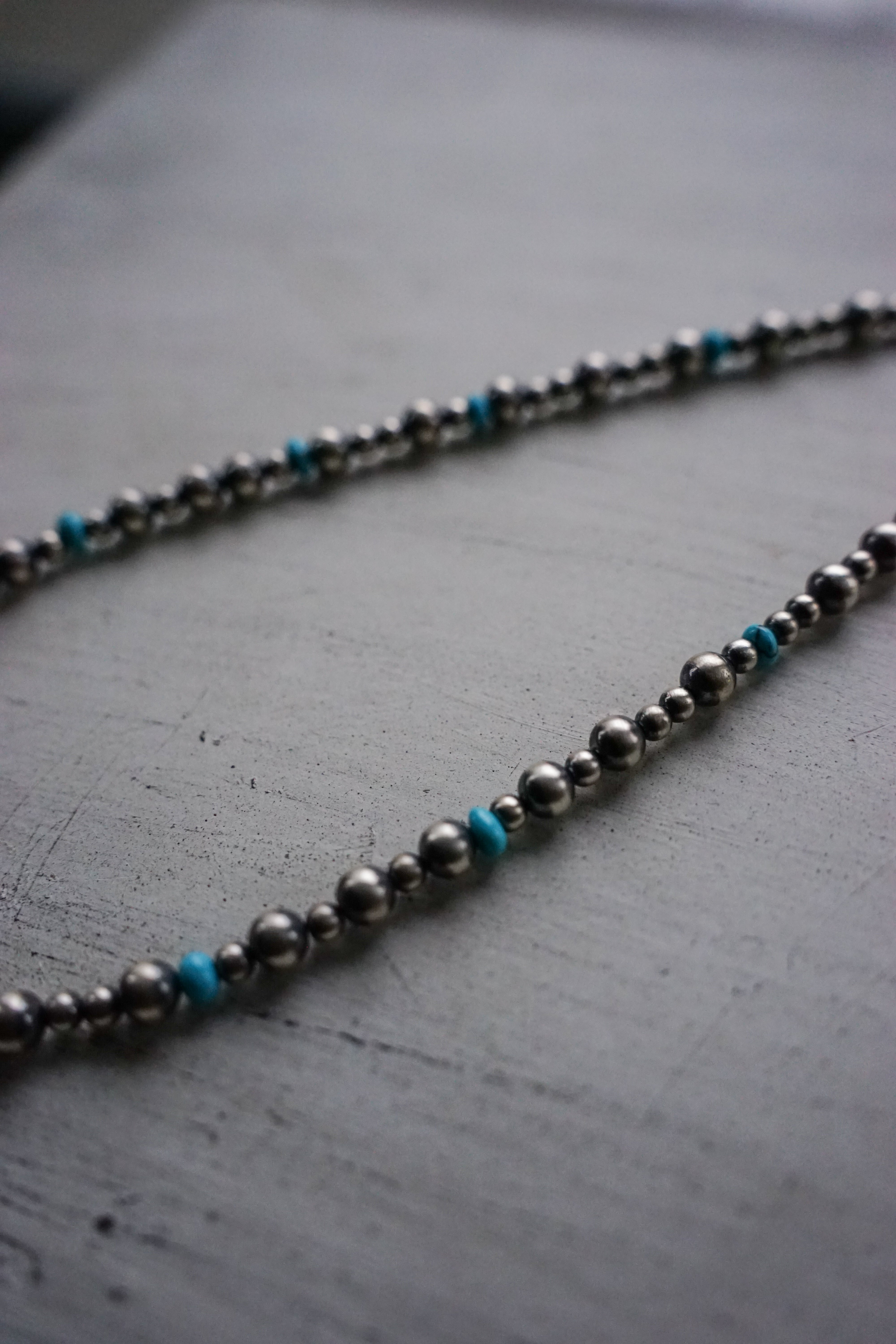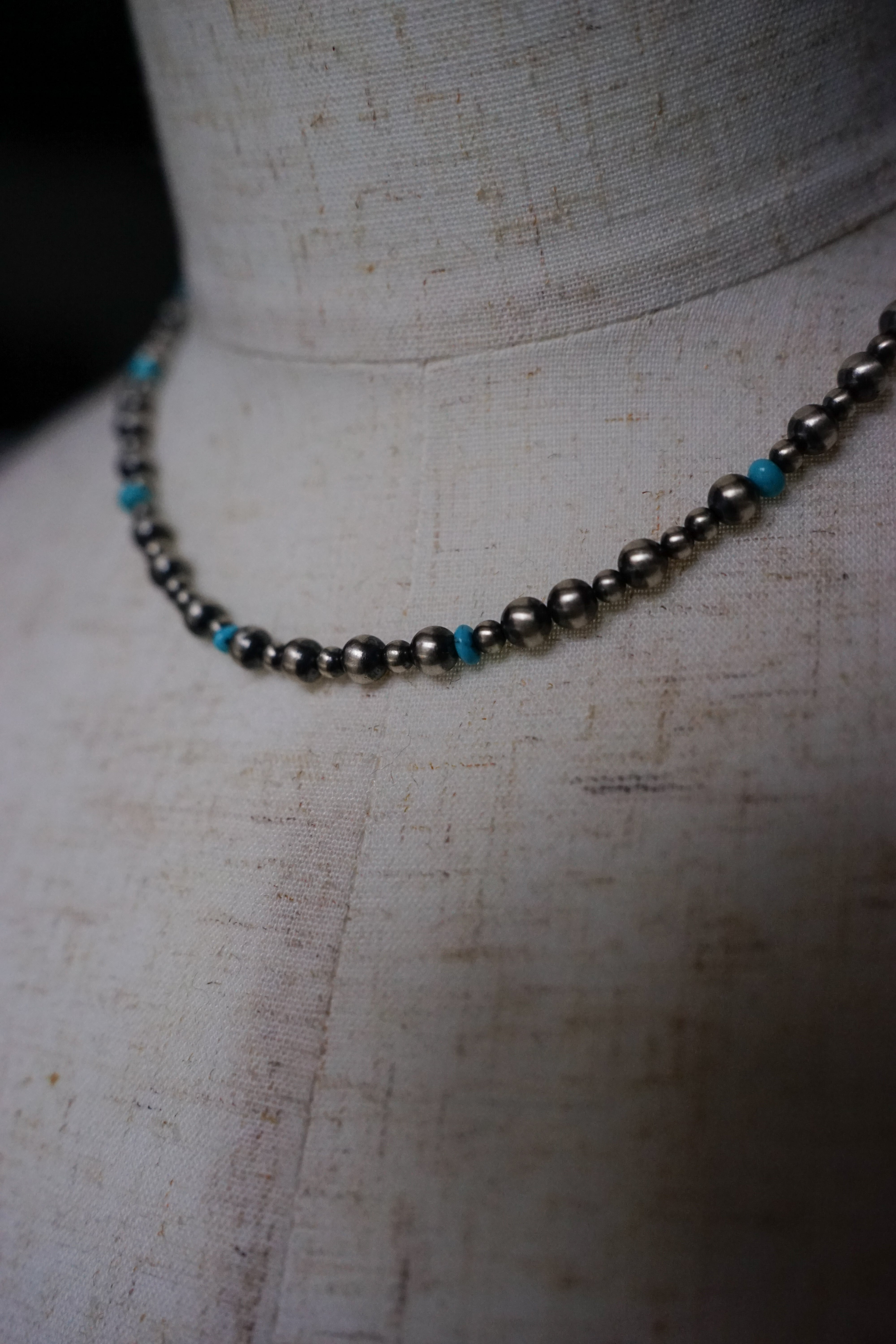 年月を経て絶妙に酸化が進んだヴィンテージシルバー特有の鈍く深い光沢に加え、鮮やかなターコイズビーズがリズム良く配されたデザインが魅力的です。