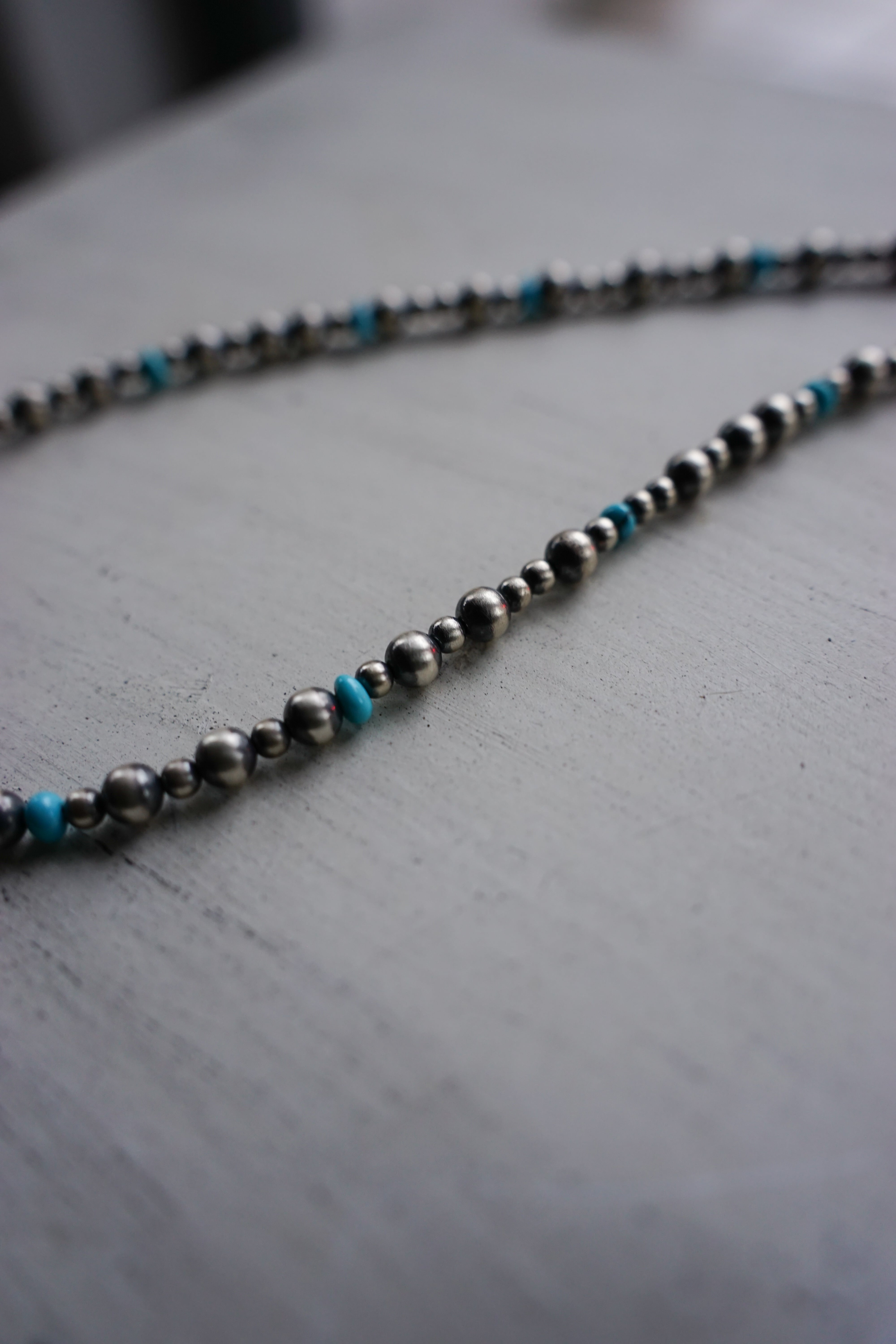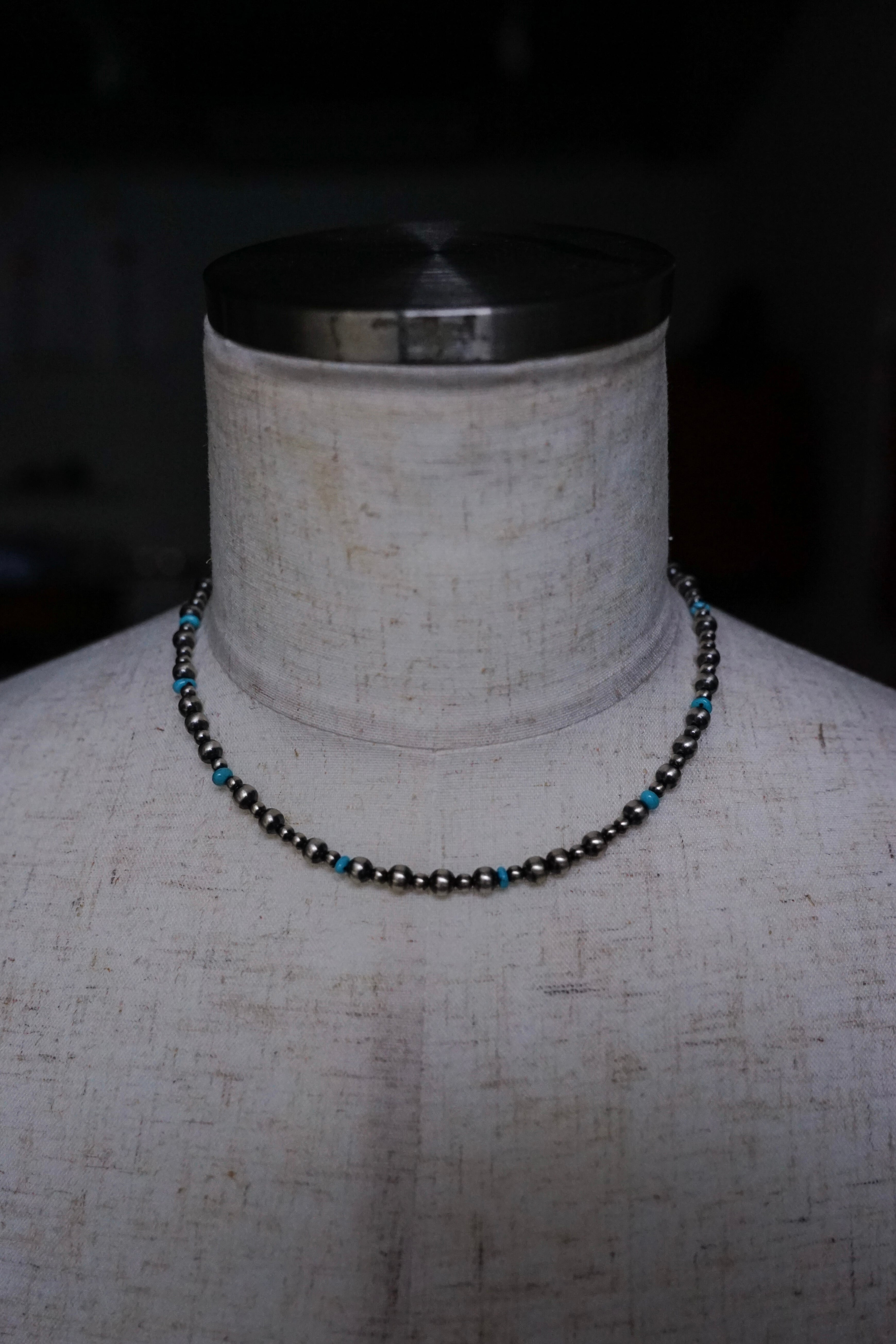 元々はお守りとして着用されてきたこの伝統的なナバホ族のシルバージュエリーはかつては"ホーガンビーズ"と呼ばれていましたが、今では真珠のように美しいその見た目から"ナバホパール"と呼ばれるようになり、現代まで受け継がれてきた経緯を持ちます。