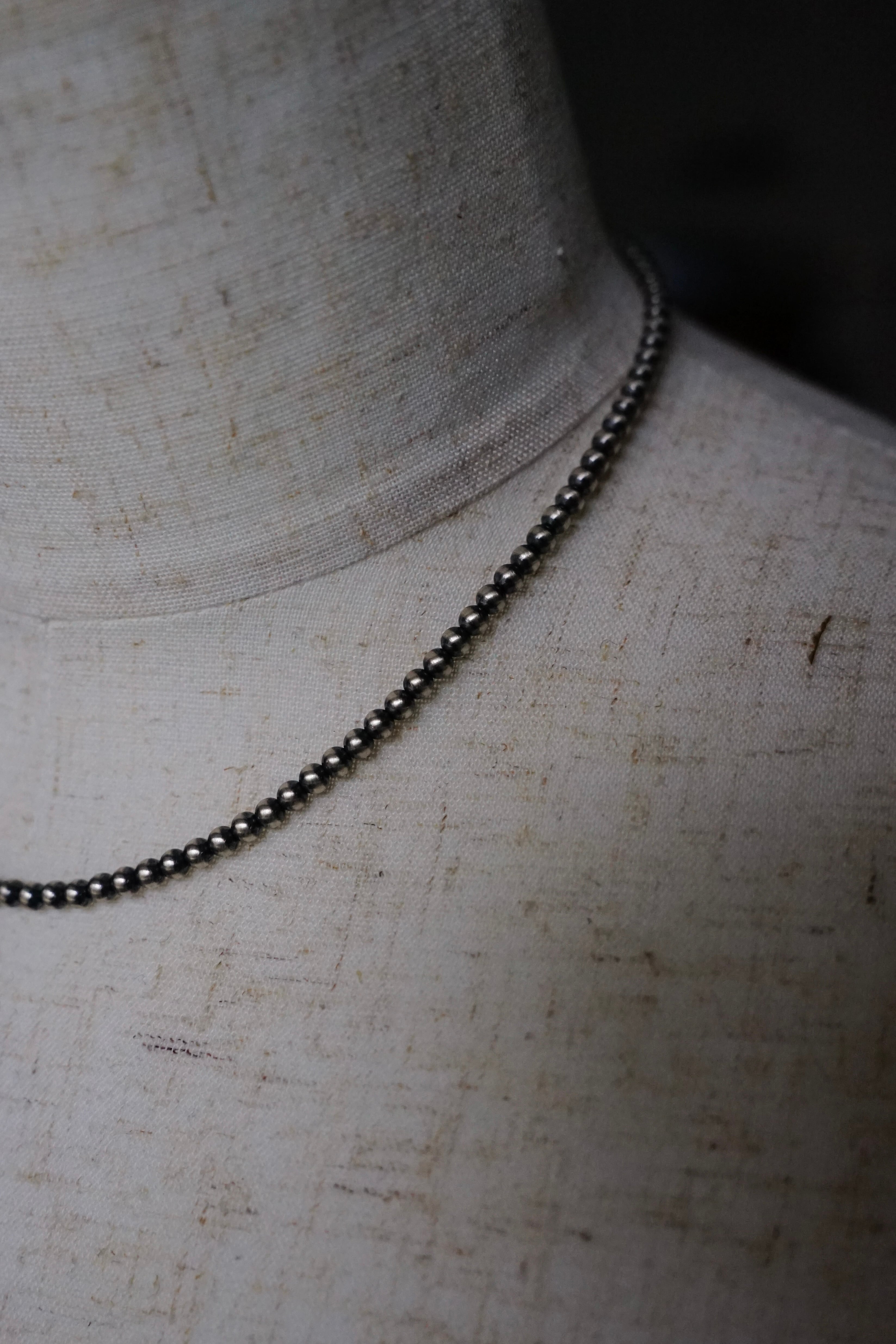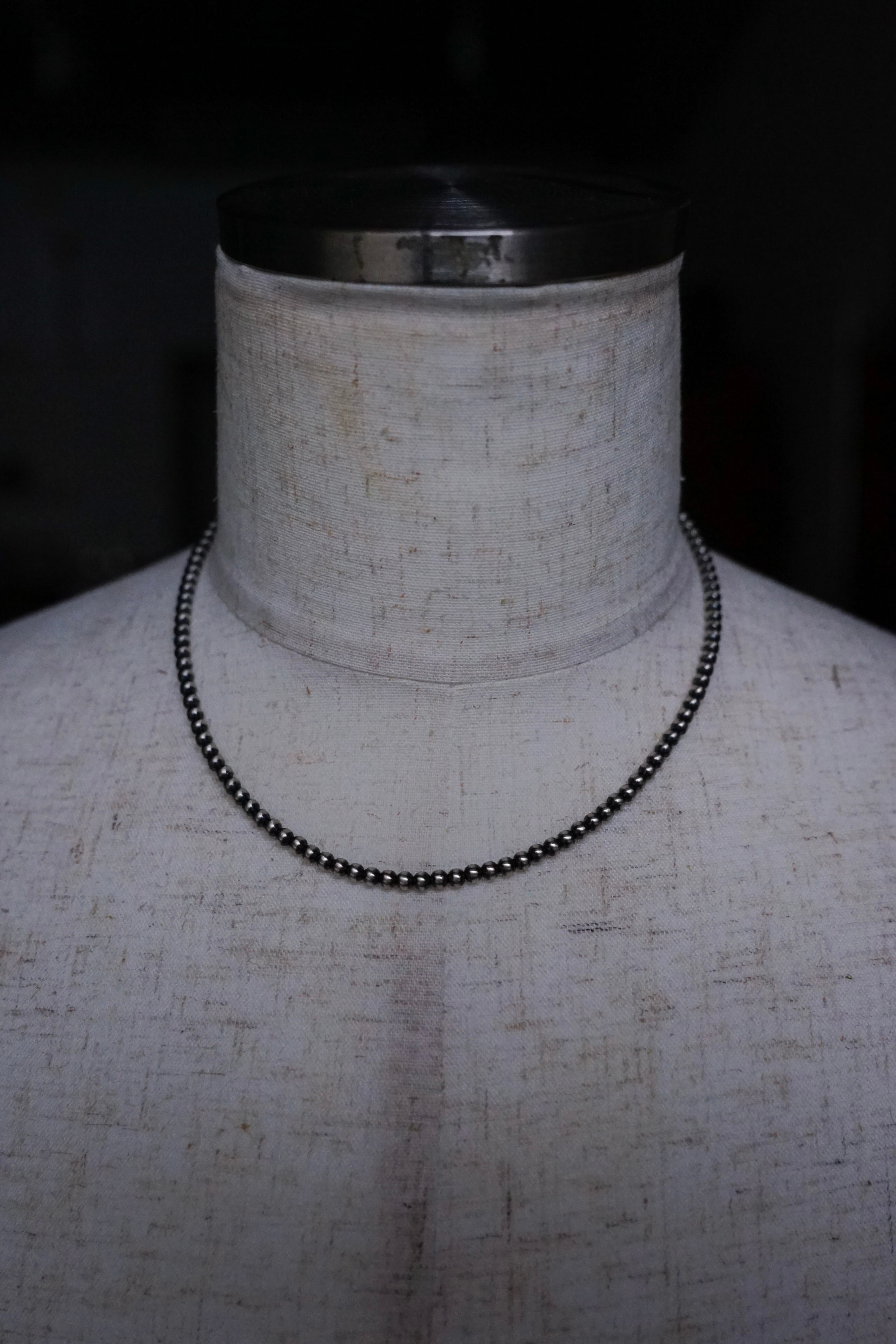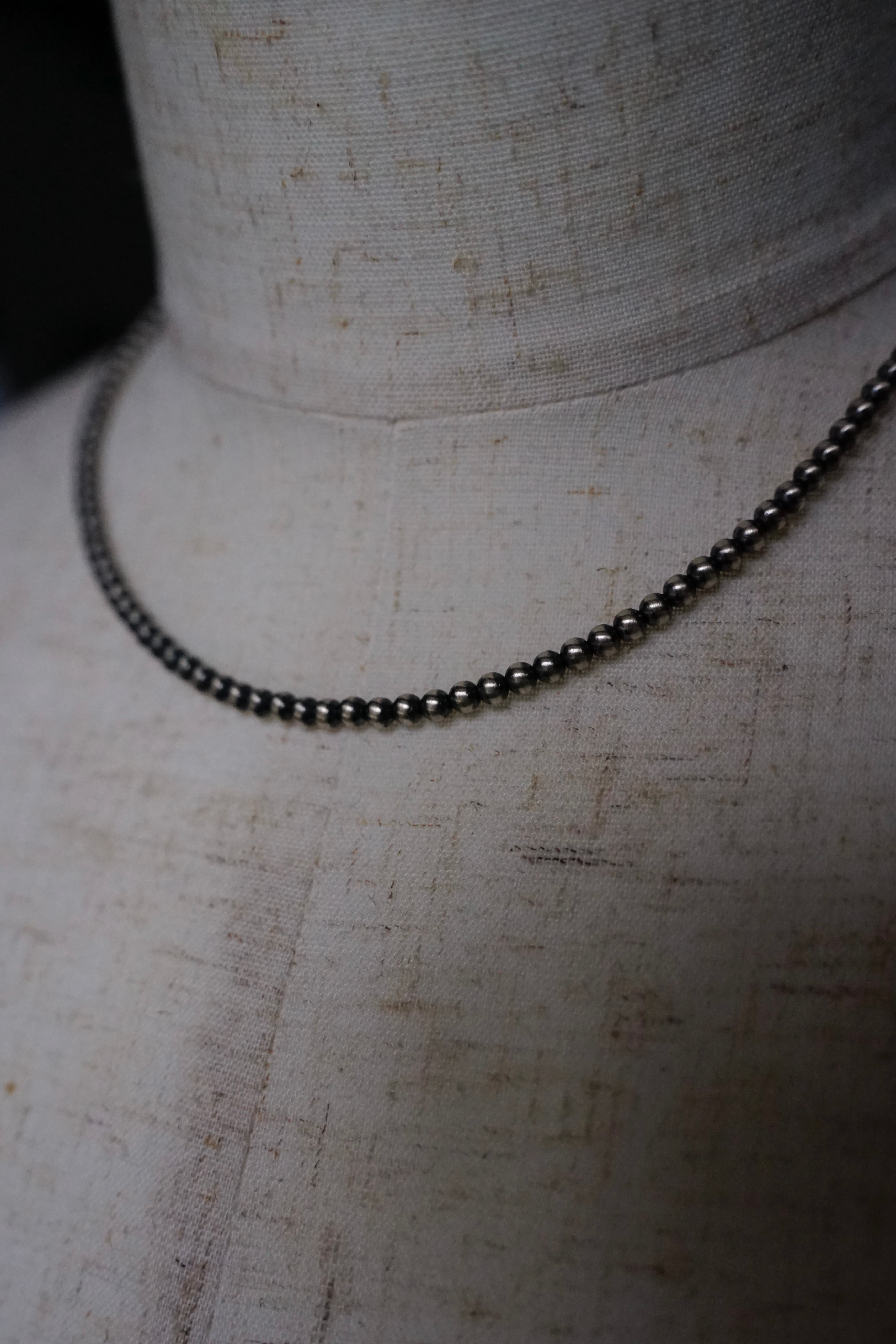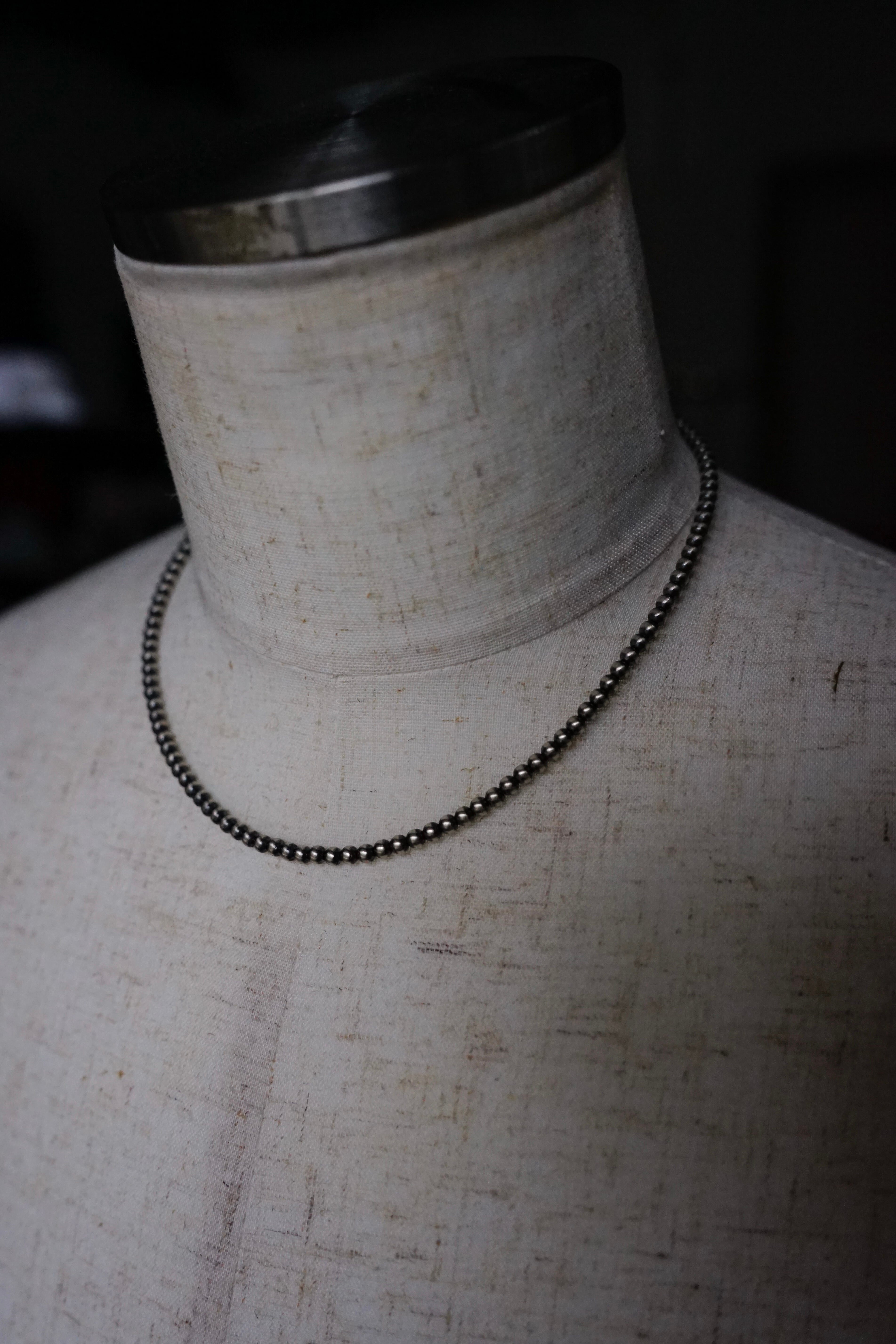 元々はお守りとして着用されてきたこの伝統的なナバホ族のシルバージュエリーはかつては"ホーガンビーズ"と呼ばれていましたが、今では真珠のように美しいその見た目から"ナバホパール"と呼ばれるようになり、現代まで受け継がれてきた経緯を持ちます。