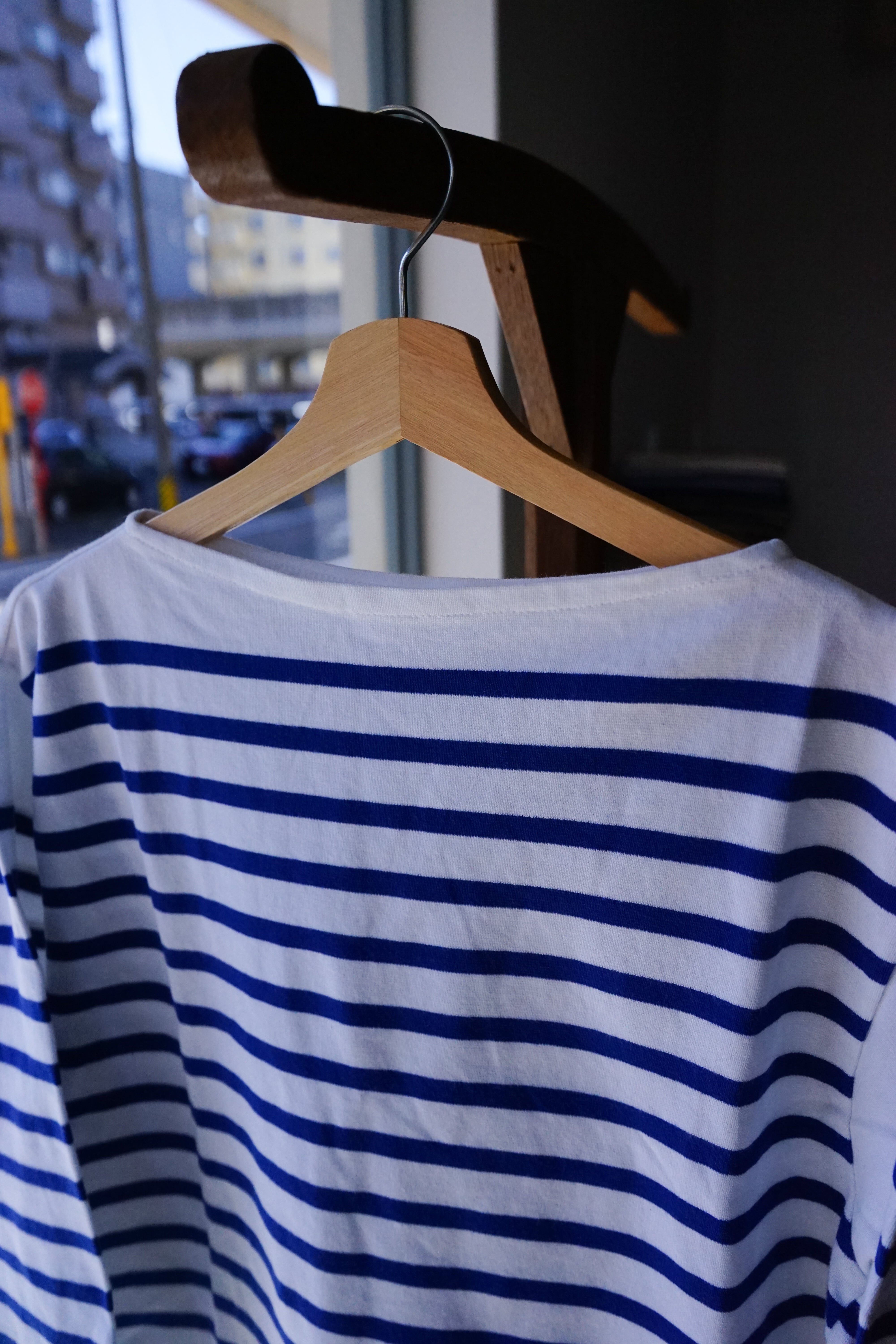 最大の特徴はボートネックと呼ばれる横に広く開いた襟ぐりにあります。