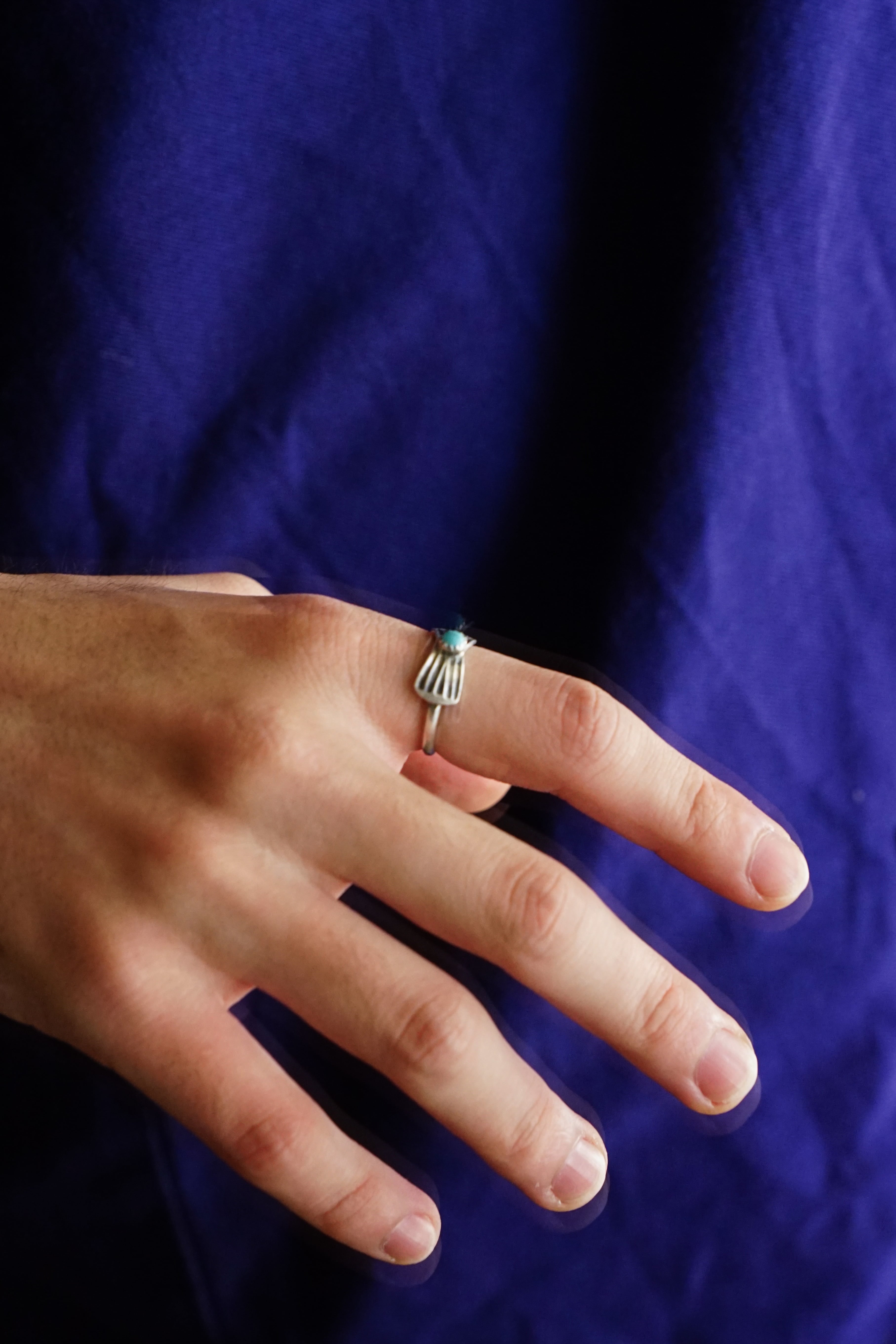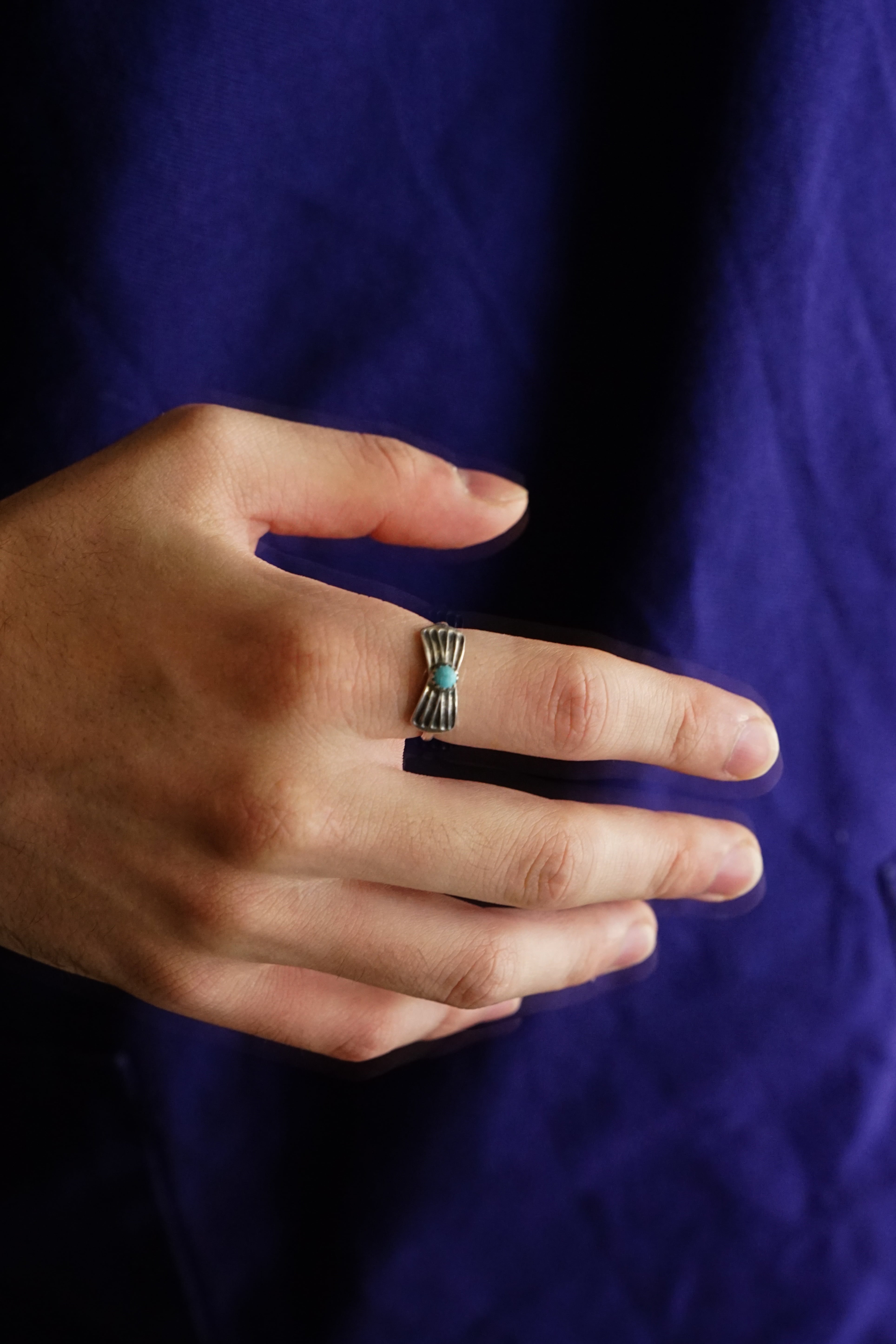 既にインディアンジュエリーが好きでターコイズリングをつけている方はもちろん、シルバーしか持っていない方にもお勧めしたいこちらのナバホ族のターコイズリング。