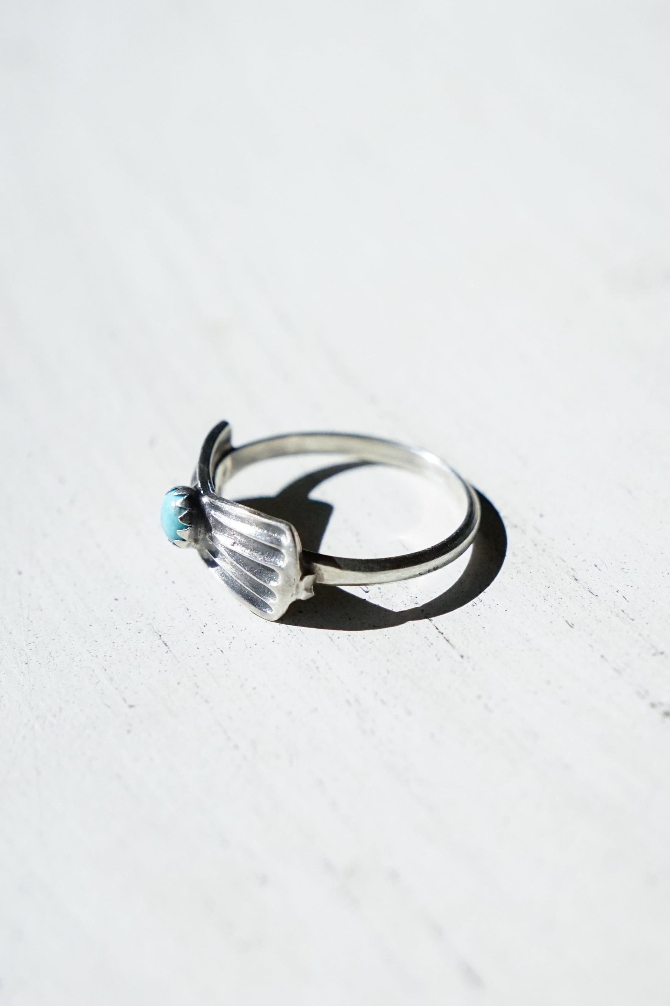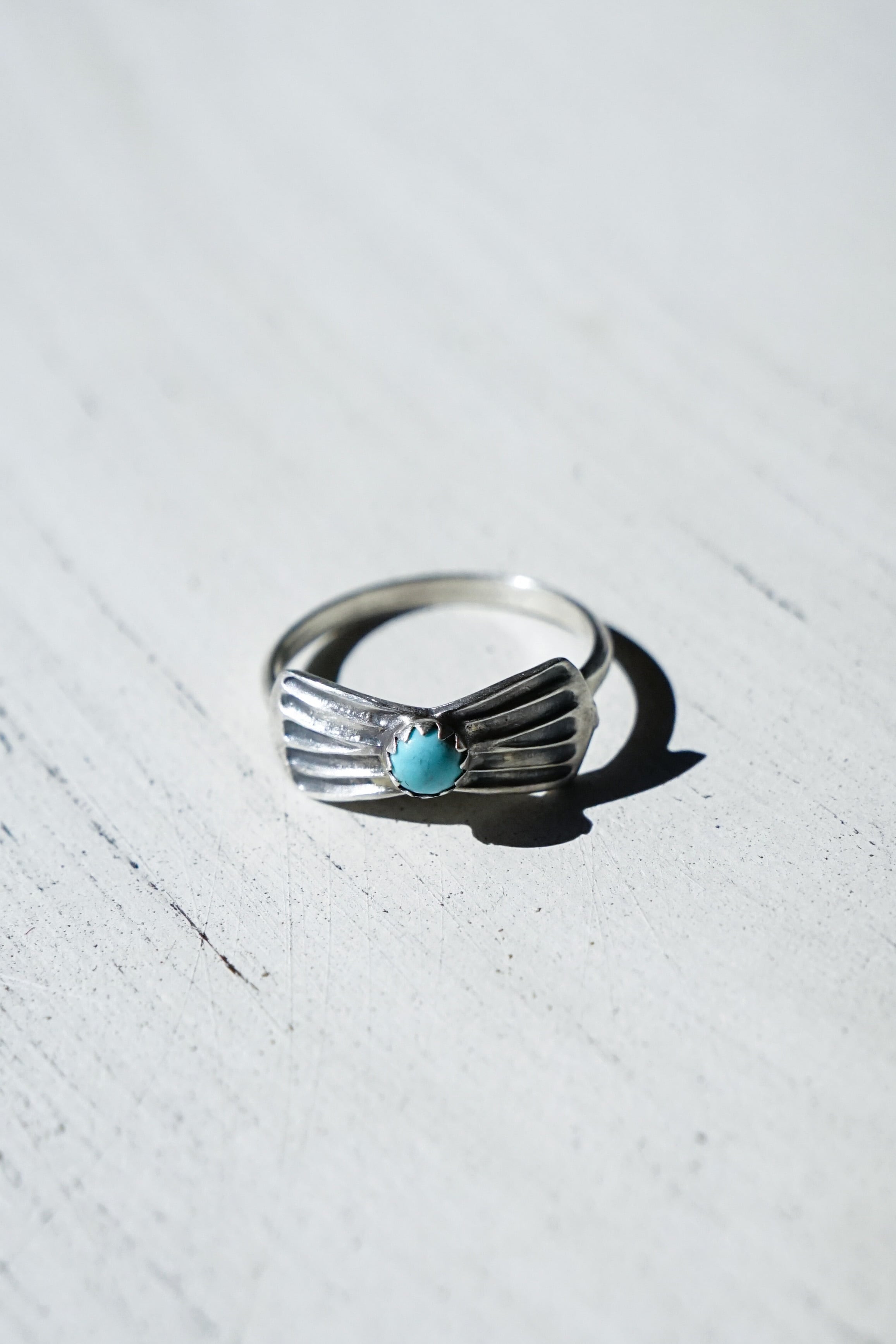 中央に鎮座するスカイブルーのターコイズを挟むようにして、左右には放射状のラインが刻まれたシルバーが美しく広がり、小ぶりながらもナバホの伝統的なフォルムが凝縮されています。