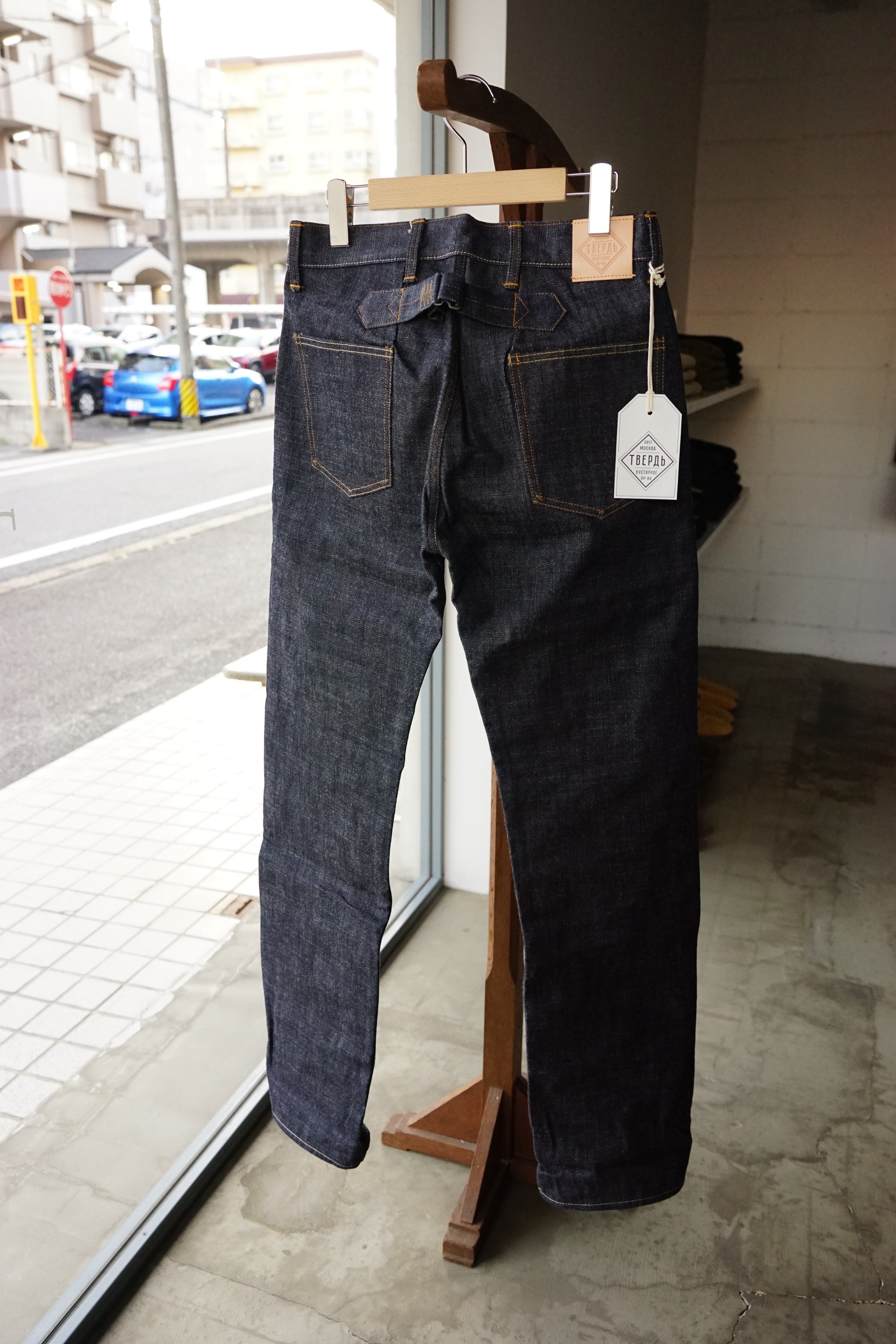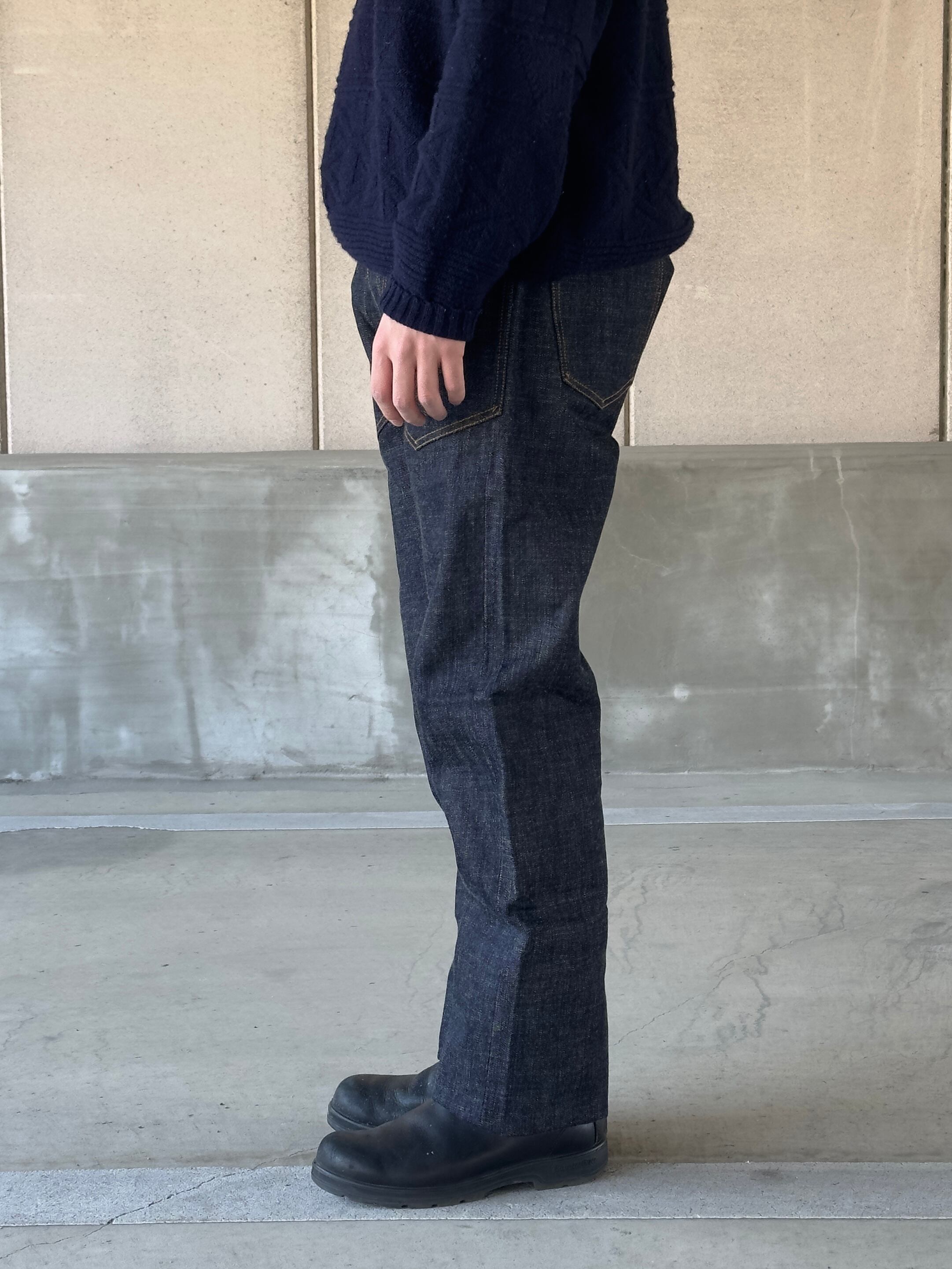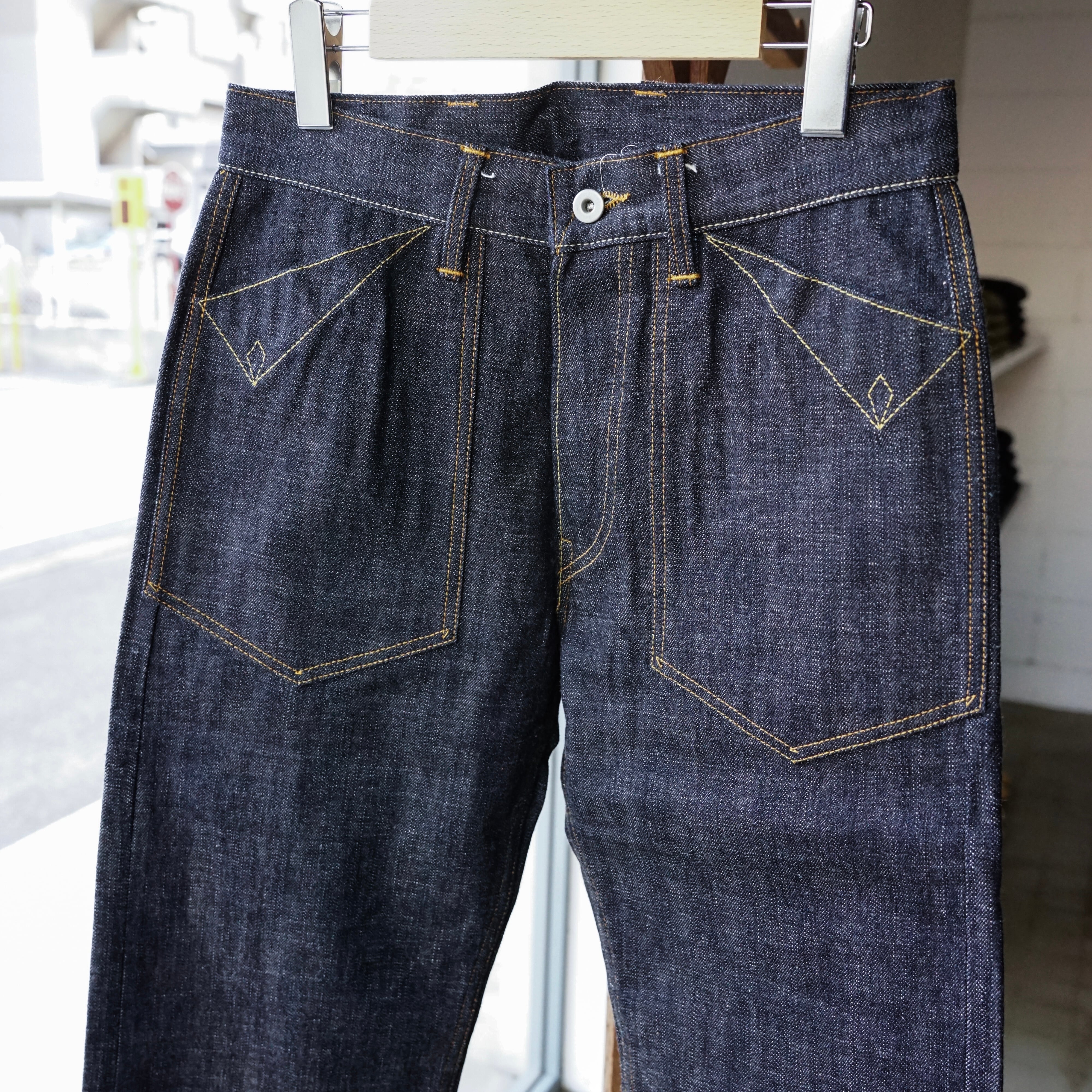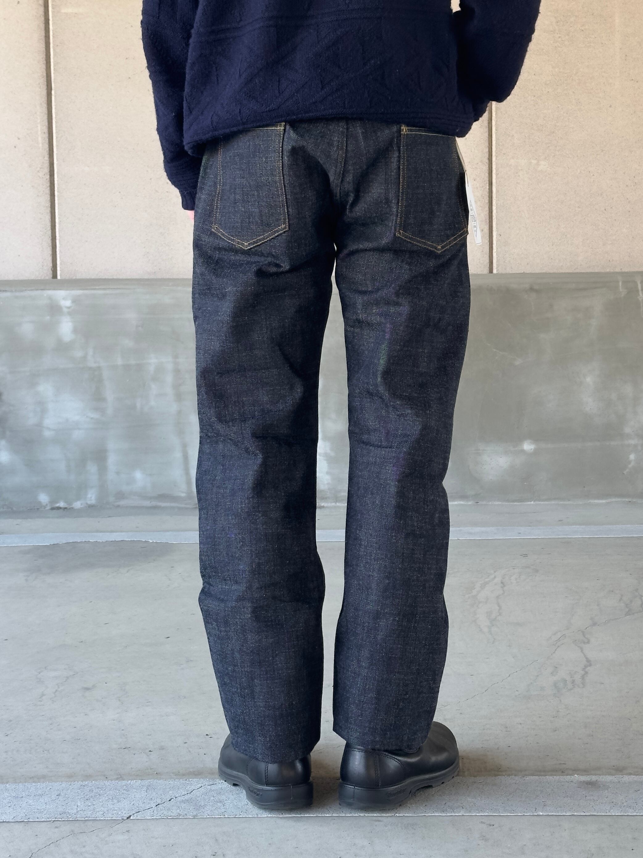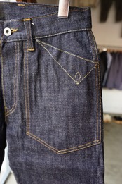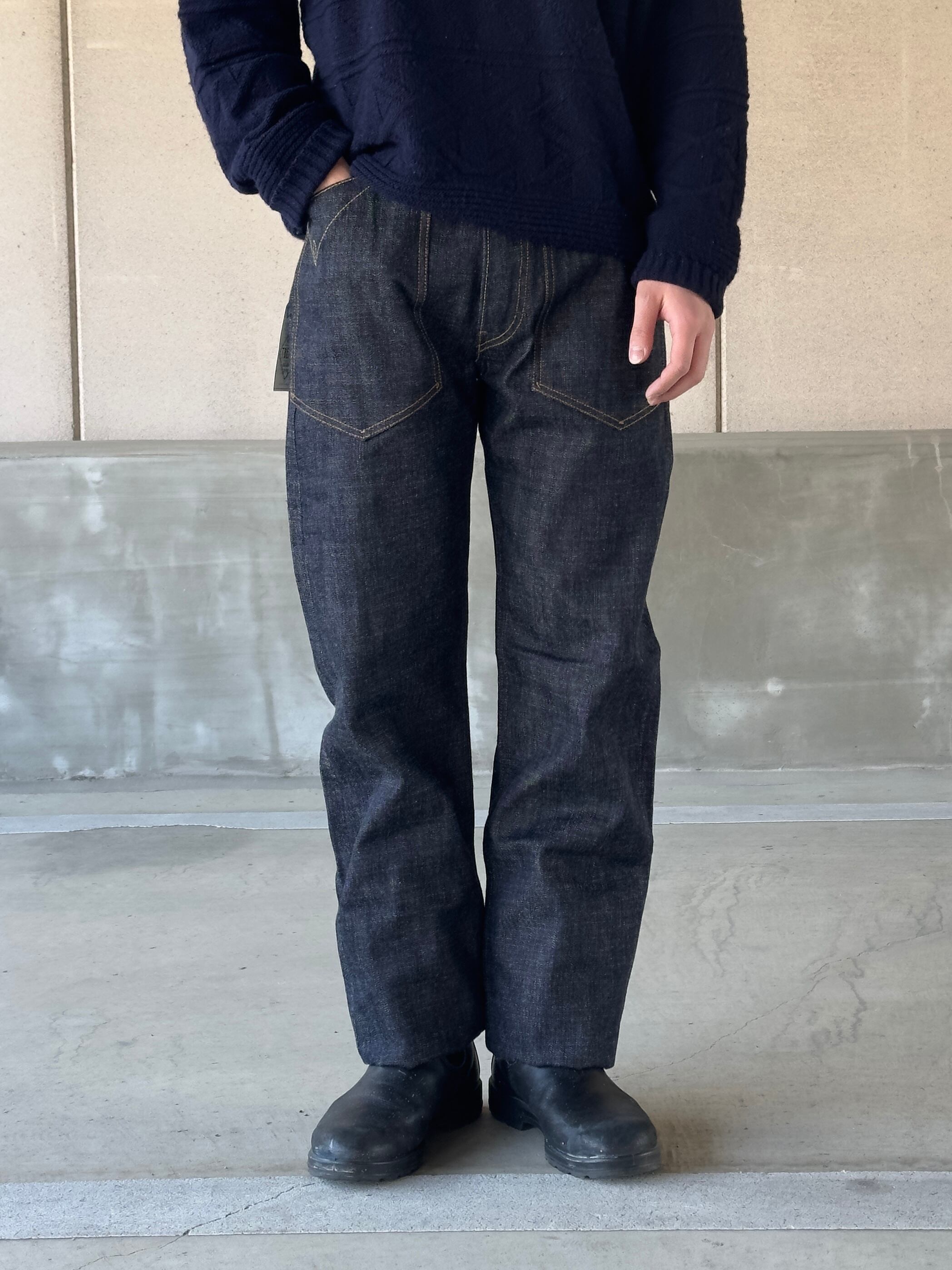 フロントポケットの直線的なカッティングや、一本針のヴィンテージミシンによる力強いステッチワークは、現代の効率的な縫製とは無縁の、職人エゴールによる「手仕事の痕跡」そのものです。着用時のバックスタイルは、ヴィンテージ好きにはたまらない重厚な佇まいを見せてくれます。