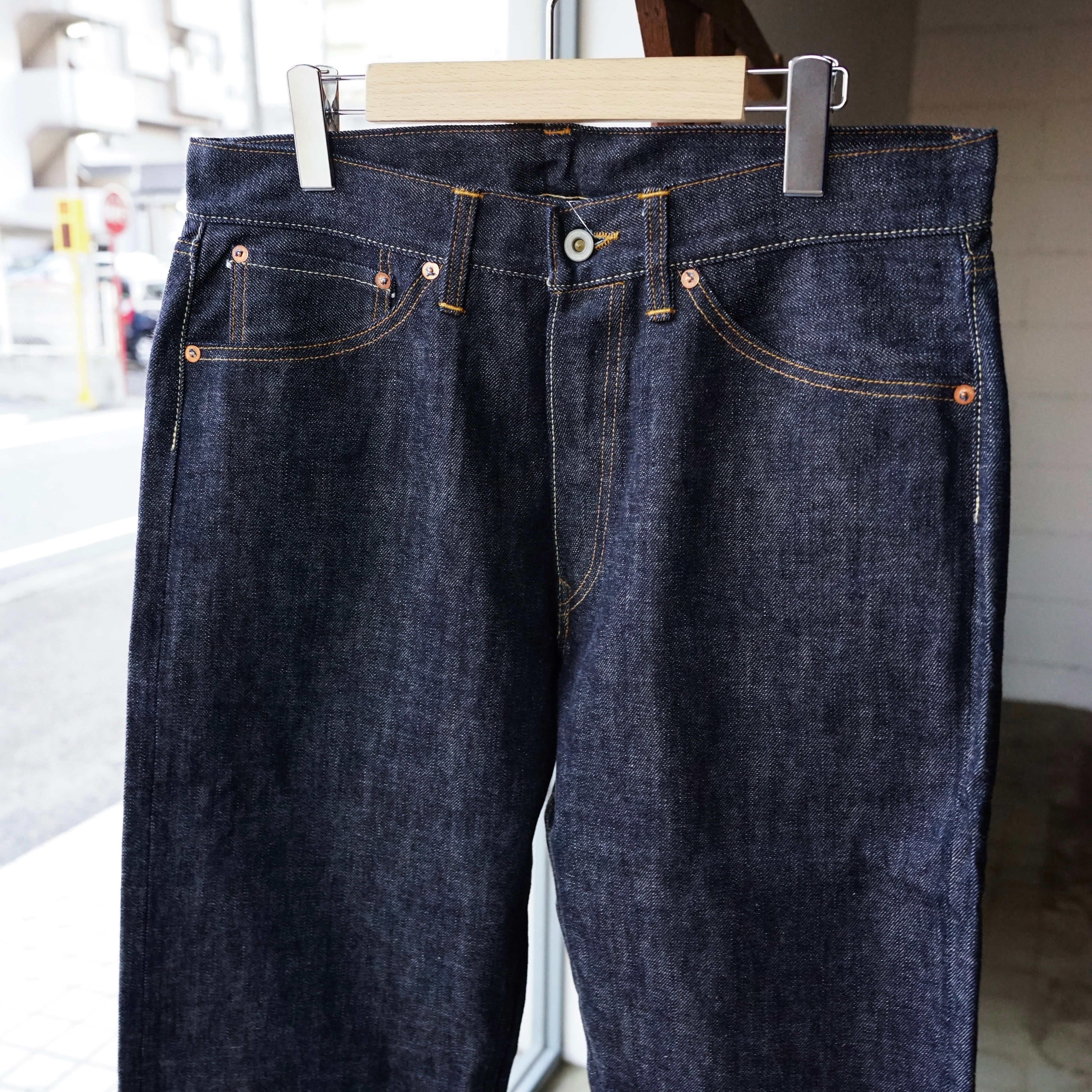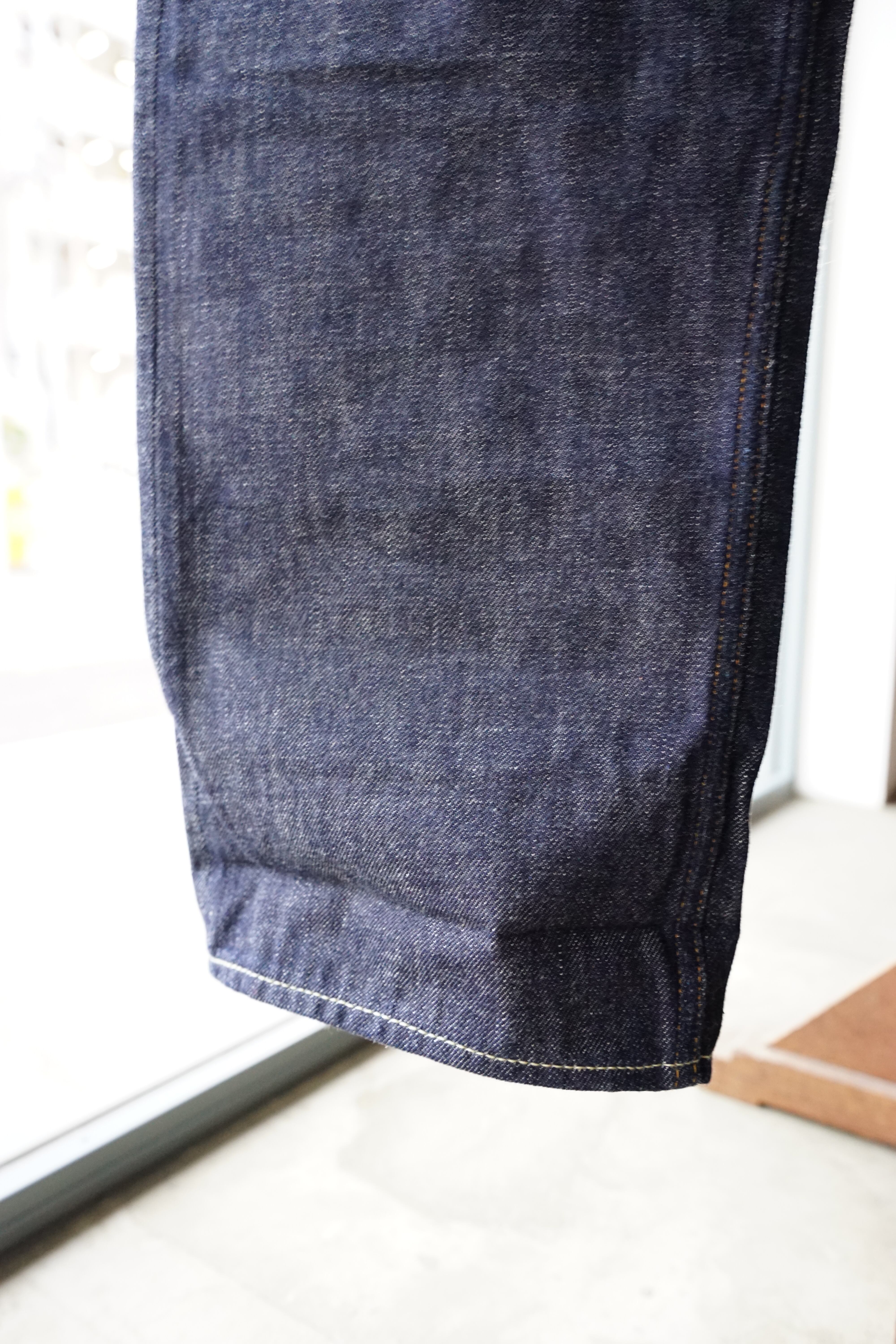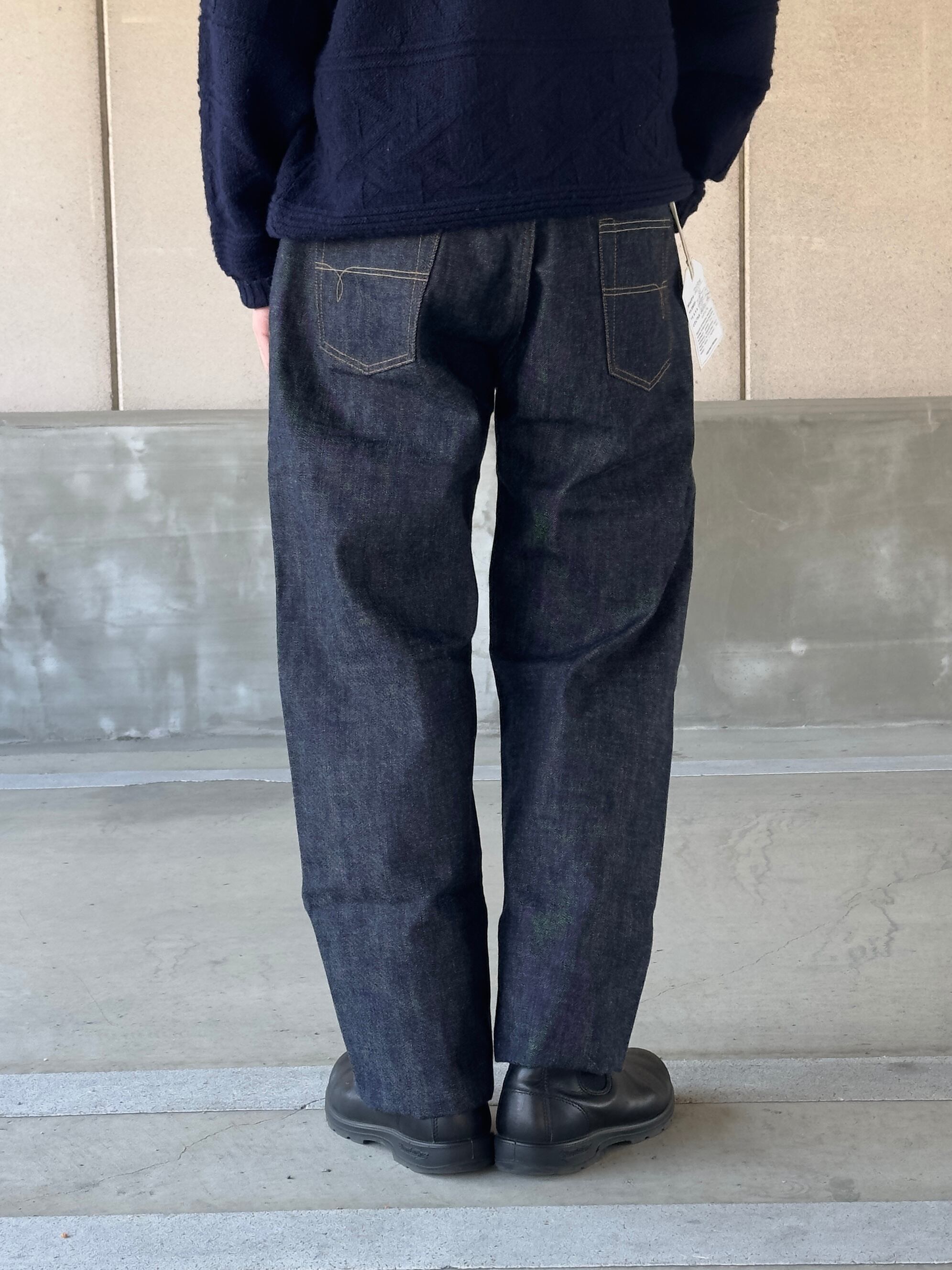 着用カットを見れば分かる通り、股上は深く、裾に向かって真っ直ぐに落ちる、これぞ「レギュラーストレート」というシルエット。この「普通であること」を一本針のヴィンテージミシンだけで、一人で縫い上げる。その執念のような手仕事の集大成が、この一本に凝縮されています。