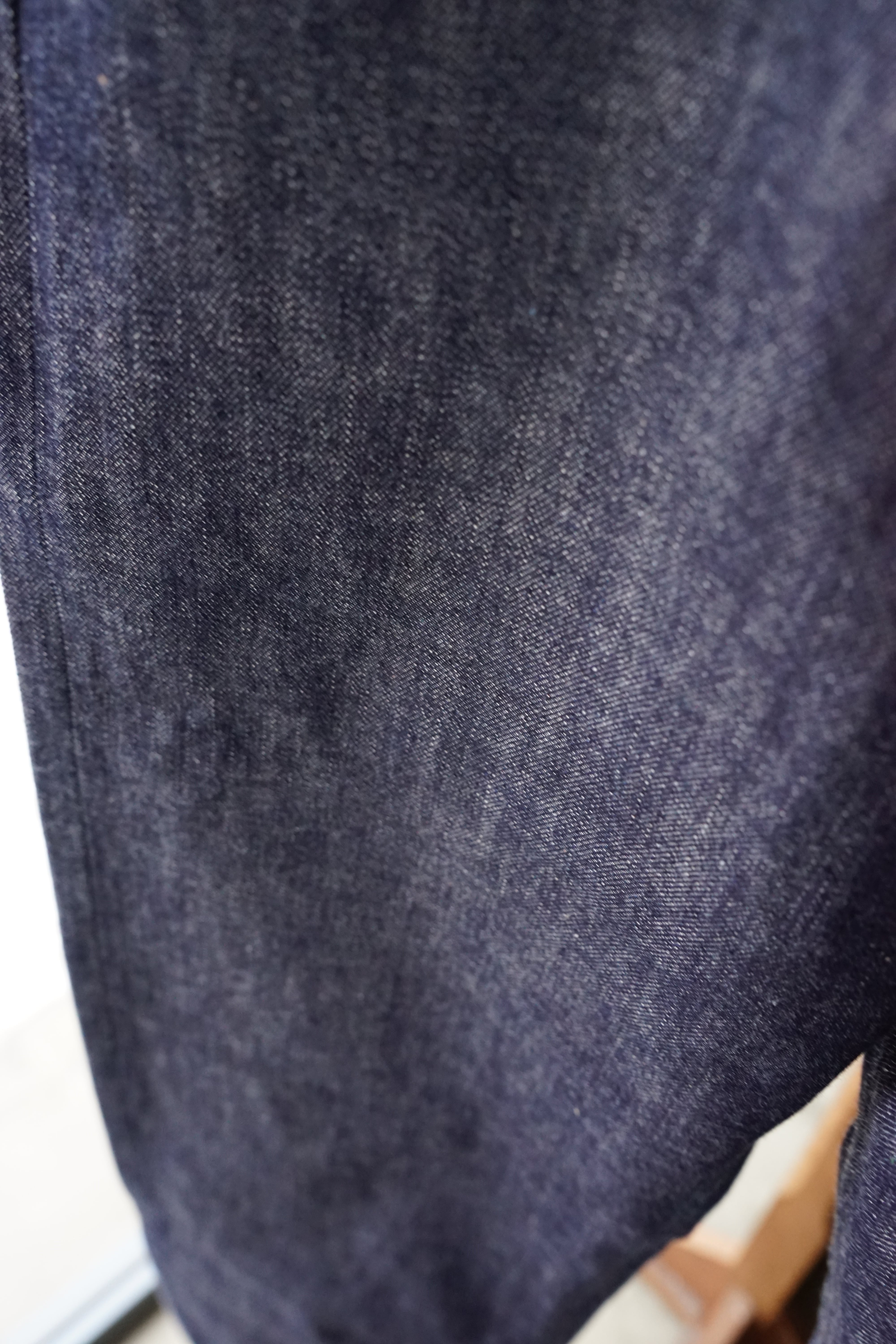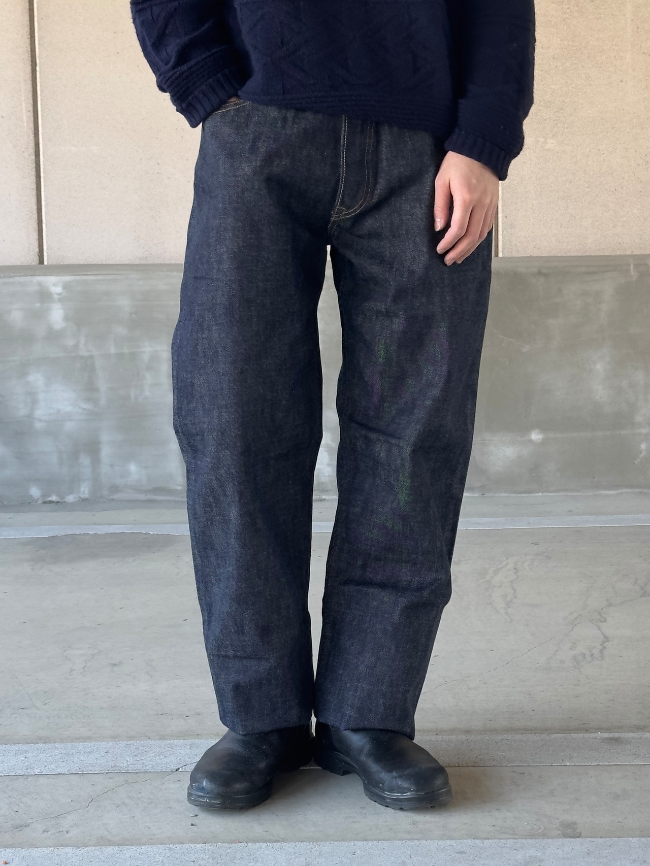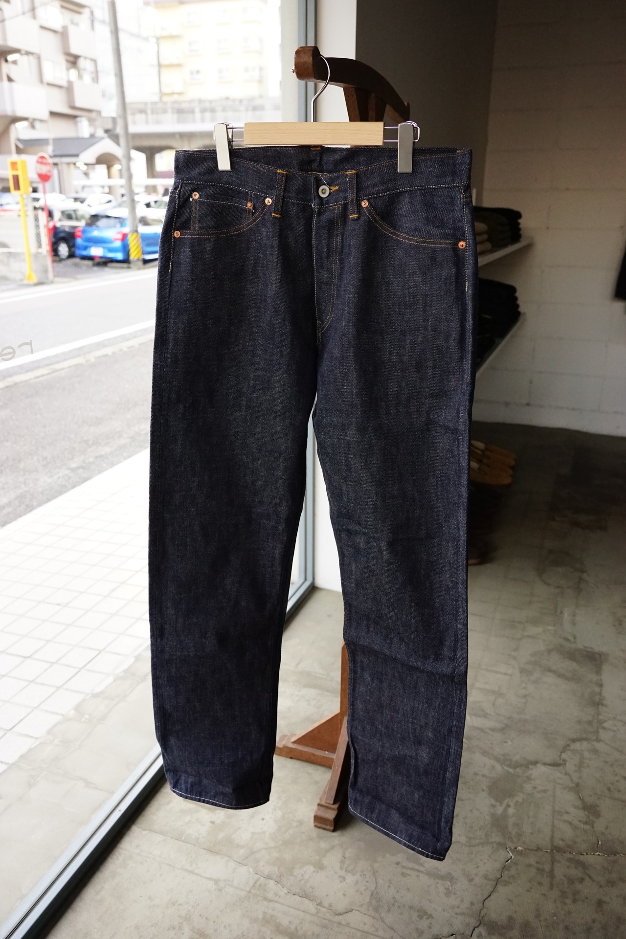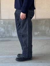 着用カットを見れば分かる通り、股上は深く、裾に向かって真っ直ぐに落ちる、これぞ「レギュラーストレート」というシルエット。この「普通であること」を一本針のヴィンテージミシンだけで、一人で縫い上げる。その執念のような手仕事の集大成が、この一本に凝縮されています。