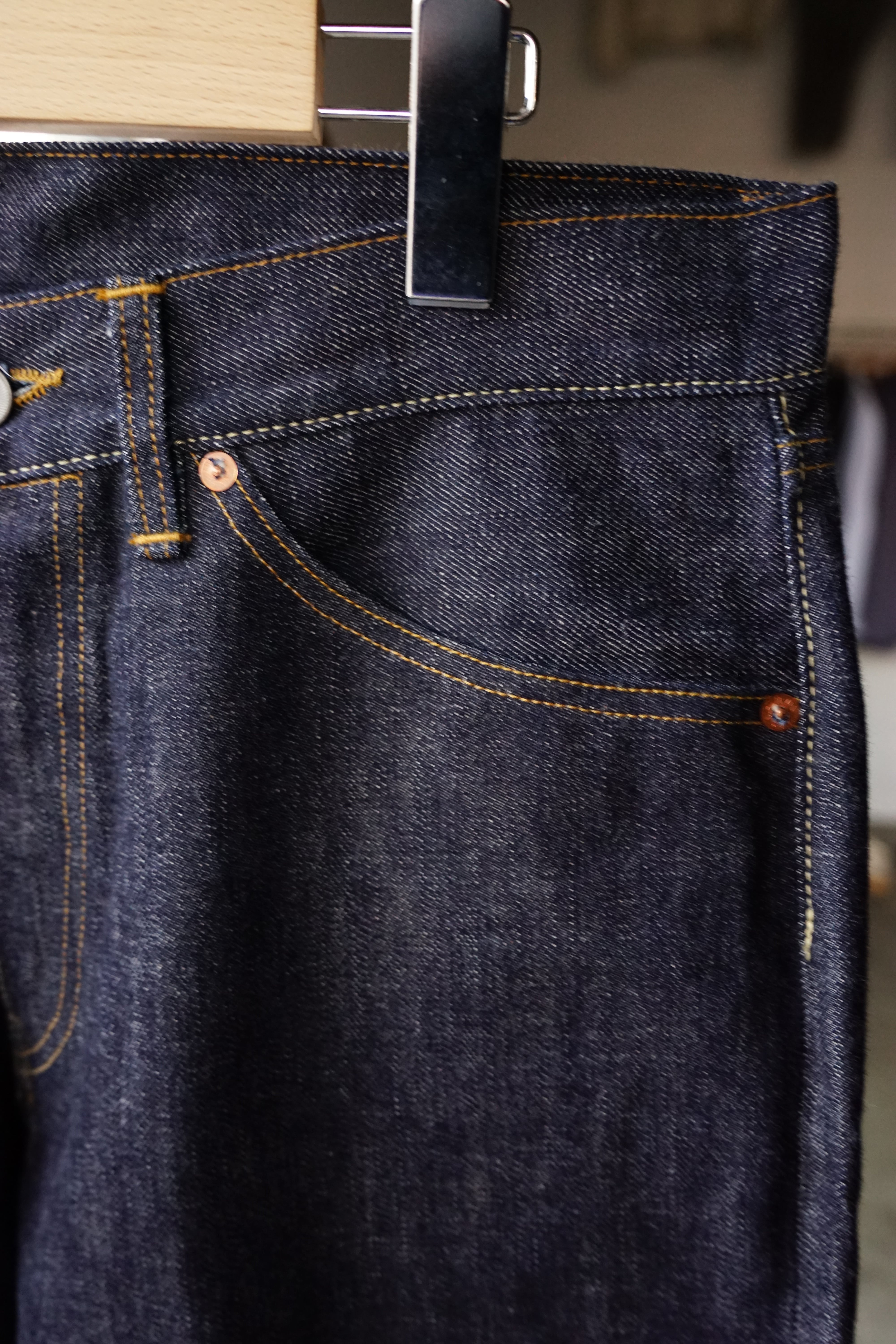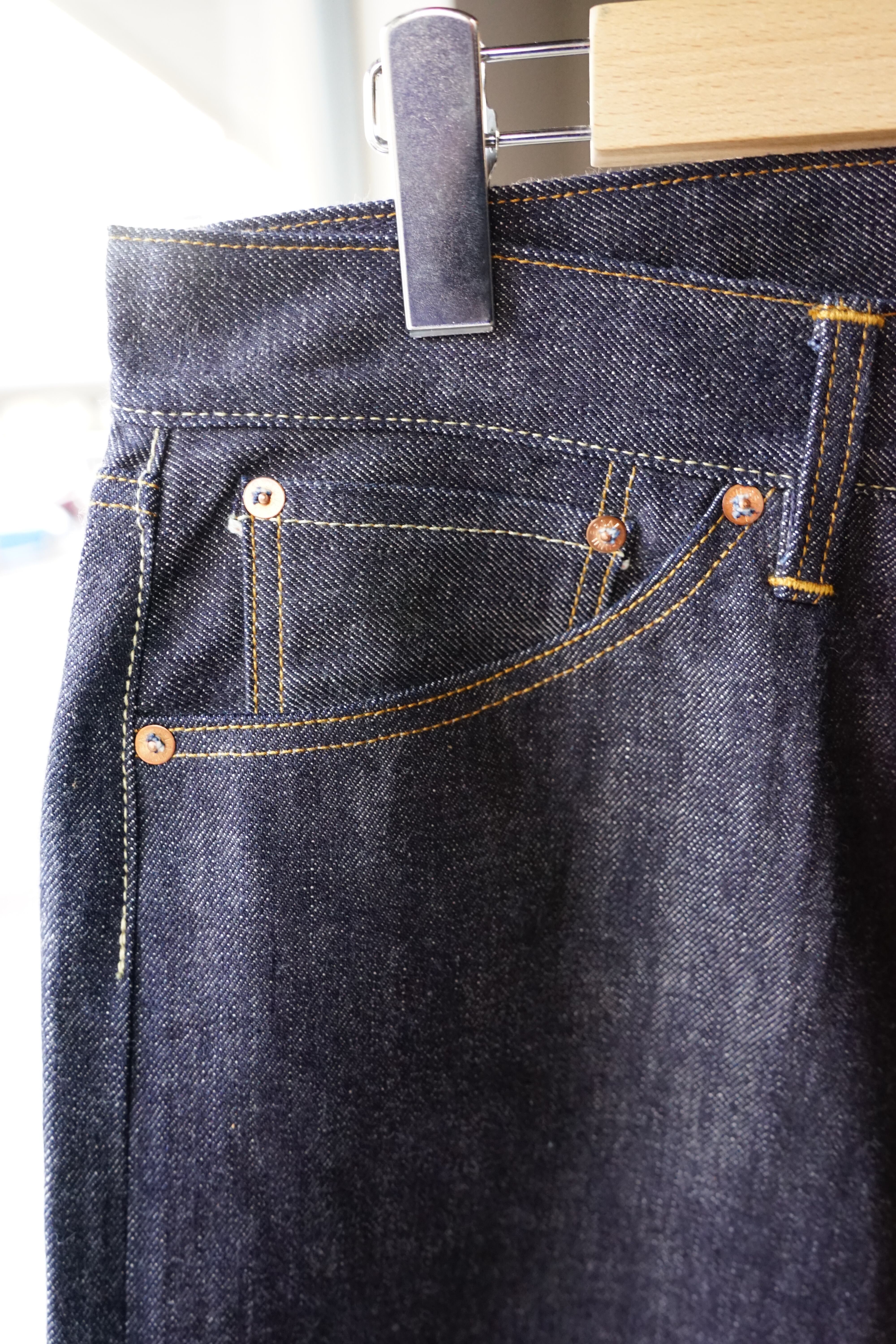 これまでのモデル(#805や#806)のようなシンチバックや変わったポケット形状を排除し、極めてシンプルな5ポケット仕様に徹しています。
