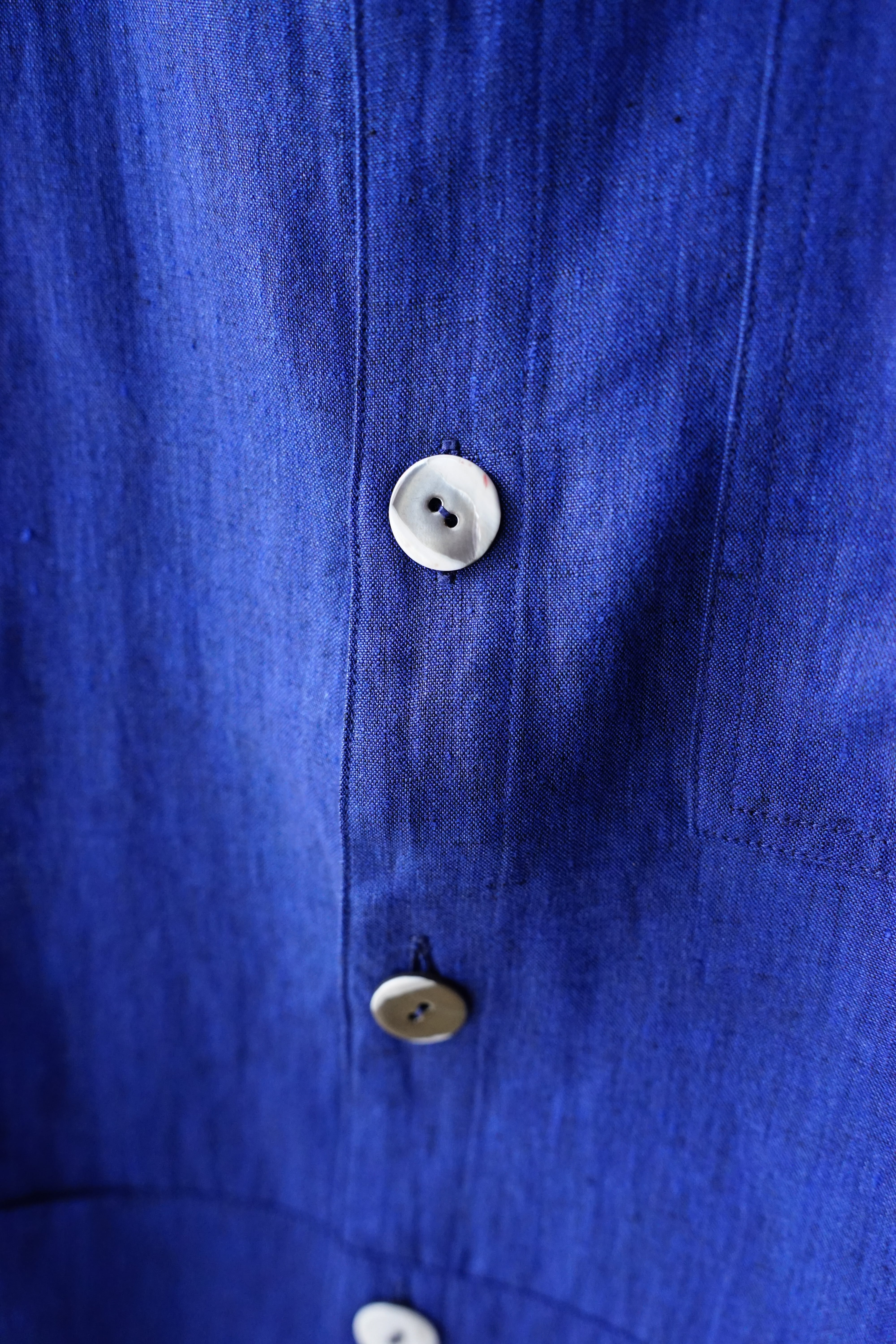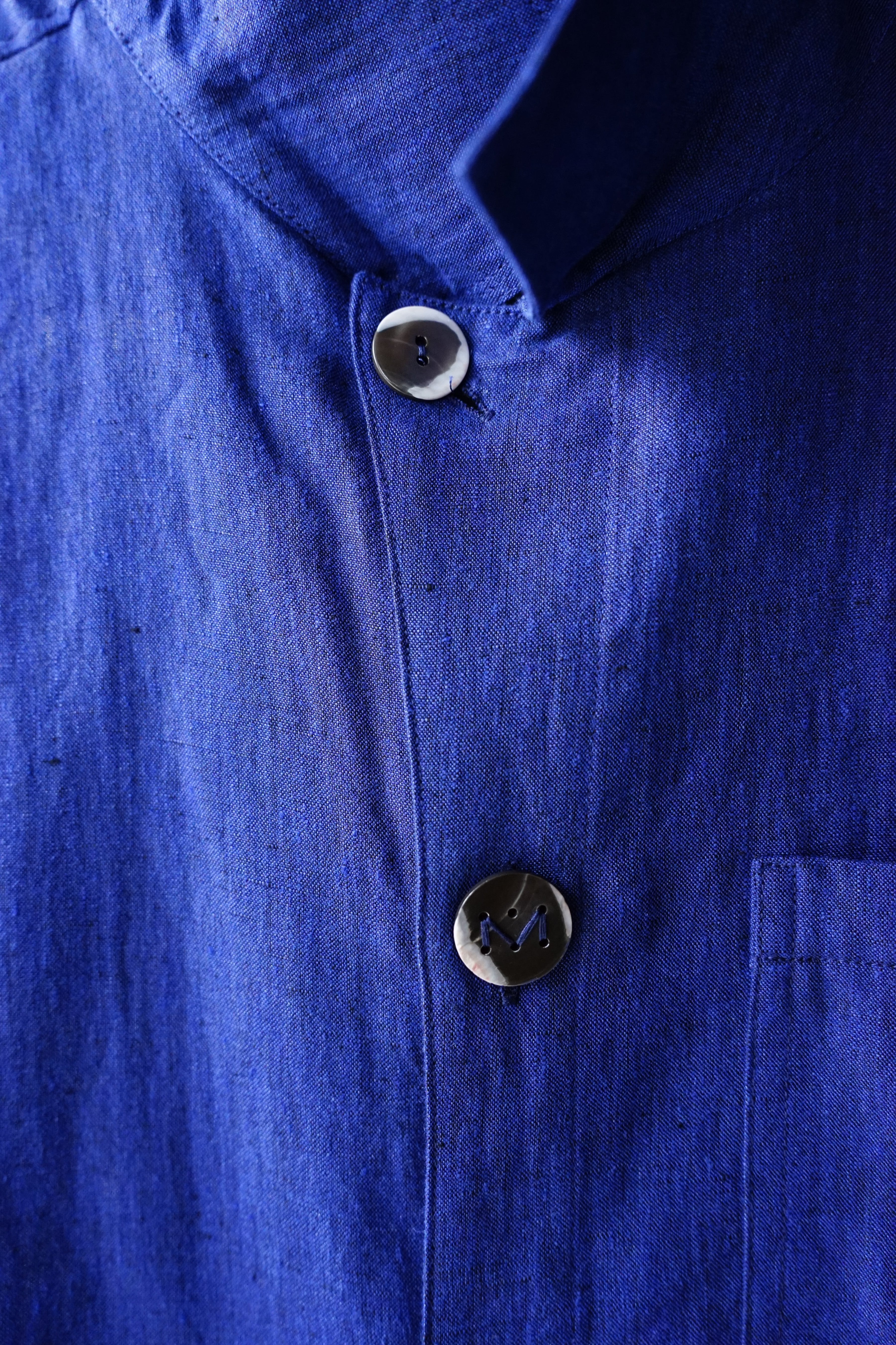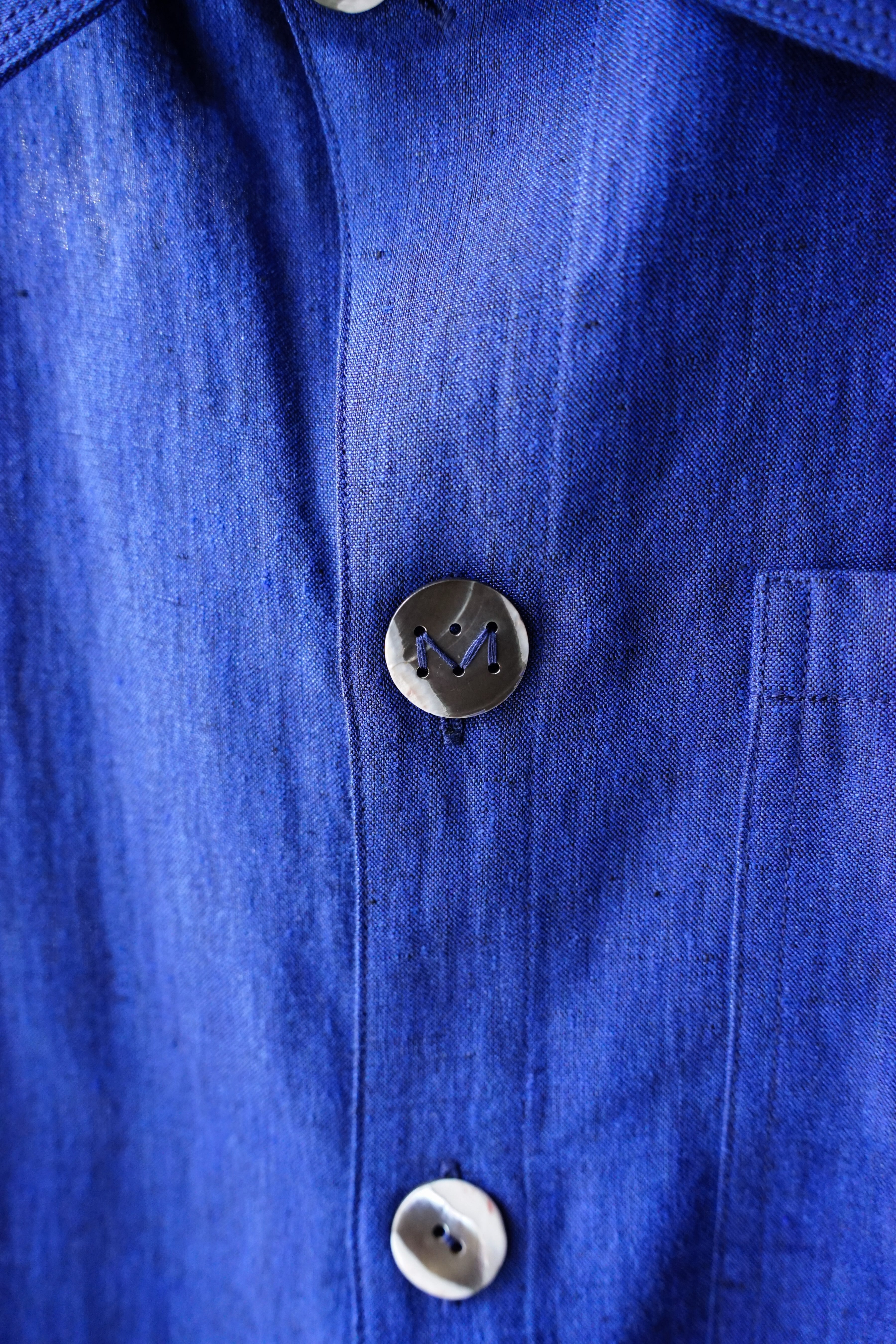 ボタンには希少なトロカスシェルを使用しており、天然素材ならではの美しい光沢が、鮮やかなブルーのリネン生地と絶妙なコントラストを生み出しています。