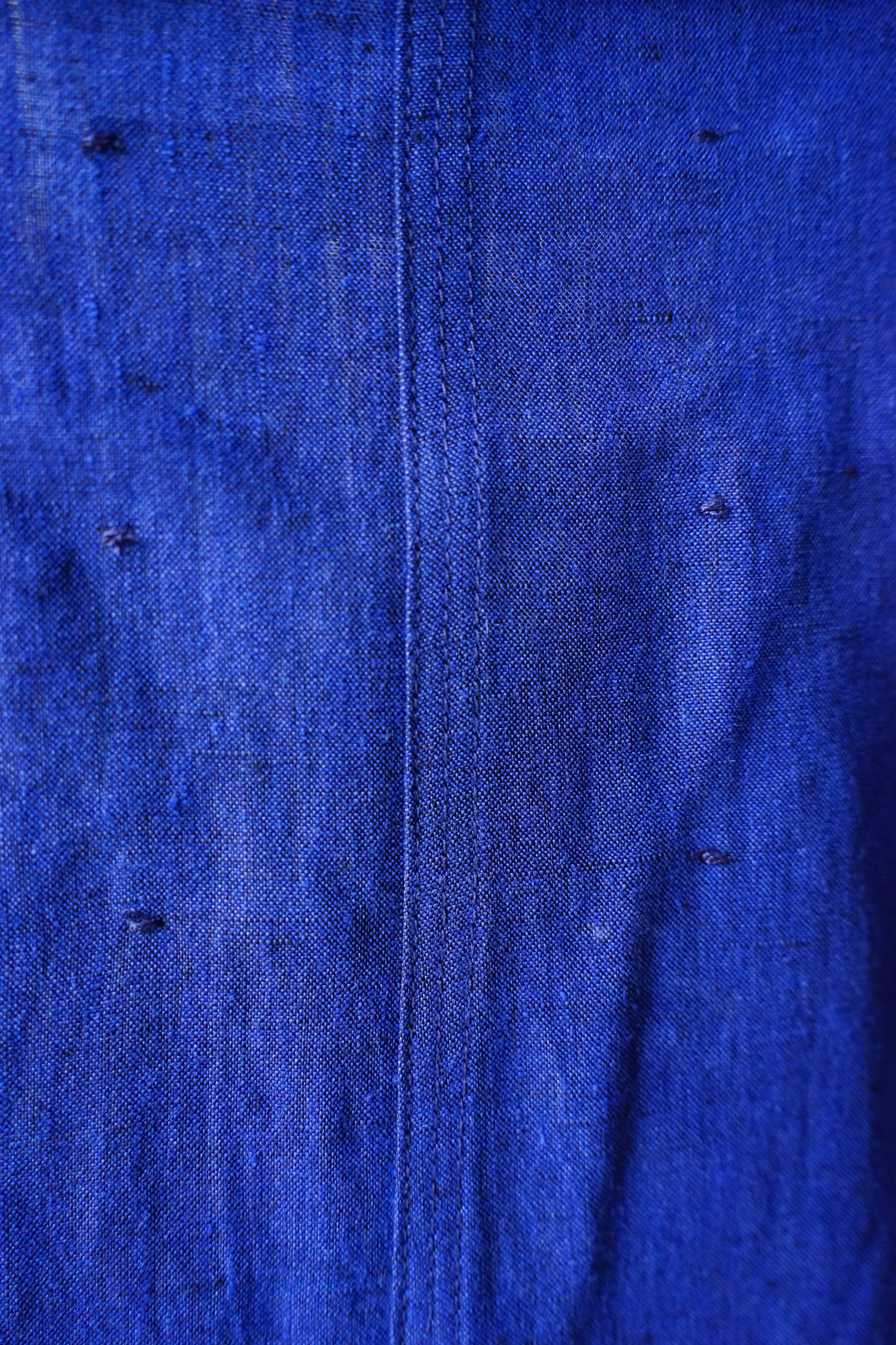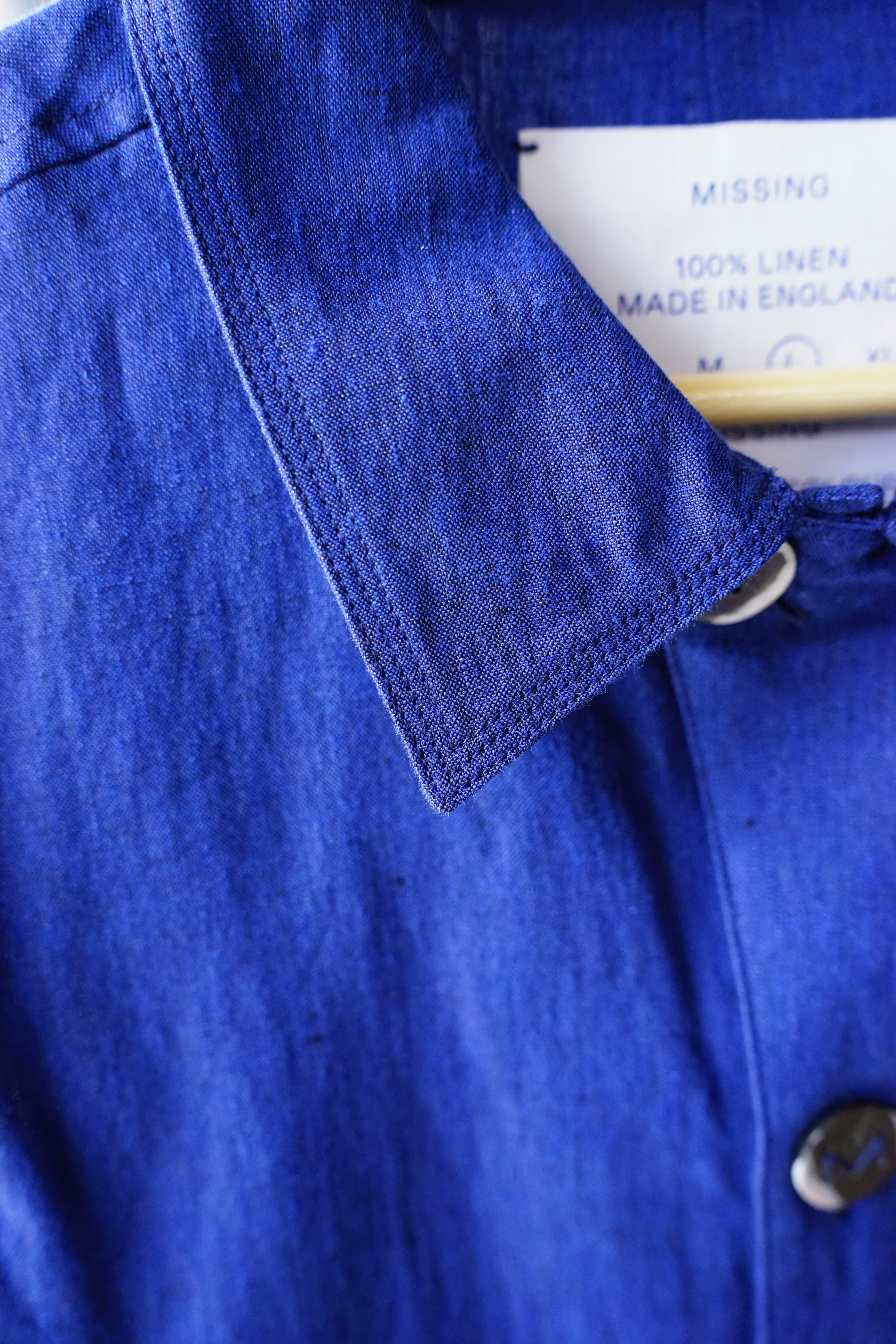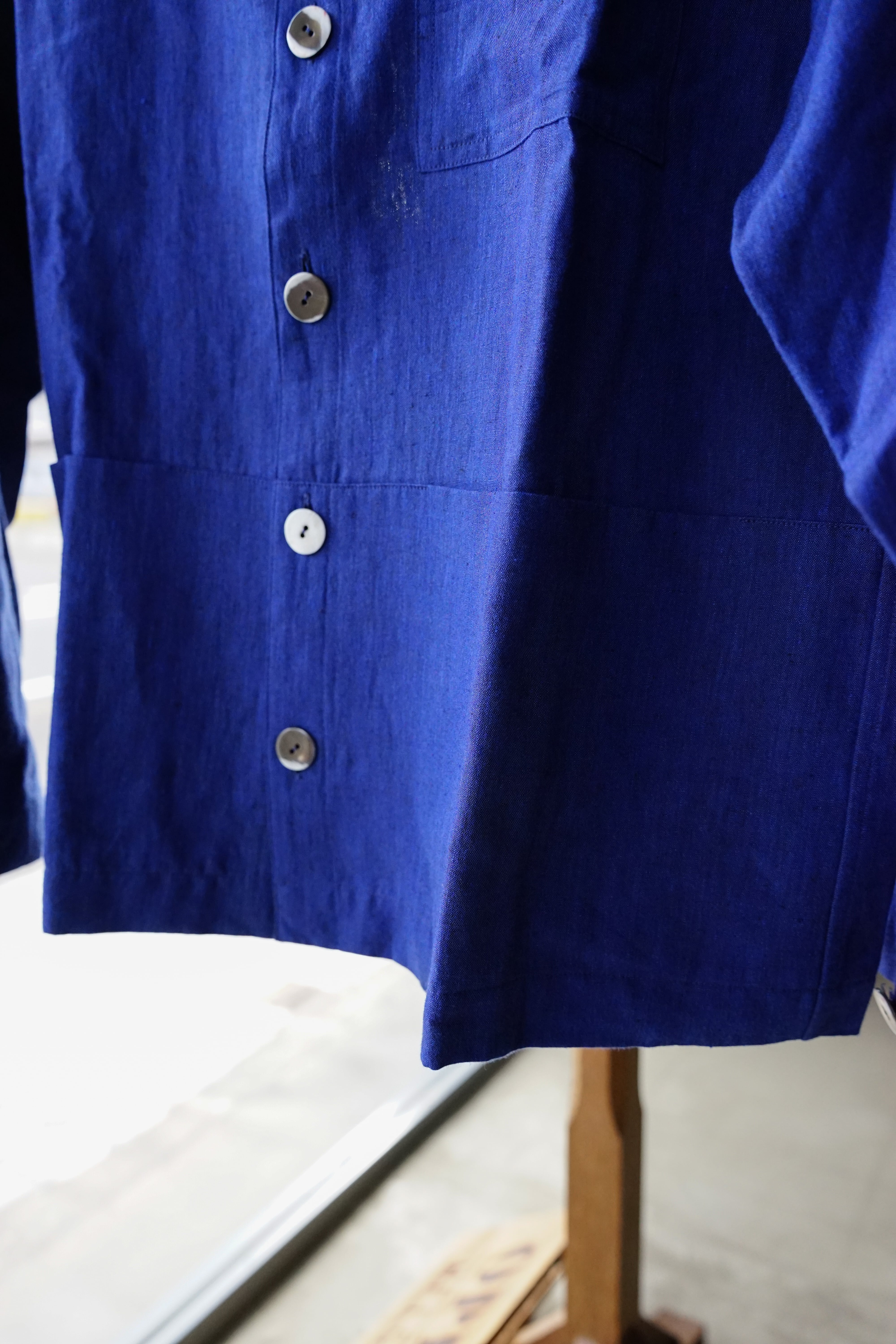 ボタンには希少なトロカスシェルを使用しており、天然素材ならではの美しい光沢が、鮮やかなブルーのリネン生地と絶妙なコントラストを生み出しています。
