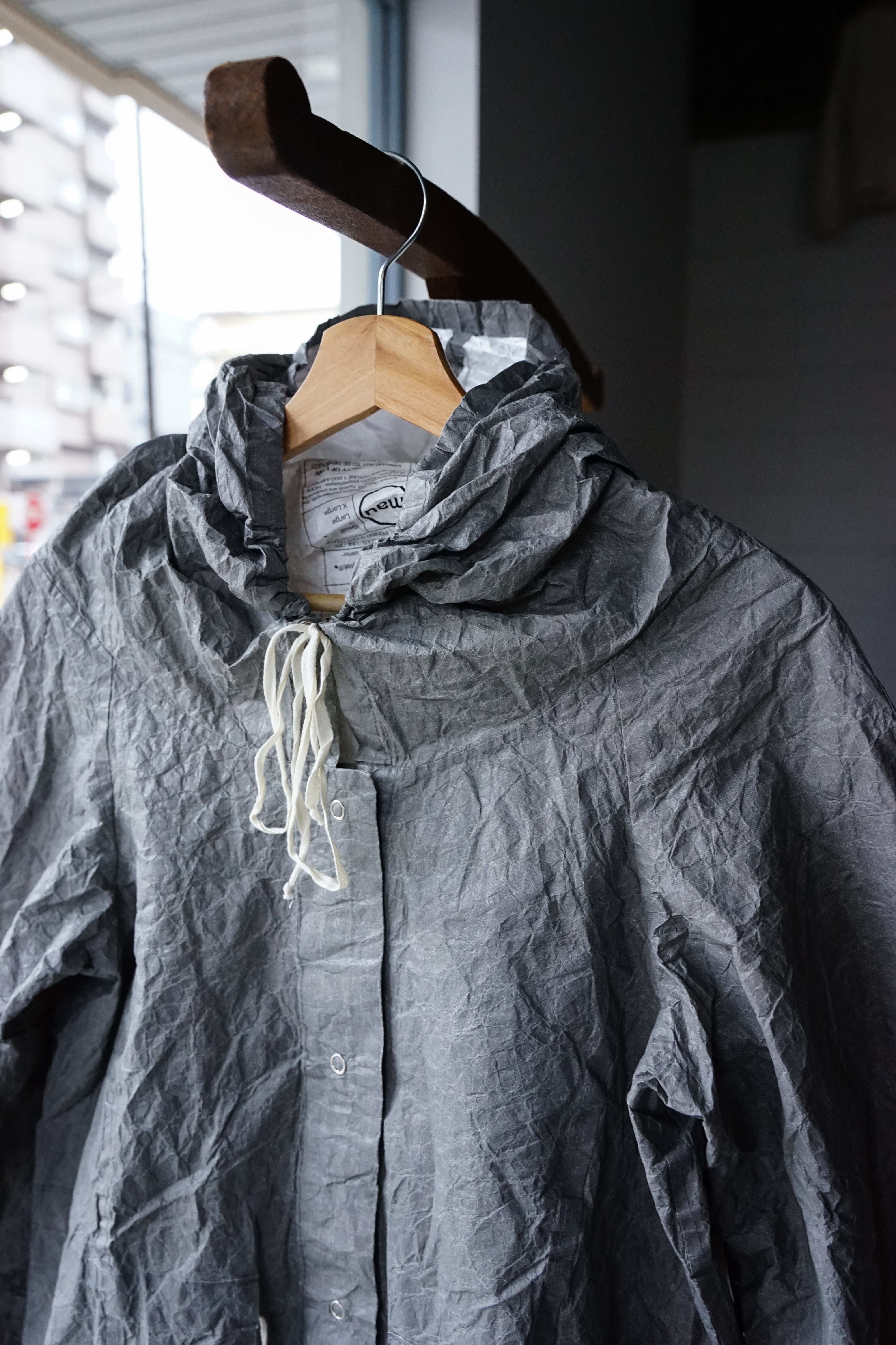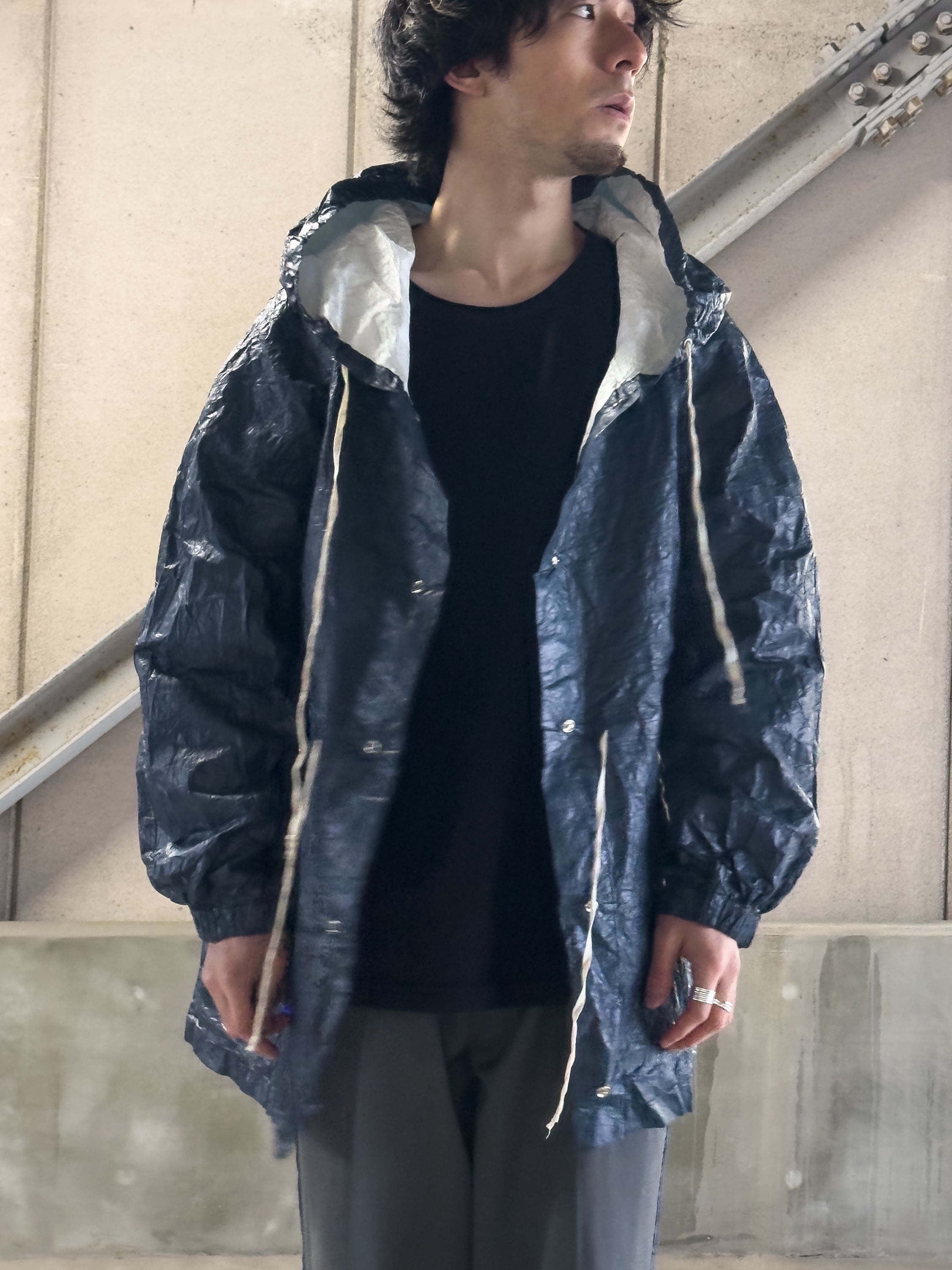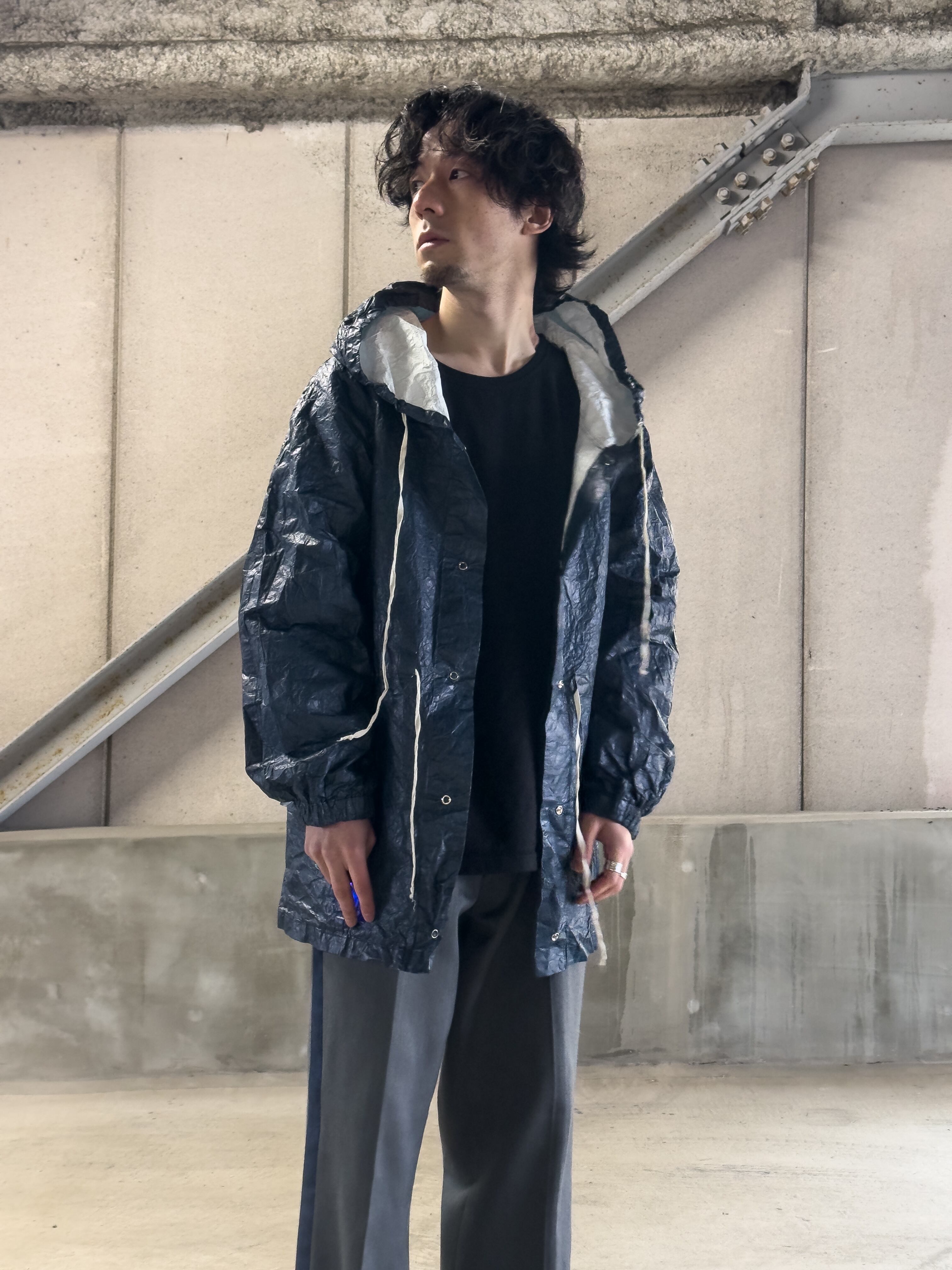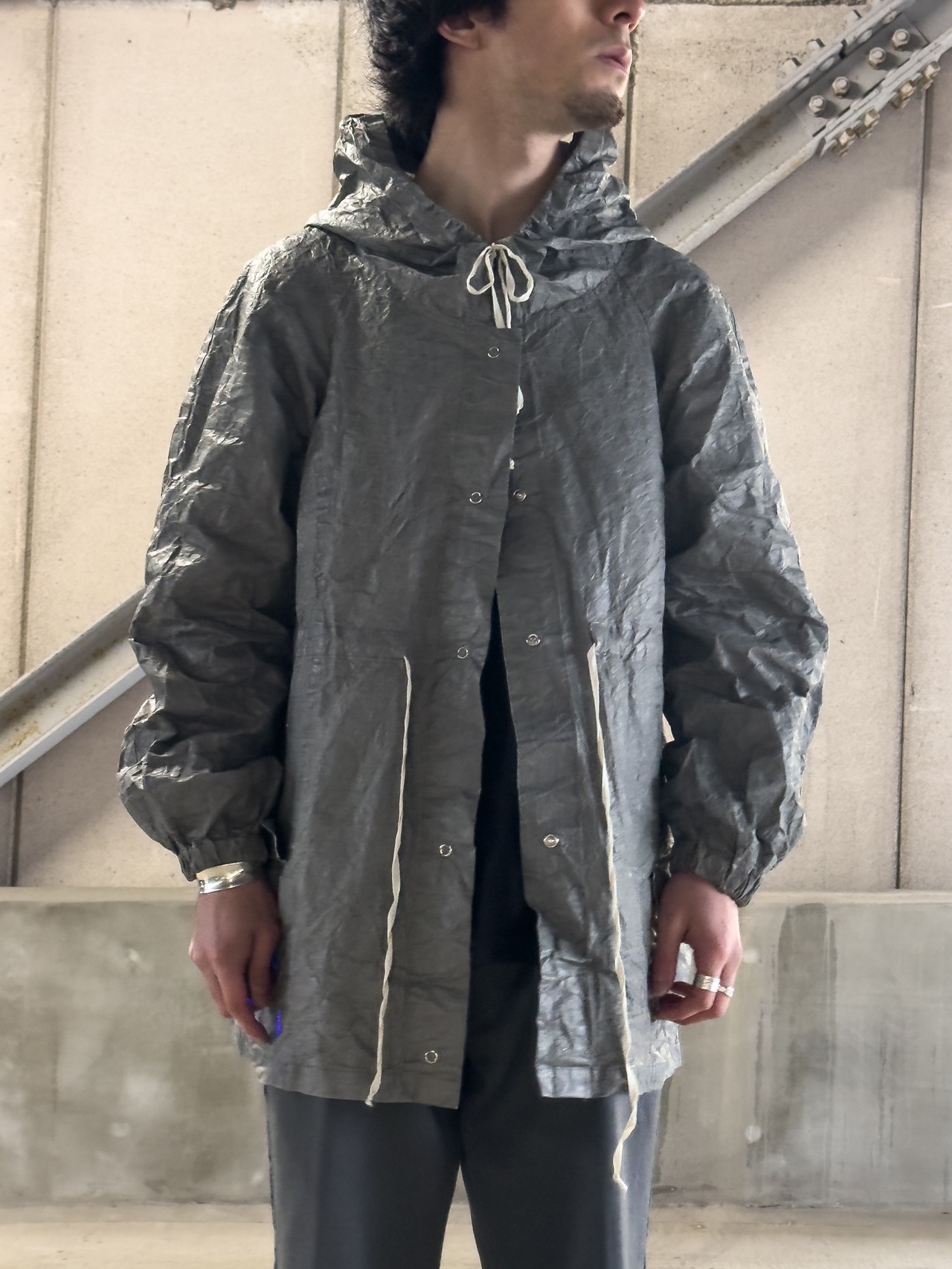 フロントに並ぶスナップボタンや、素朴な風合いの生成りのドローコードといった細部が、無機質な工業素材の中にどこか「手仕事の跡」を感じさせ、大人の日常に馴染む奥行きを与えています。