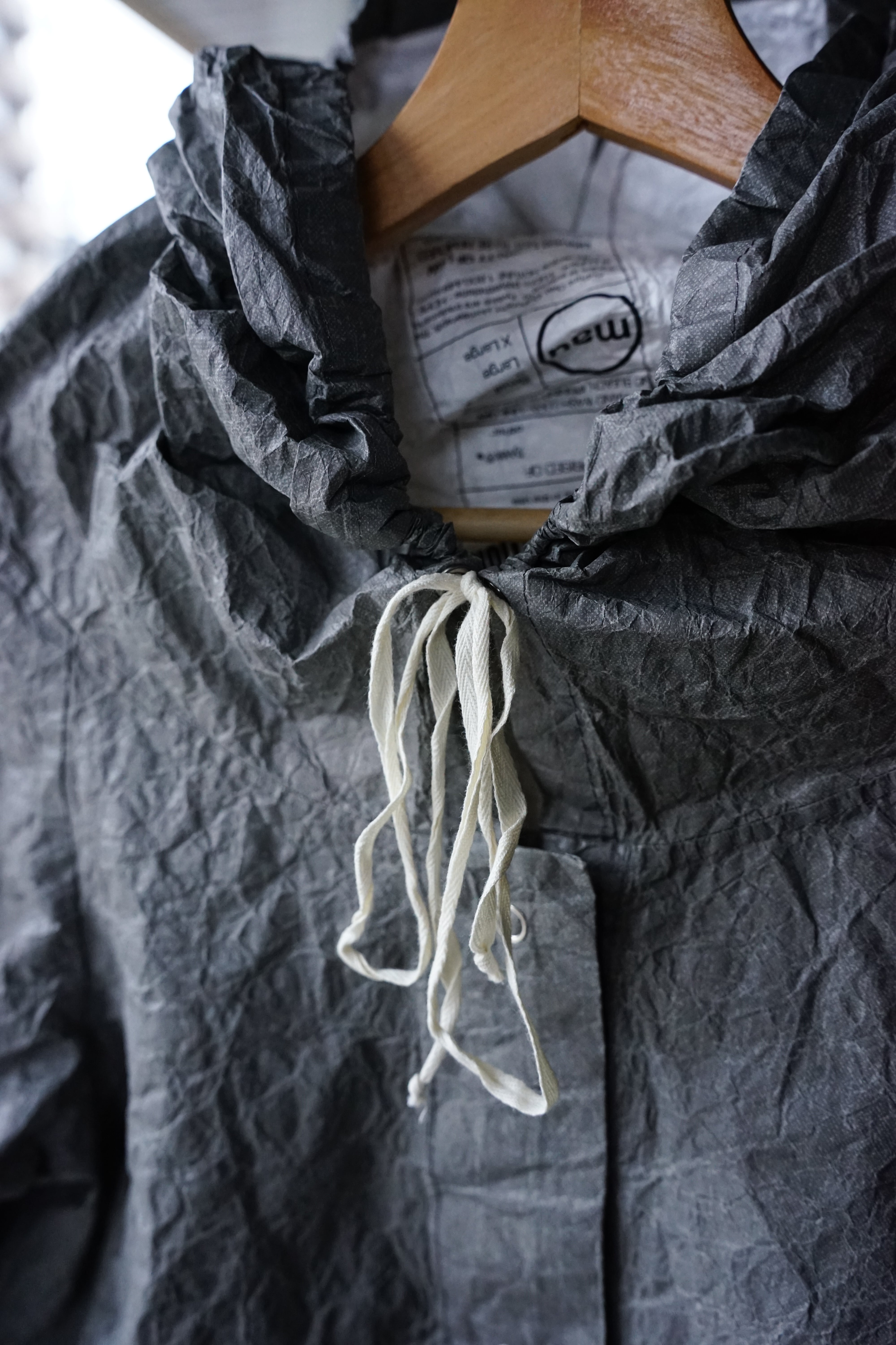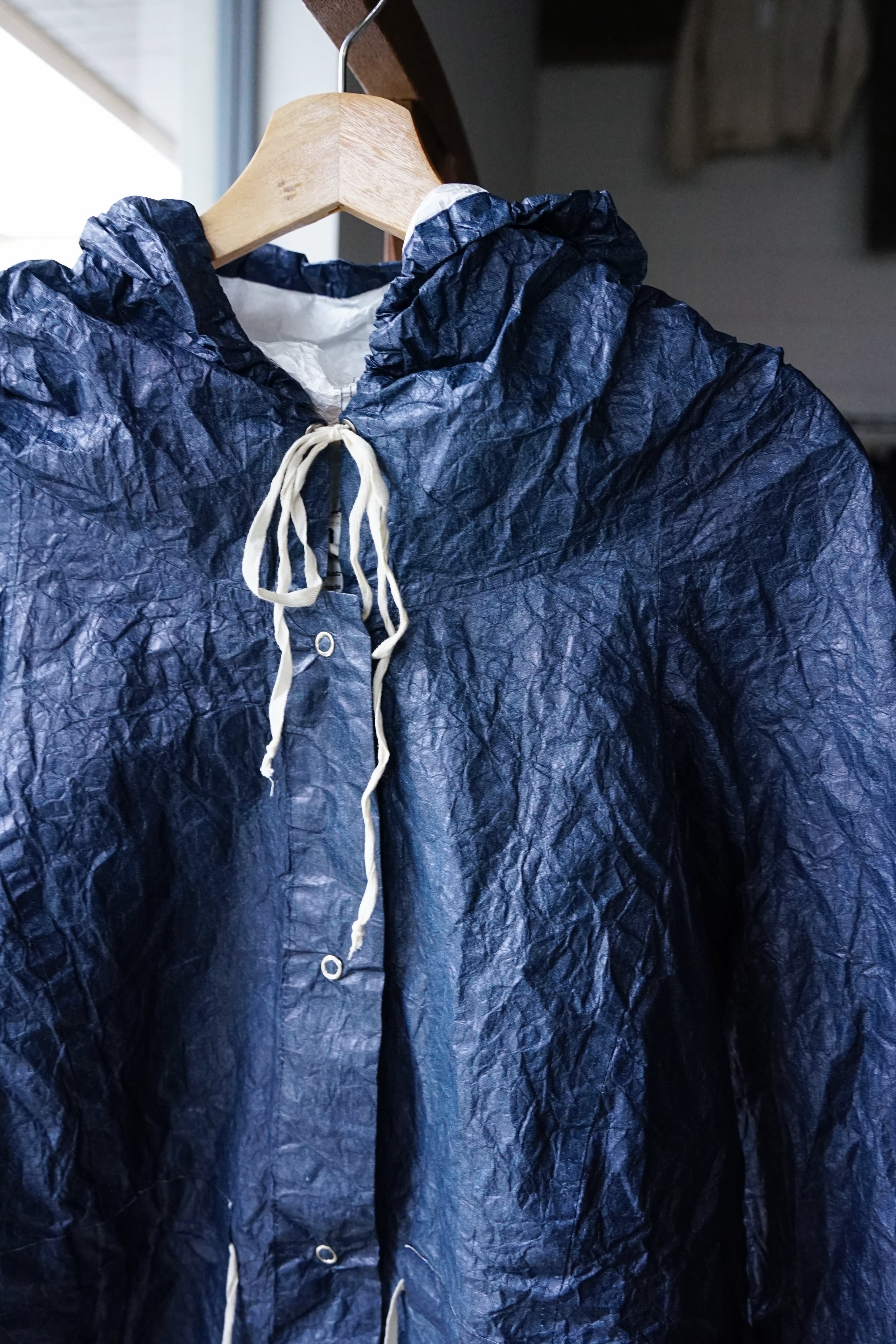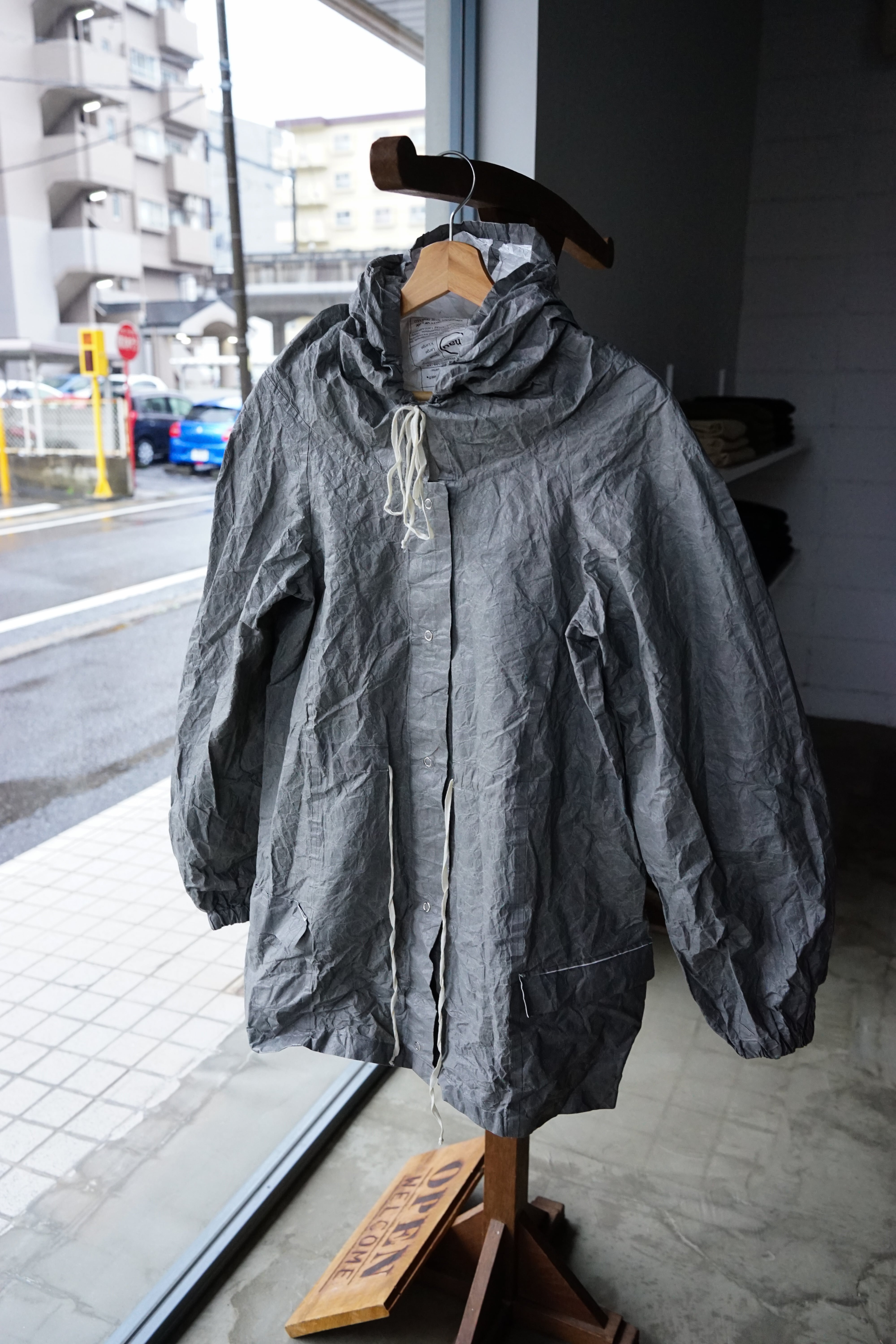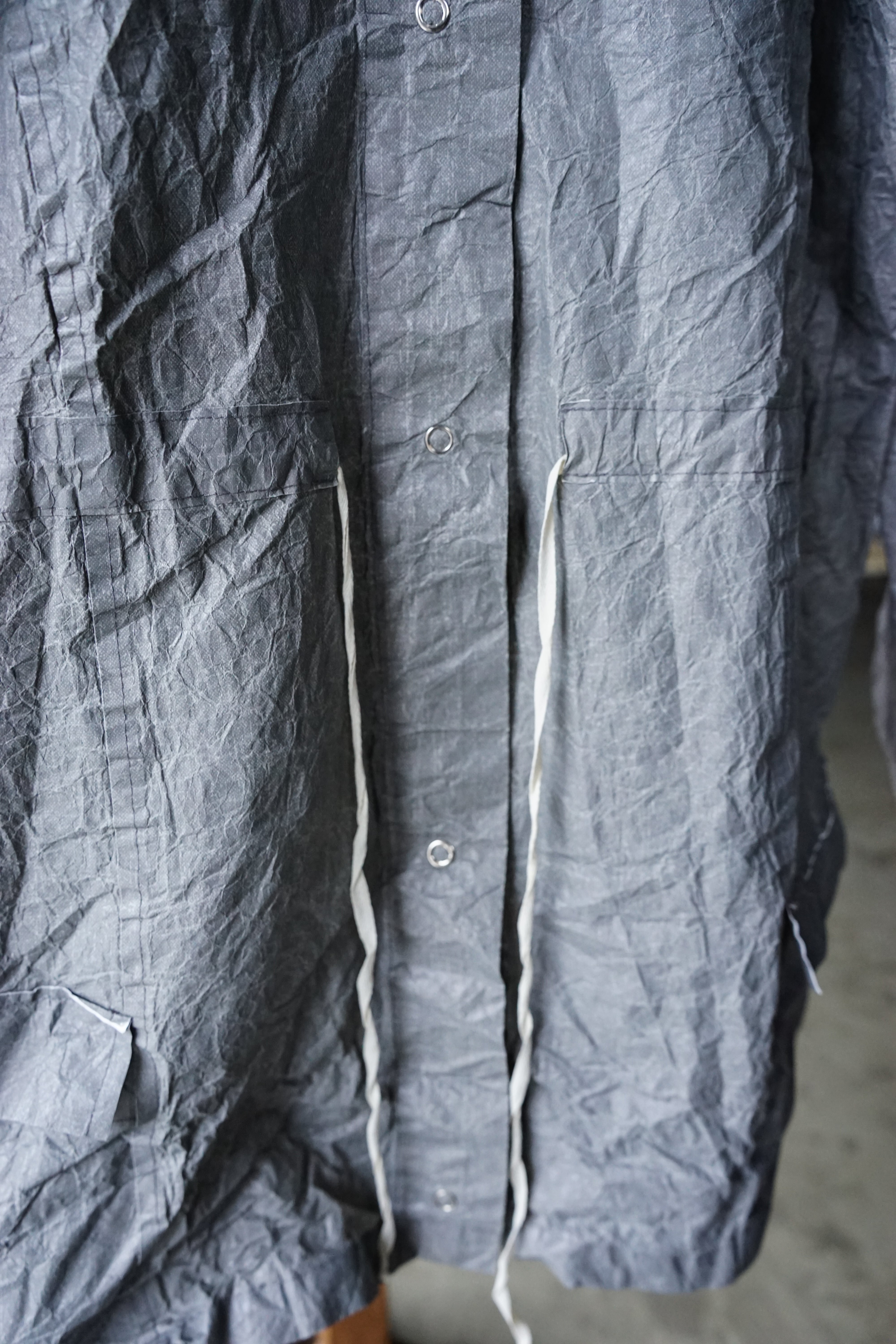 フロントに並ぶスナップボタンや、素朴な風合いの生成りのドローコードといった細部が、無機質な工業素材の中にどこか「手仕事の跡」を感じさせ、大人の日常に馴染む奥行きを与えています。