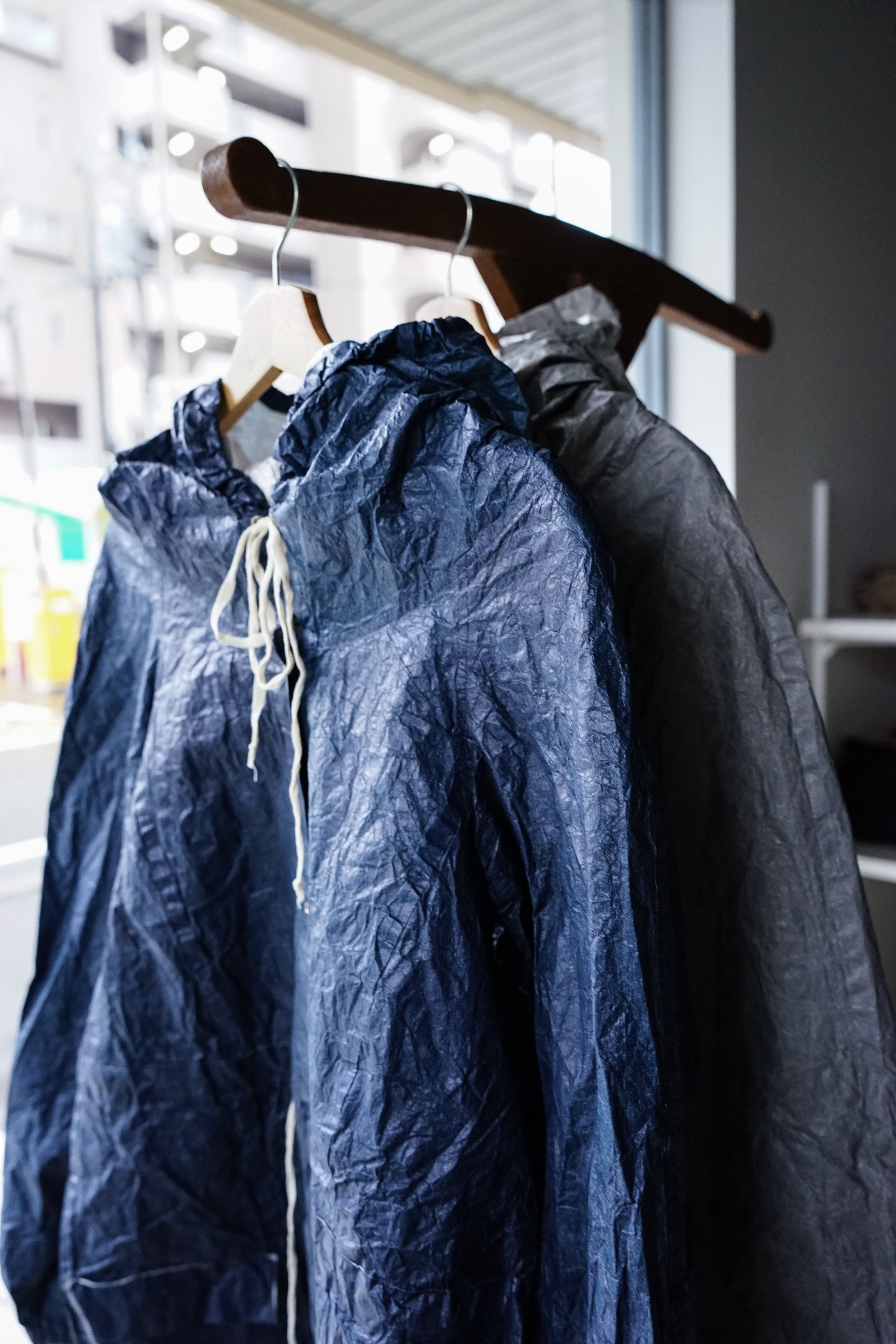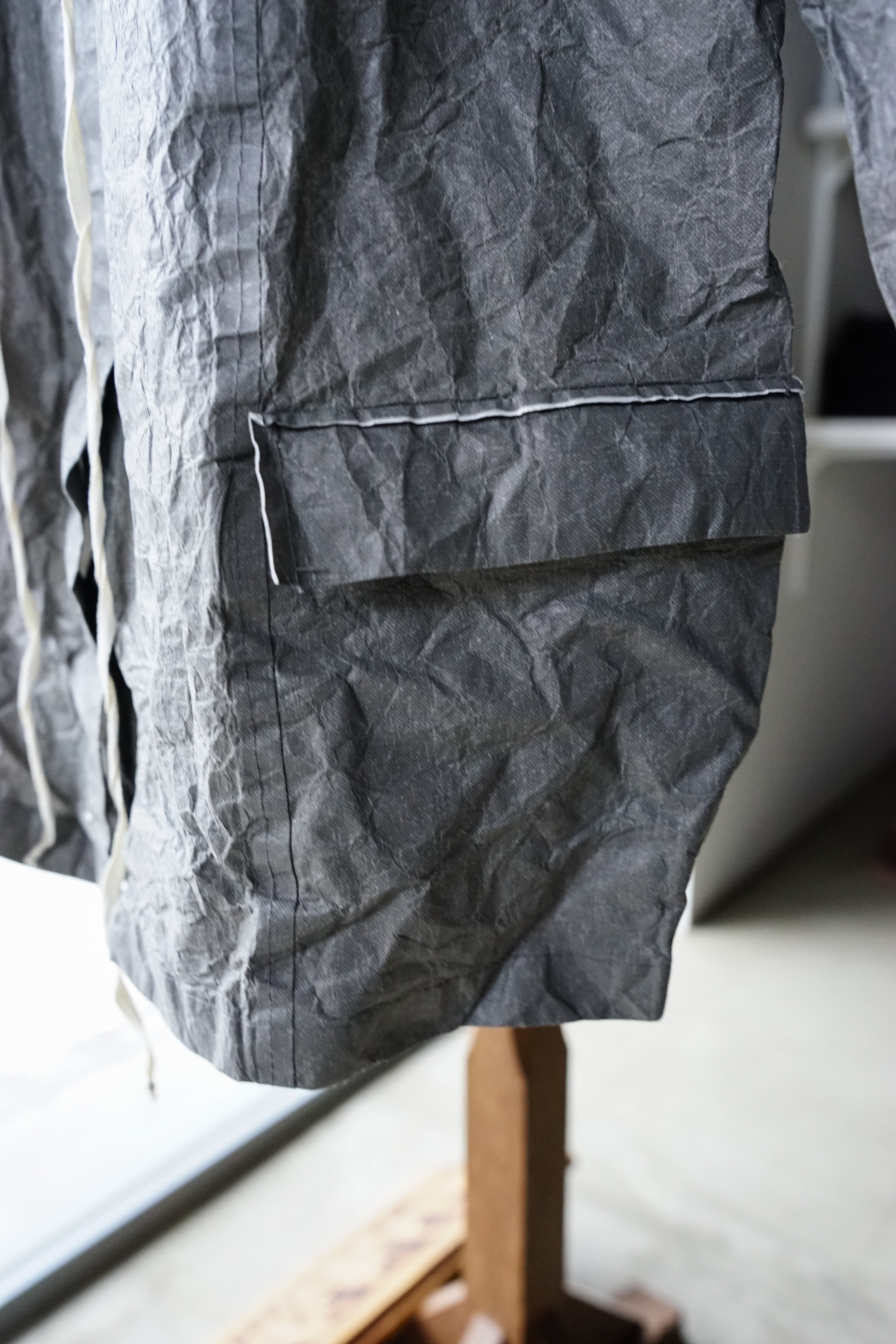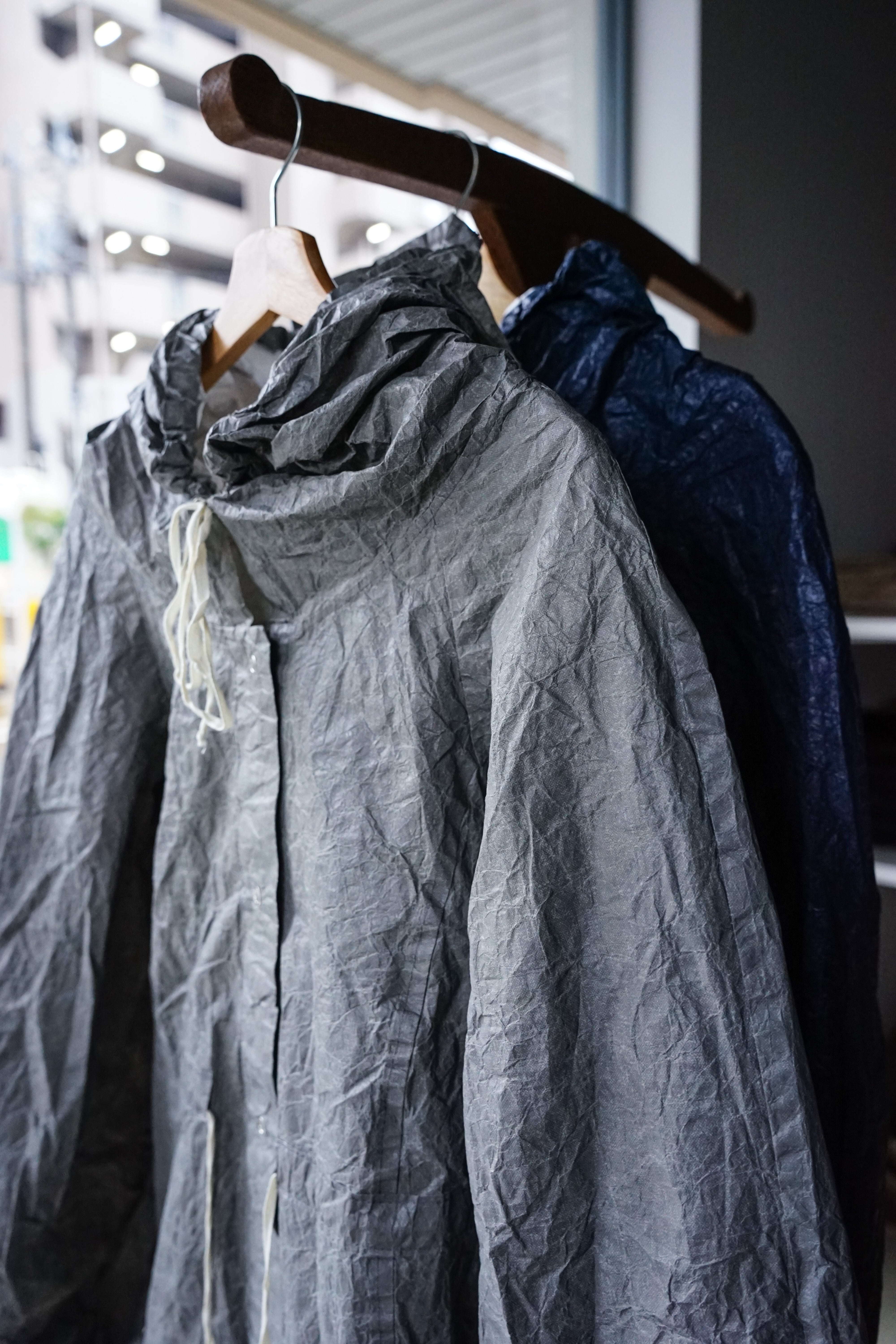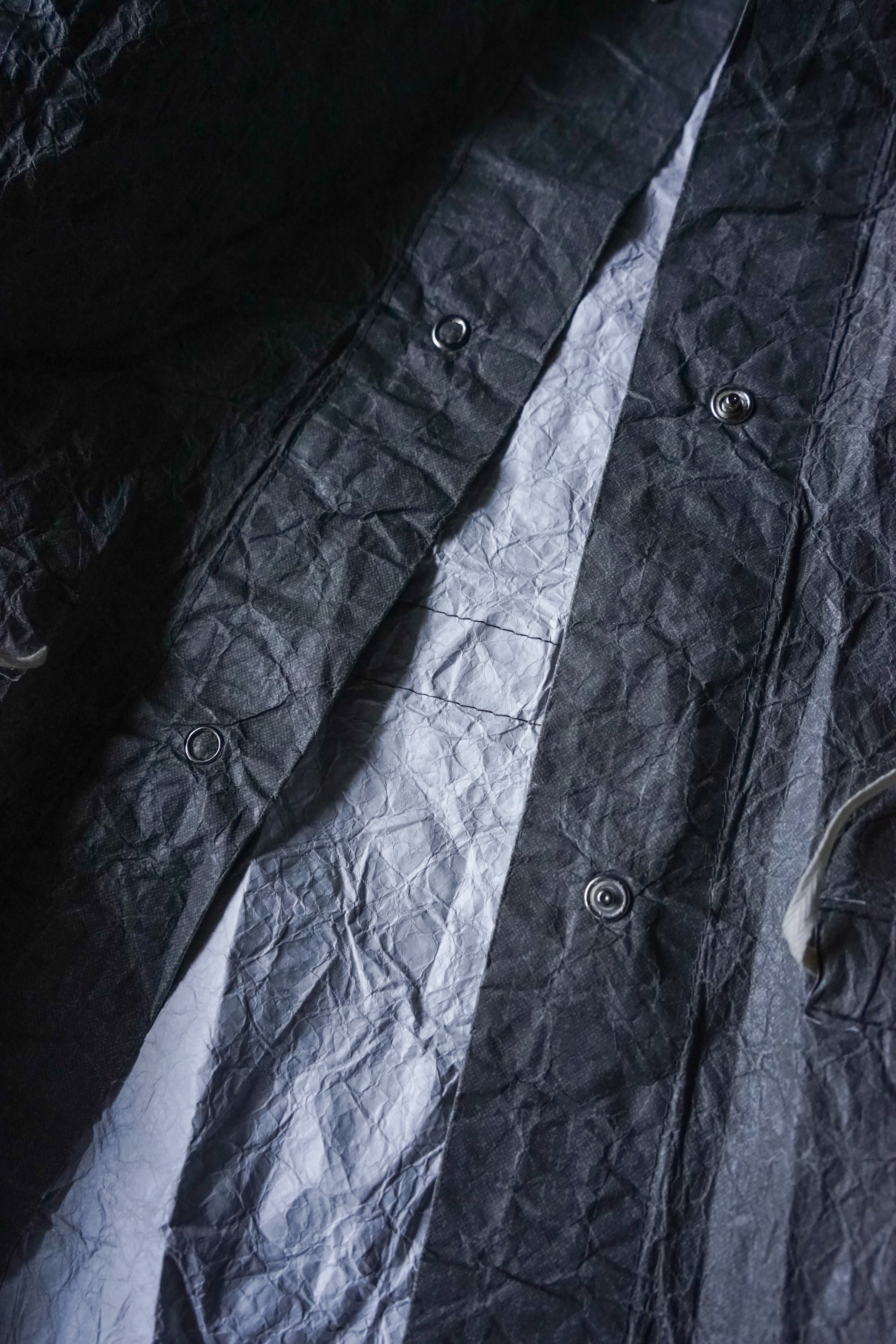 フロントに並ぶスナップボタンや、素朴な風合いの生成りのドローコードといった細部が、無機質な工業素材の中にどこか「手仕事の跡」を感じさせ、大人の日常に馴染む奥行きを与えています。