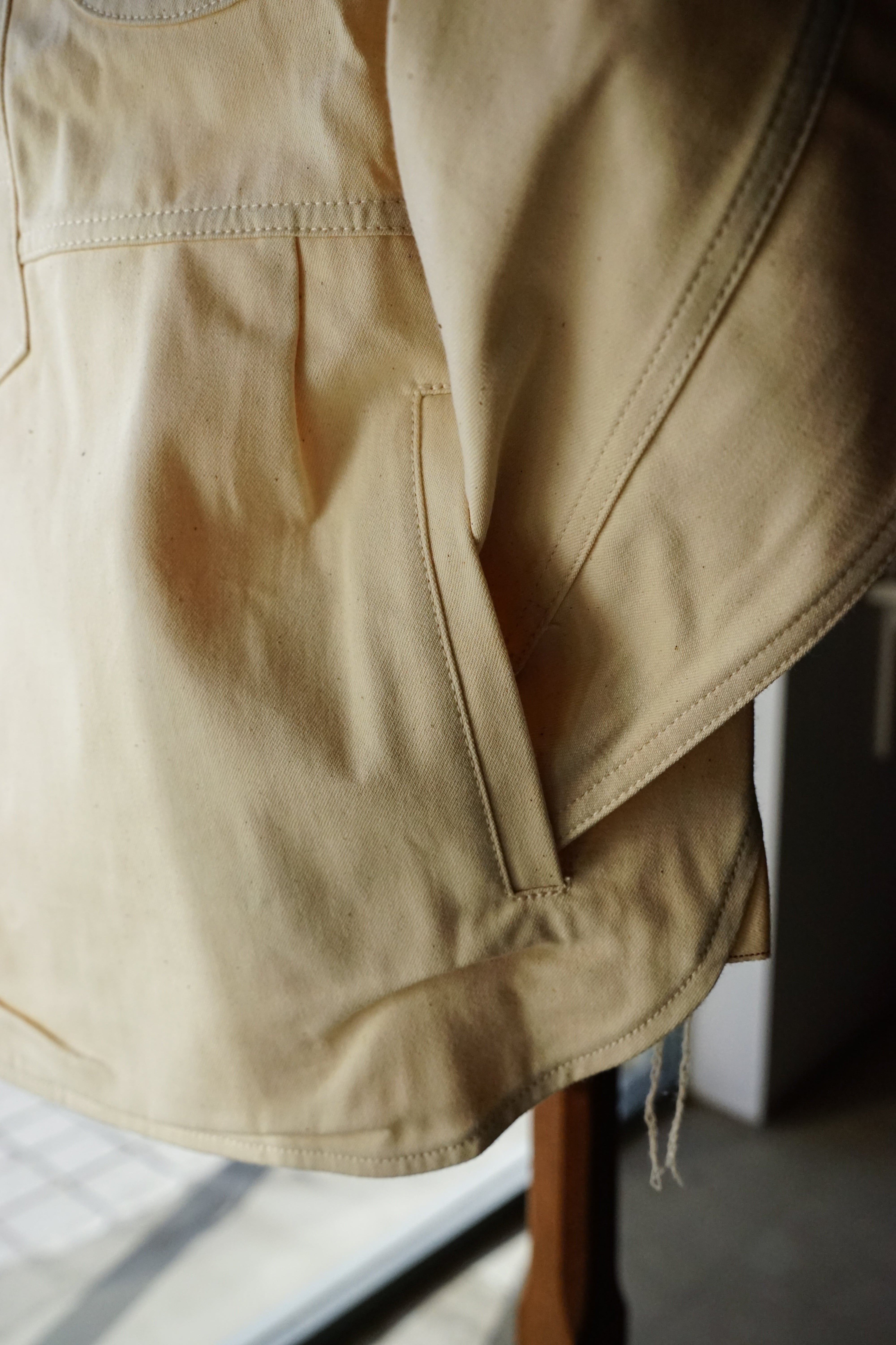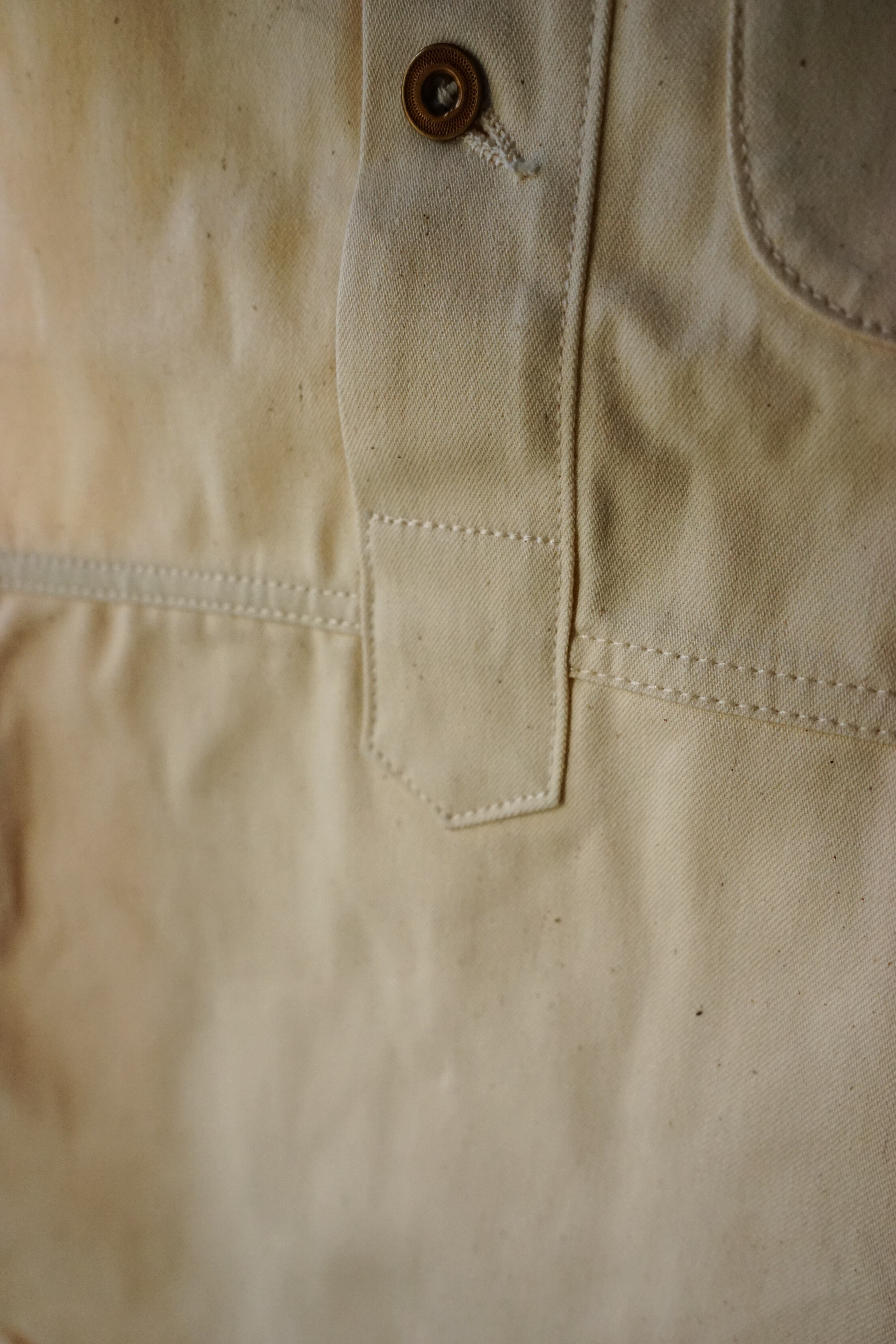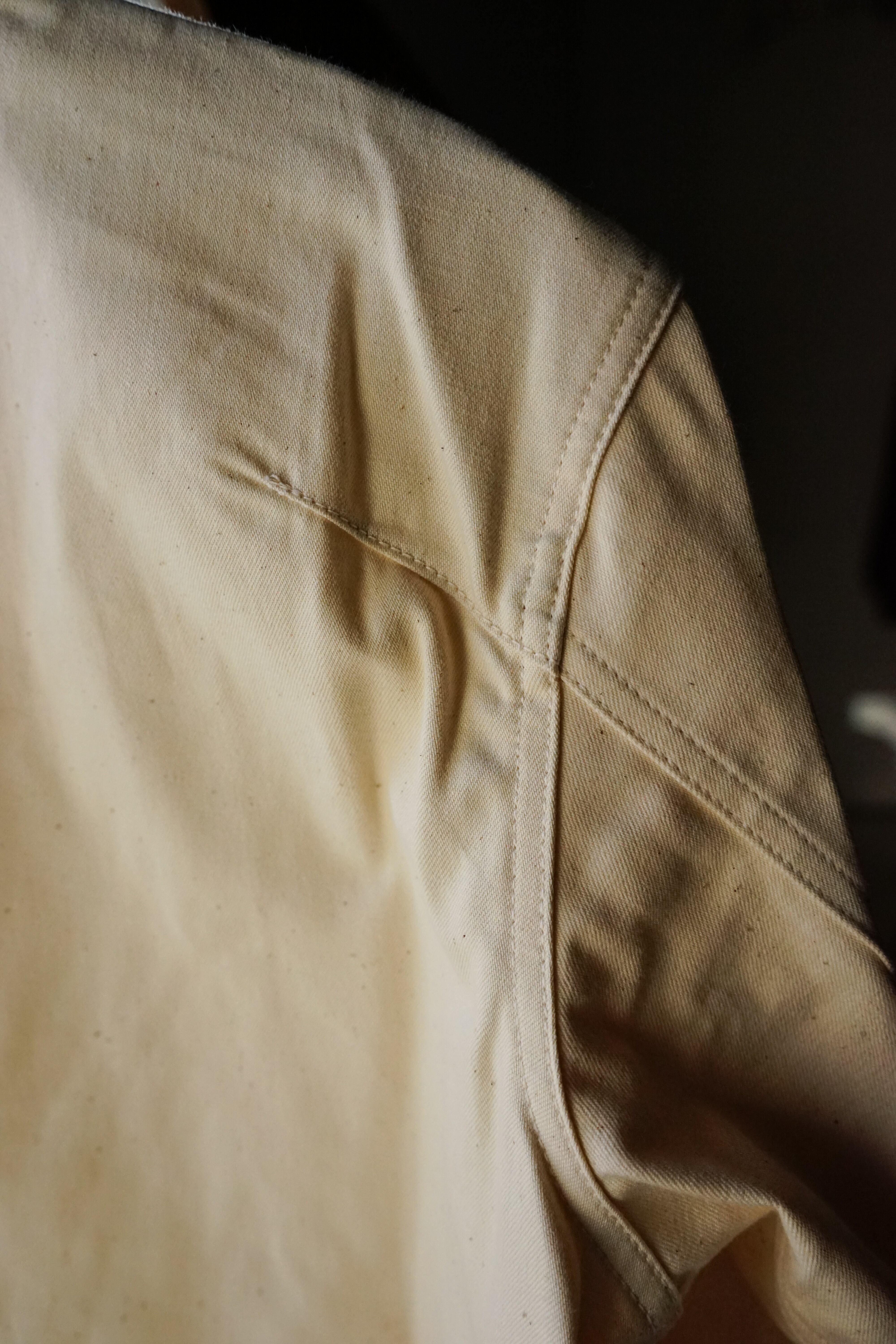 生地には12オンスの生成りキャンバスが採用されており、綿本来のカスを残したナチュラルな風合いと、しっかりとした厚みがありながらもしなやかな着心地が共存しているのが特徴です。