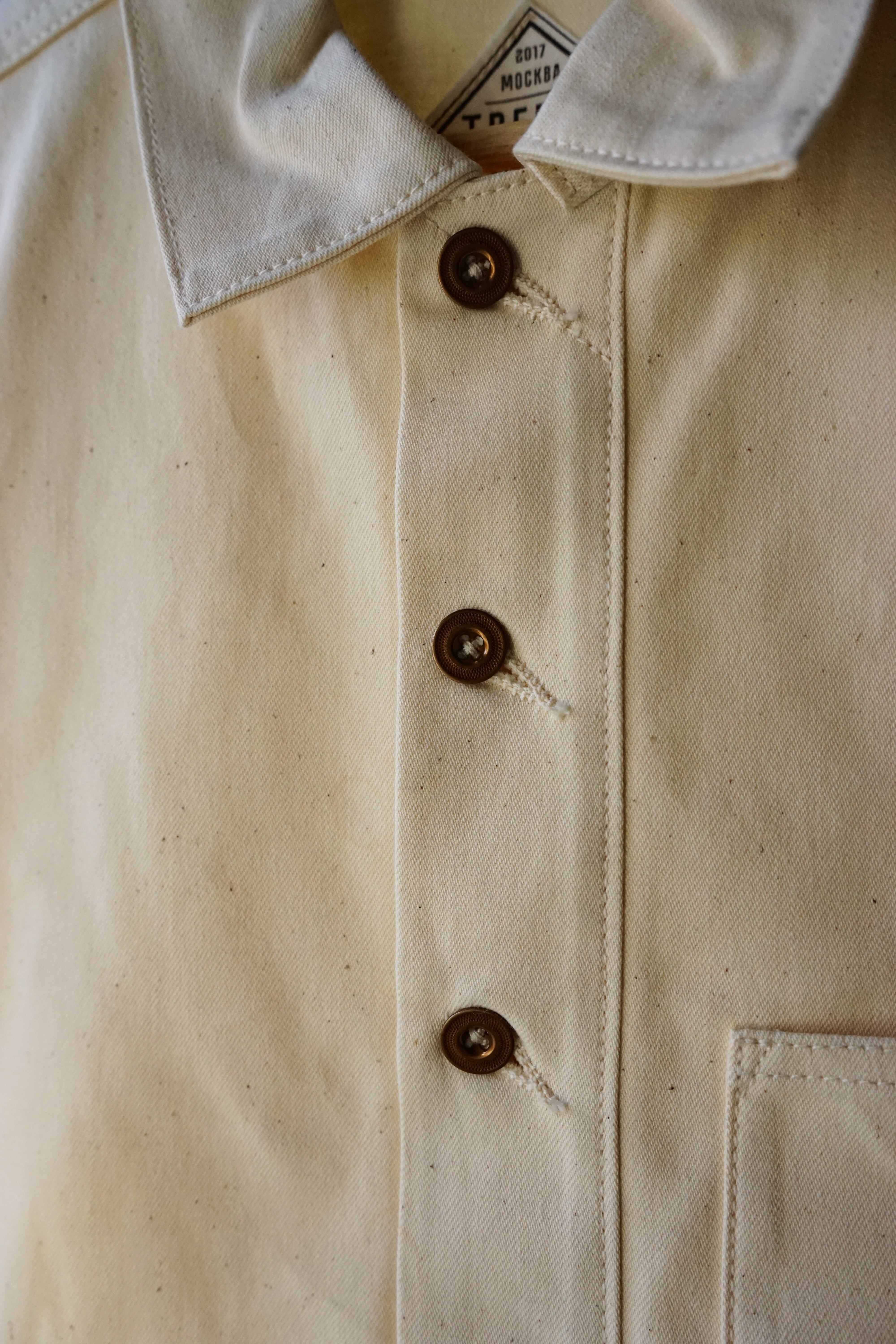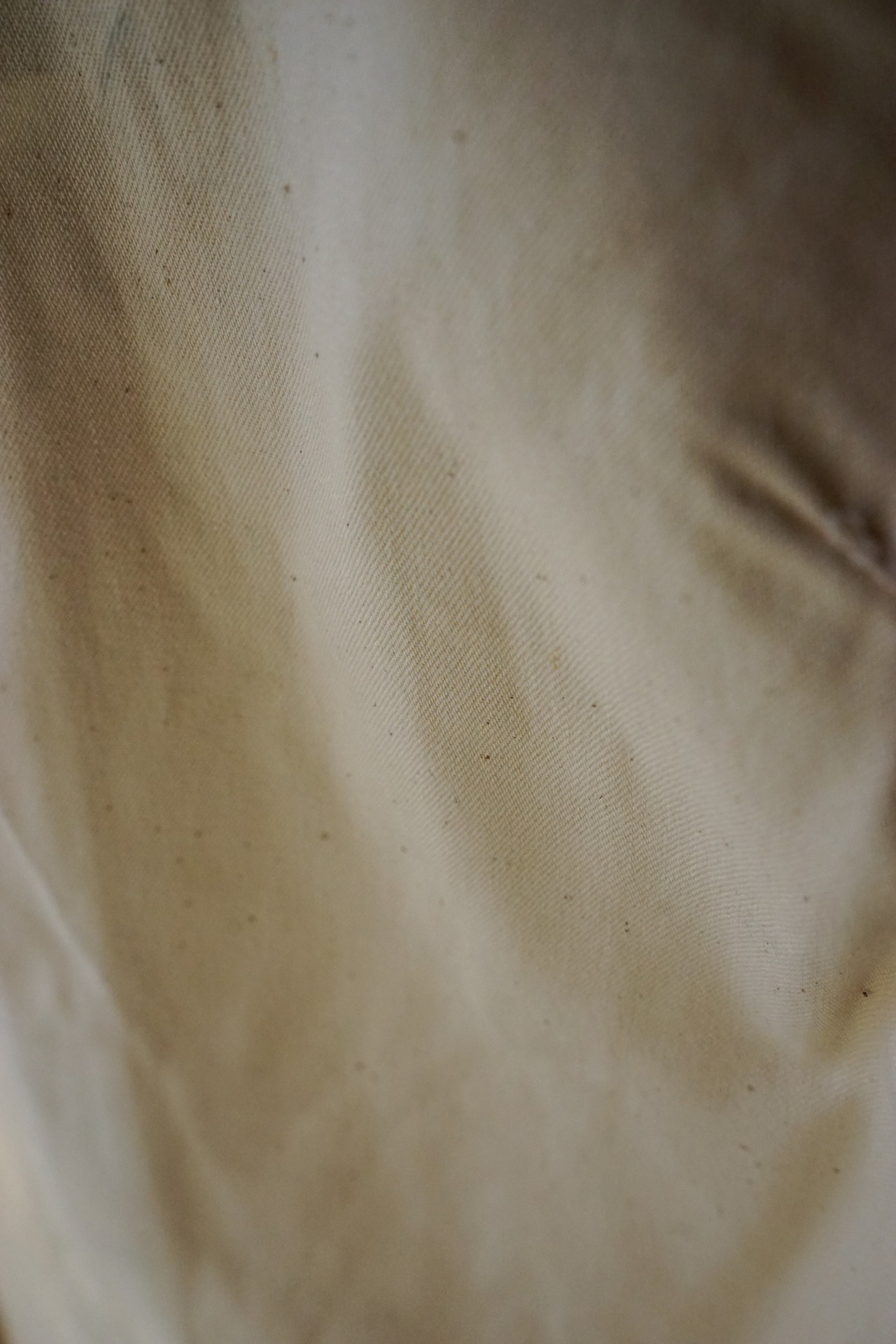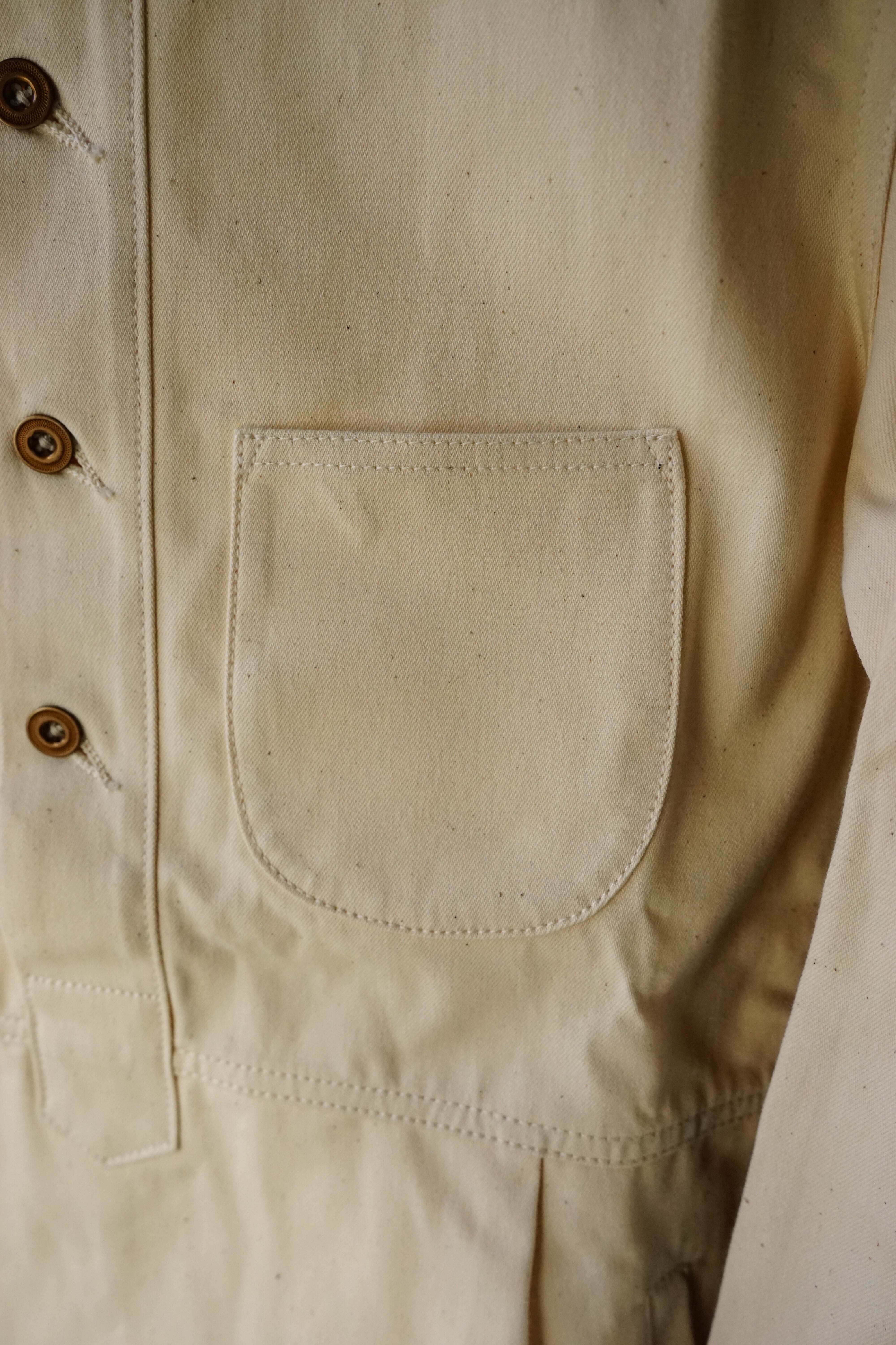 生地には12オンスの生成りキャンバスが採用されており、綿本来のカスを残したナチュラルな風合いと、しっかりとした厚みがありながらもしなやかな着心地が共存しているのが特徴です。