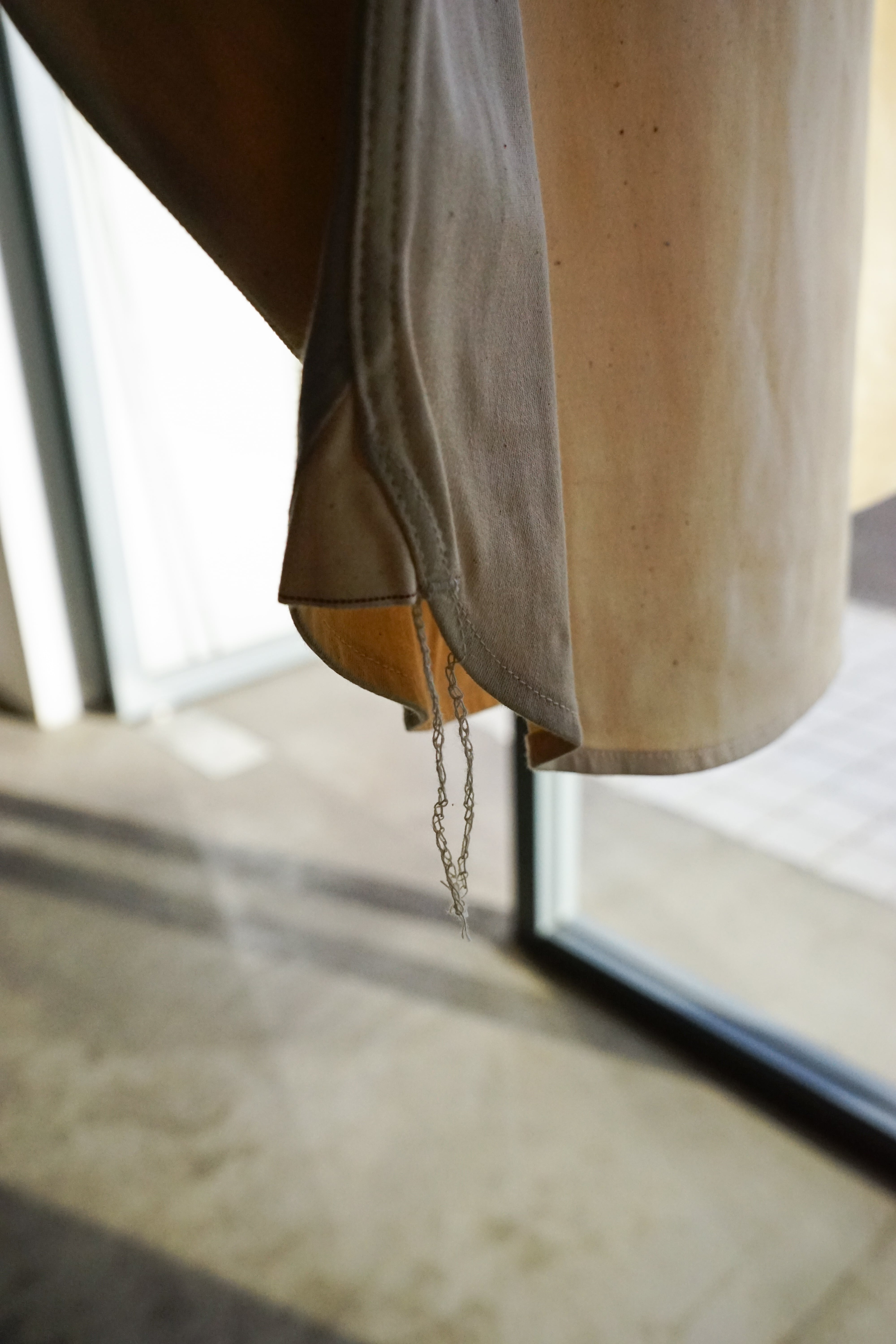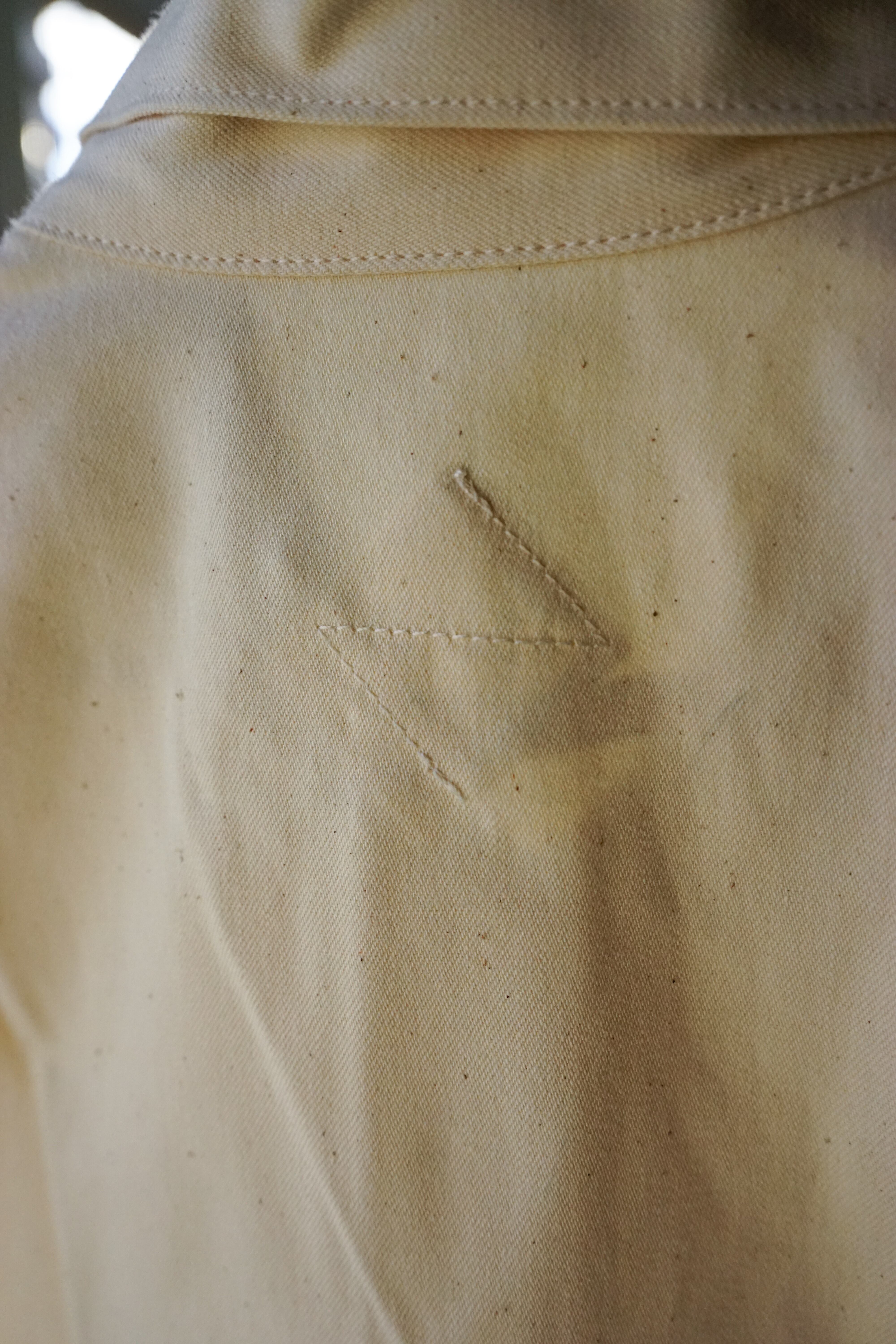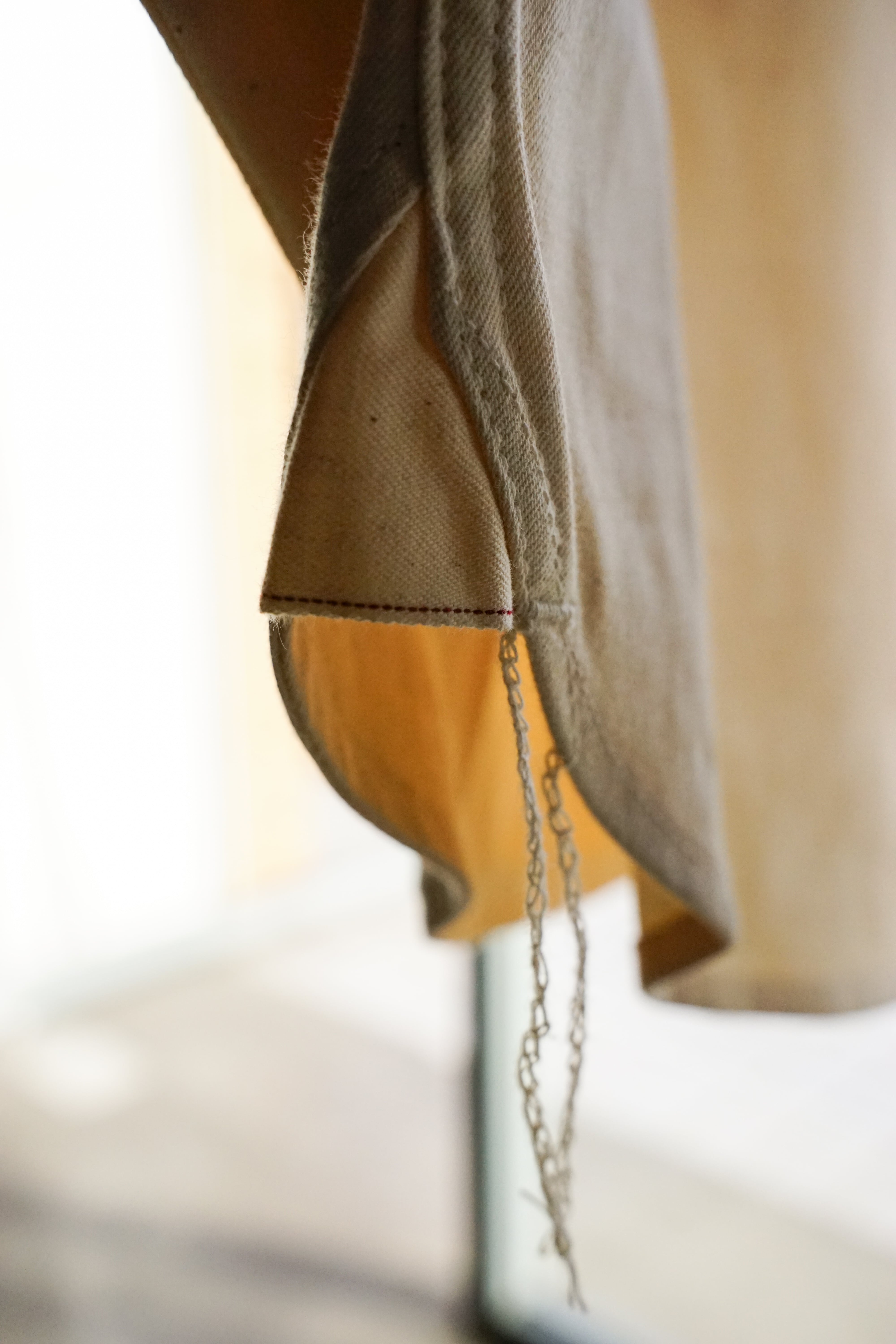 左右からアクセスできるポケットの入り口や、それを縁取る一本針ミシンのステッチワークは、手仕事ならではの不均一な温度を宿しており、この一着のアイデンティティとなっています。