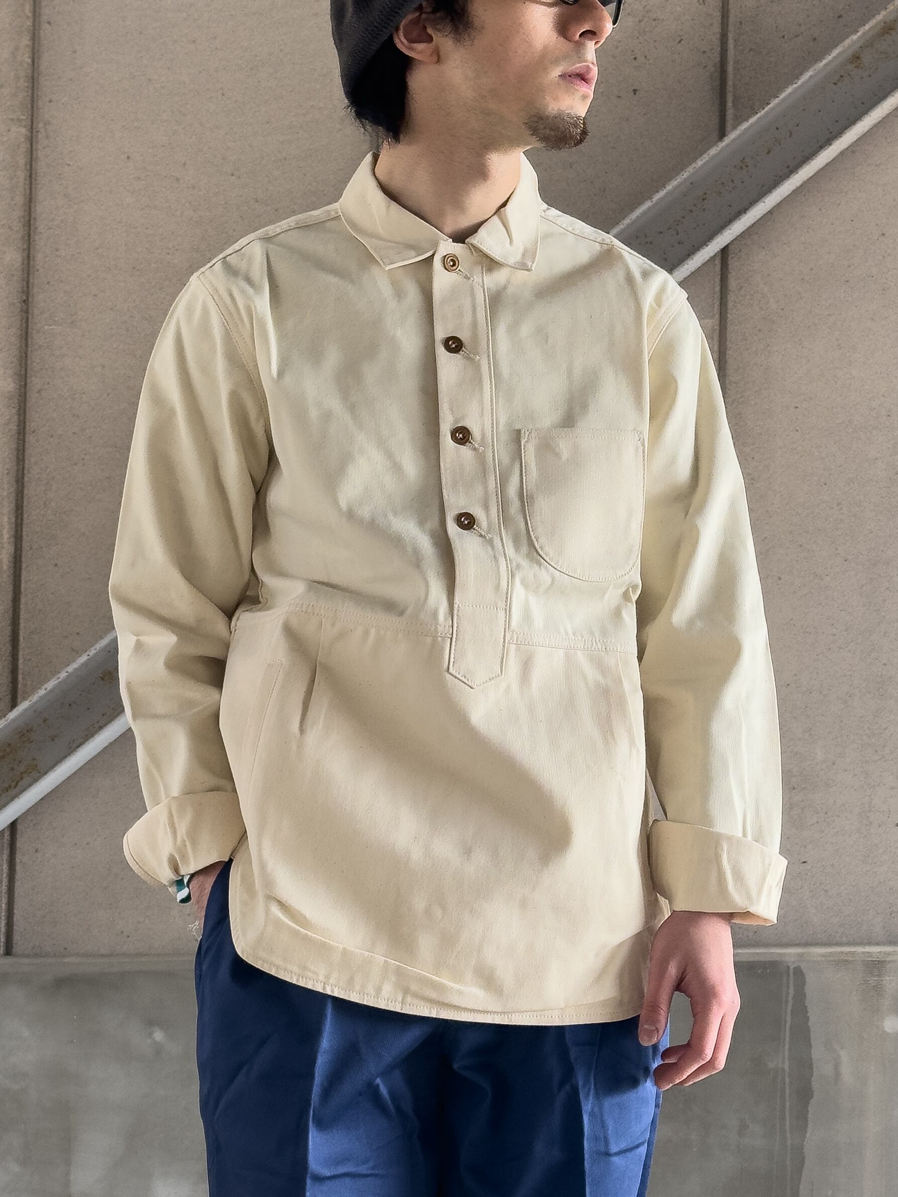 シルエットはスモックらしいすっきりとした印象で、デニムパンツはもちろん、軍パンと合わせてざっくりと羽織り、肩の力を抜いた大人のワークスタイルを楽しむのが今の気分ではないでしょうか。