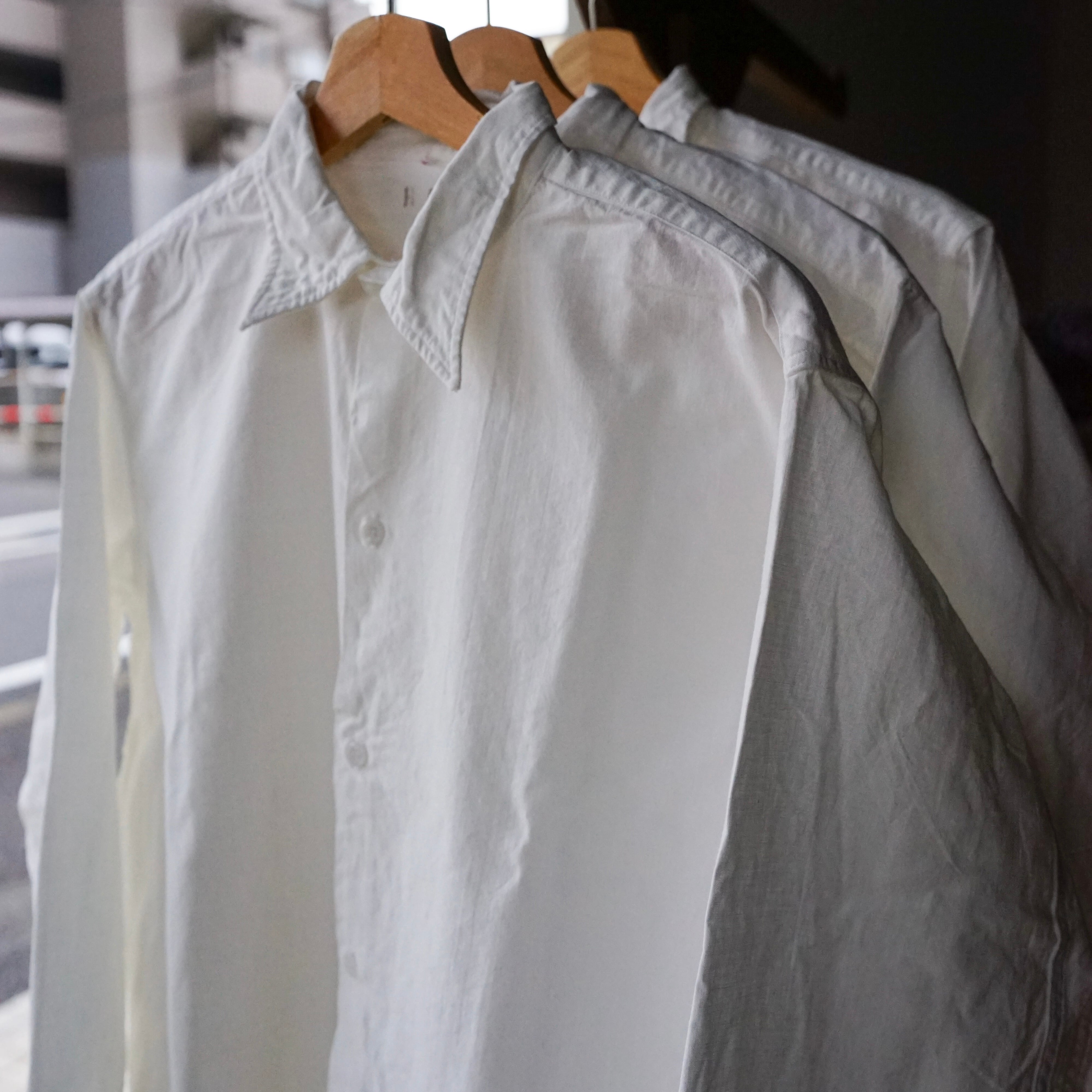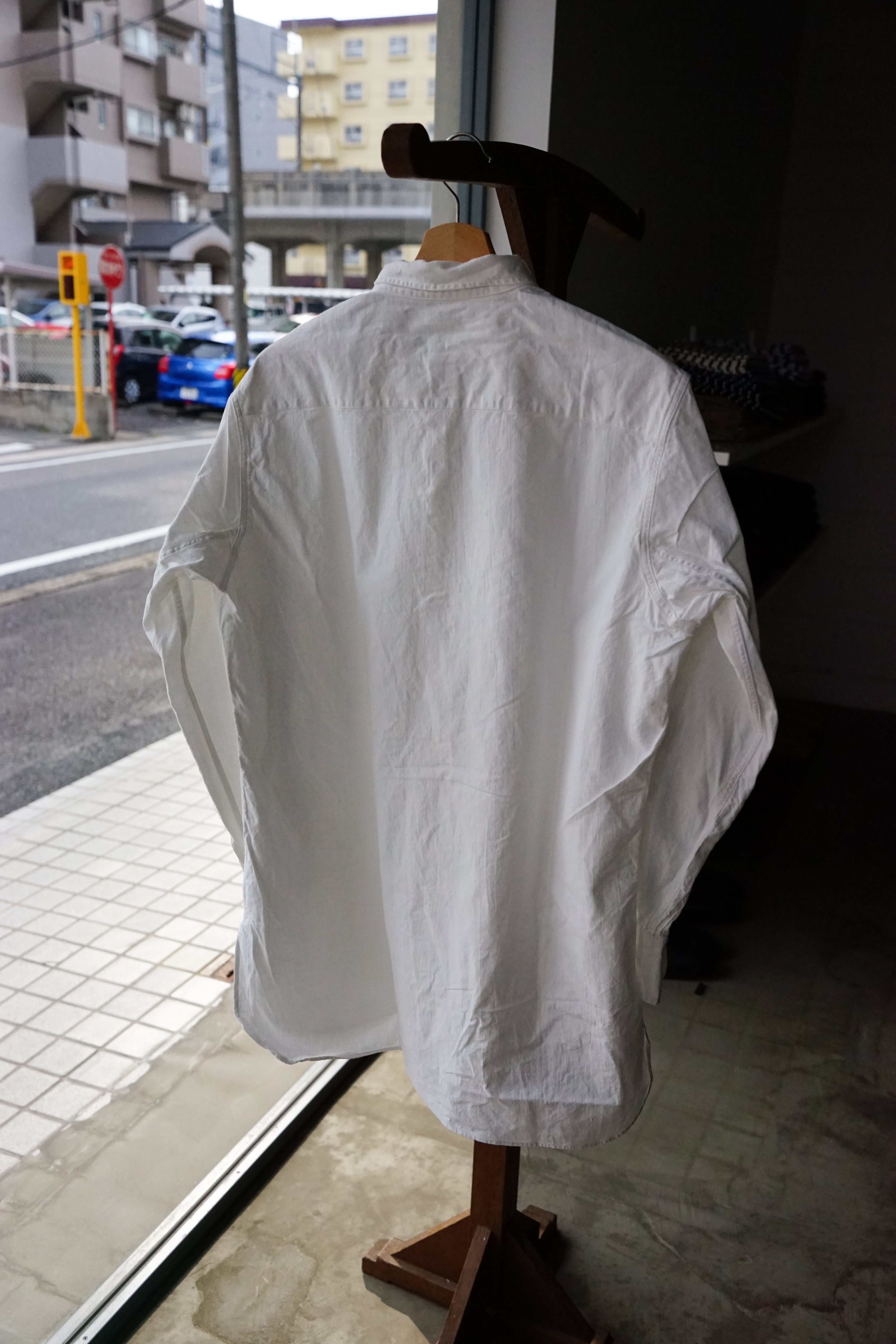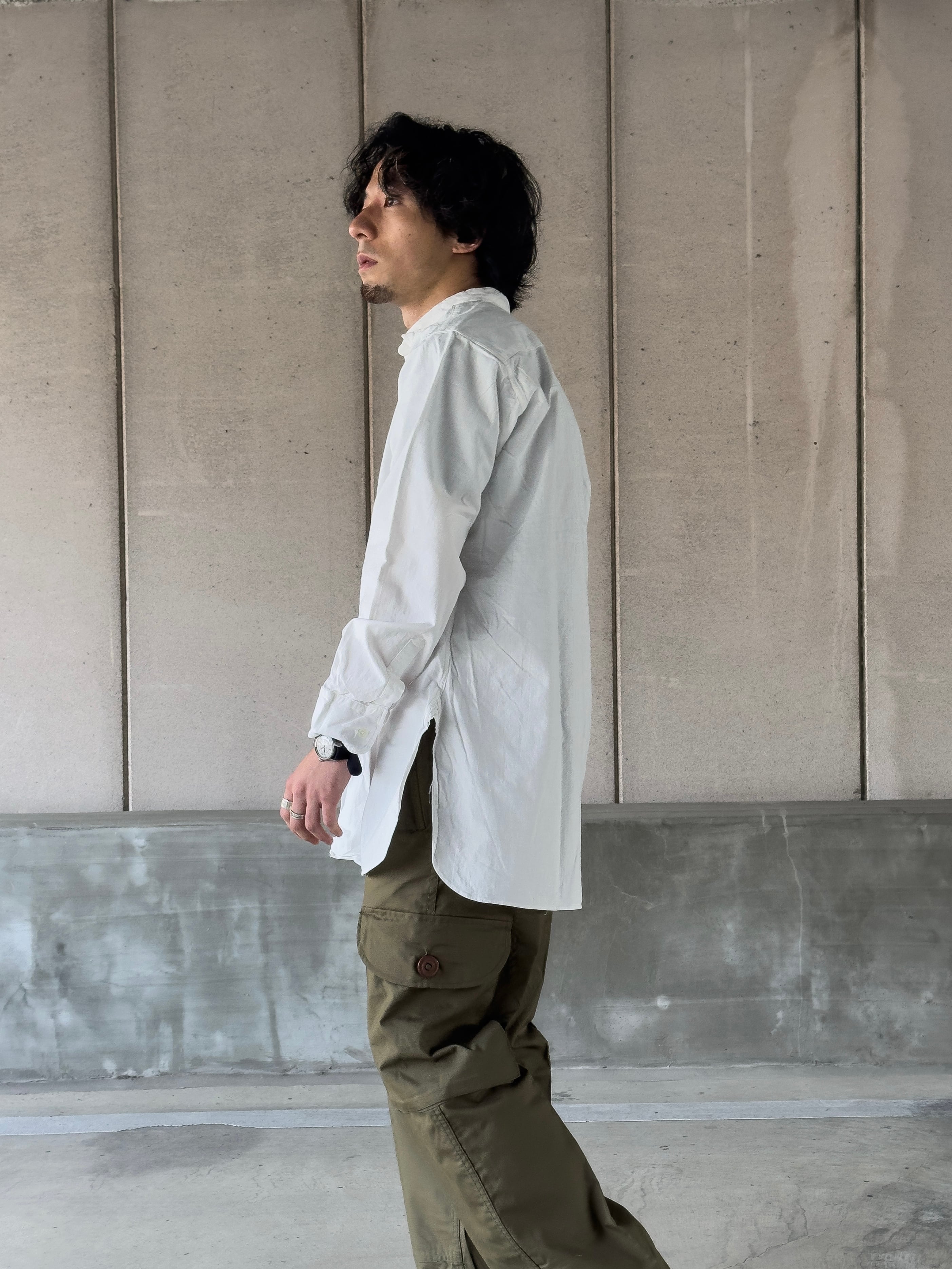 その姿は、フランスで古くから愛されてきたワークシャツである「グランパシャツ」に近い形であり、深く切り込まれたサイドスリットと相まって、シャツでありながらどこかコートのような優雅なラインを描きます。
