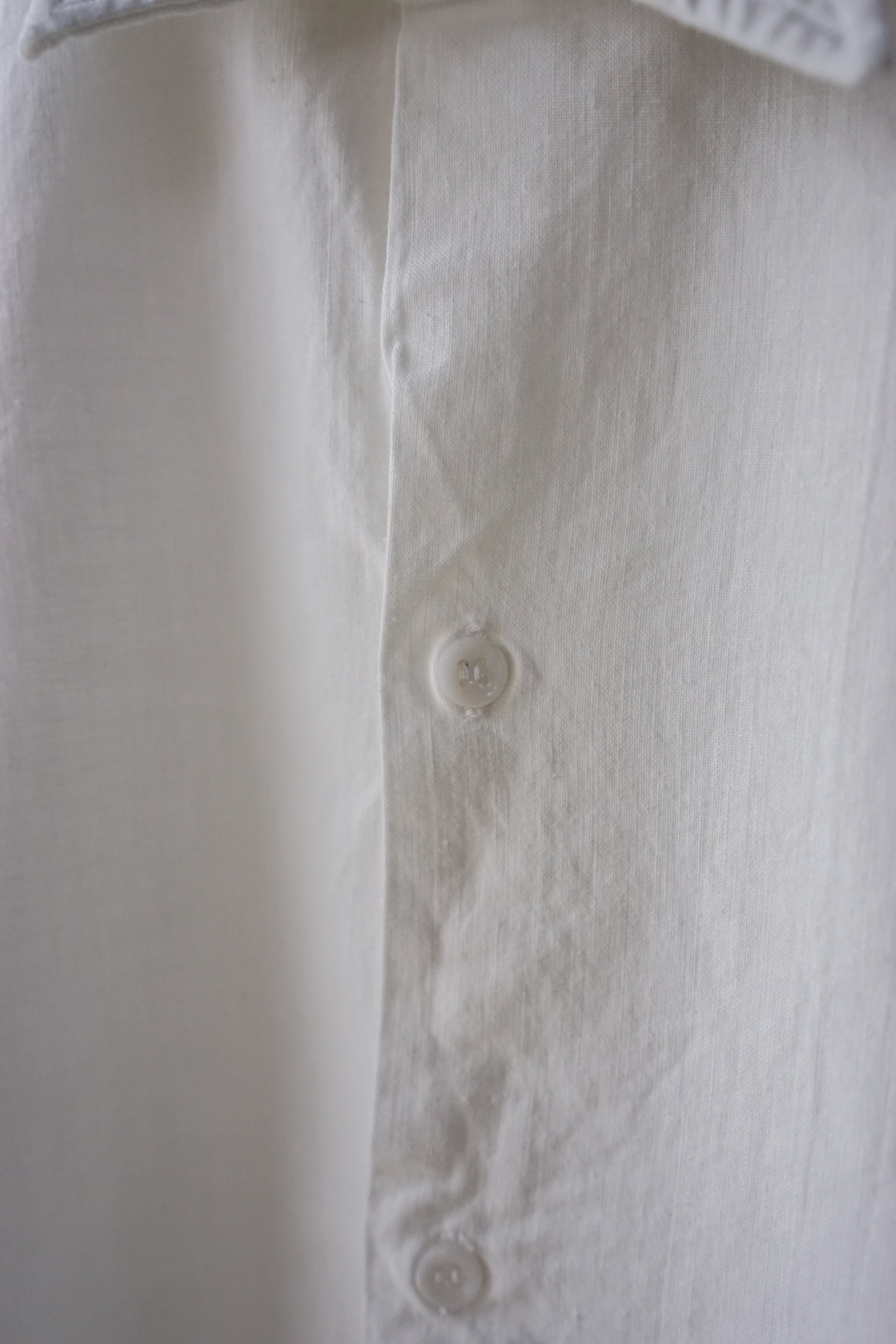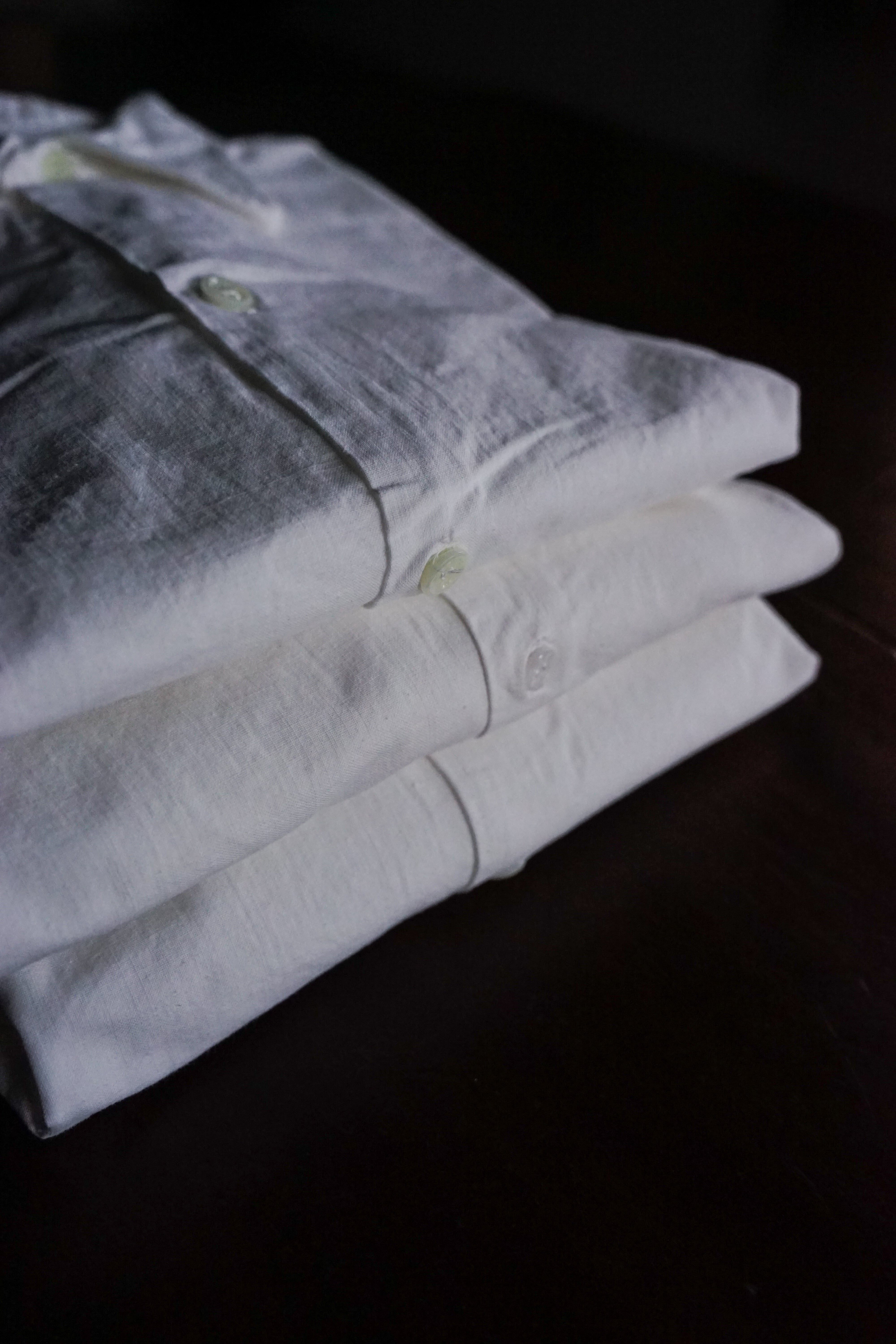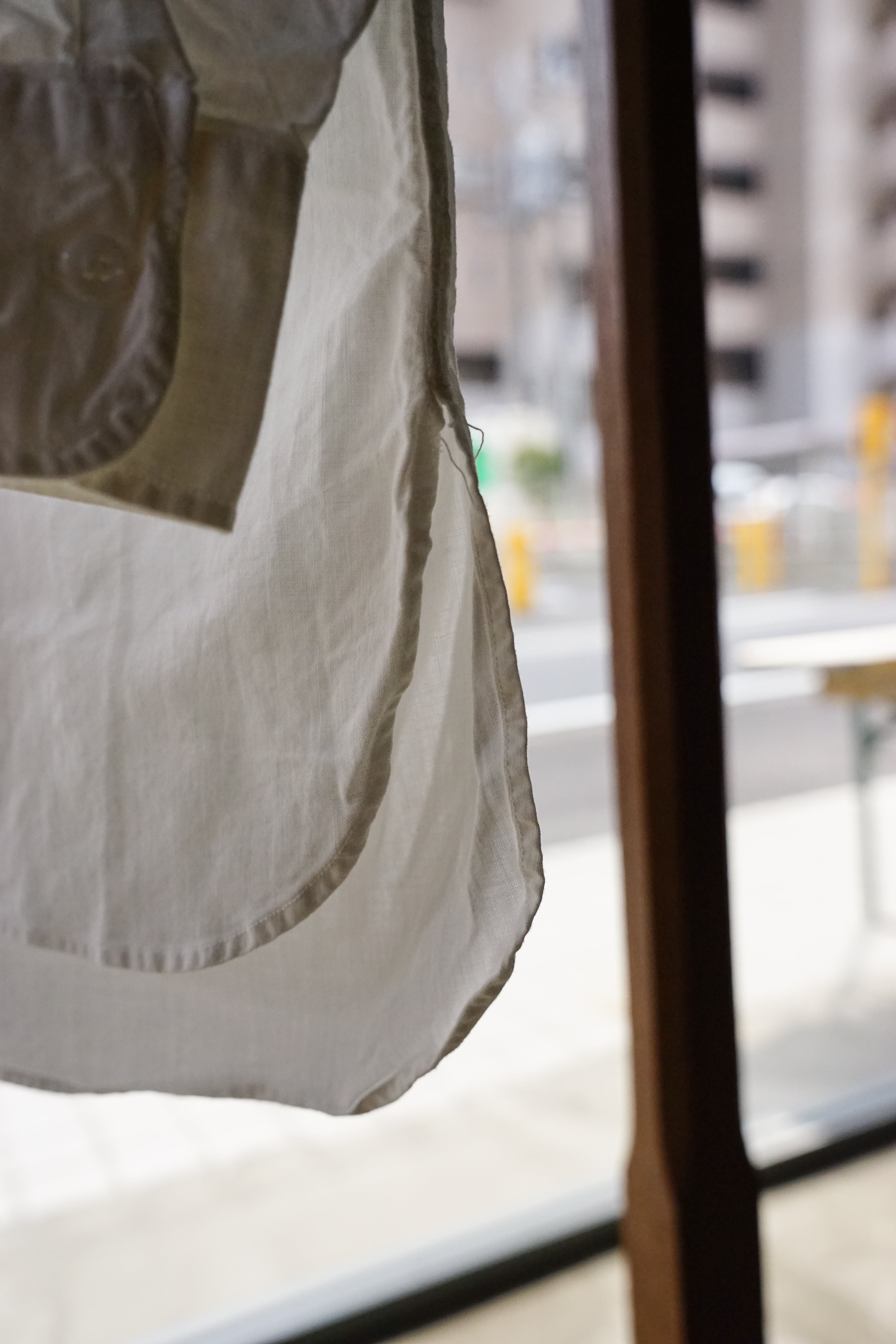 その姿は、フランスで古くから愛されてきたワークシャツである「グランパシャツ」に近い形であり、深く切り込まれたサイドスリットと相まって、シャツでありながらどこかコートのような優雅なラインを描きます。