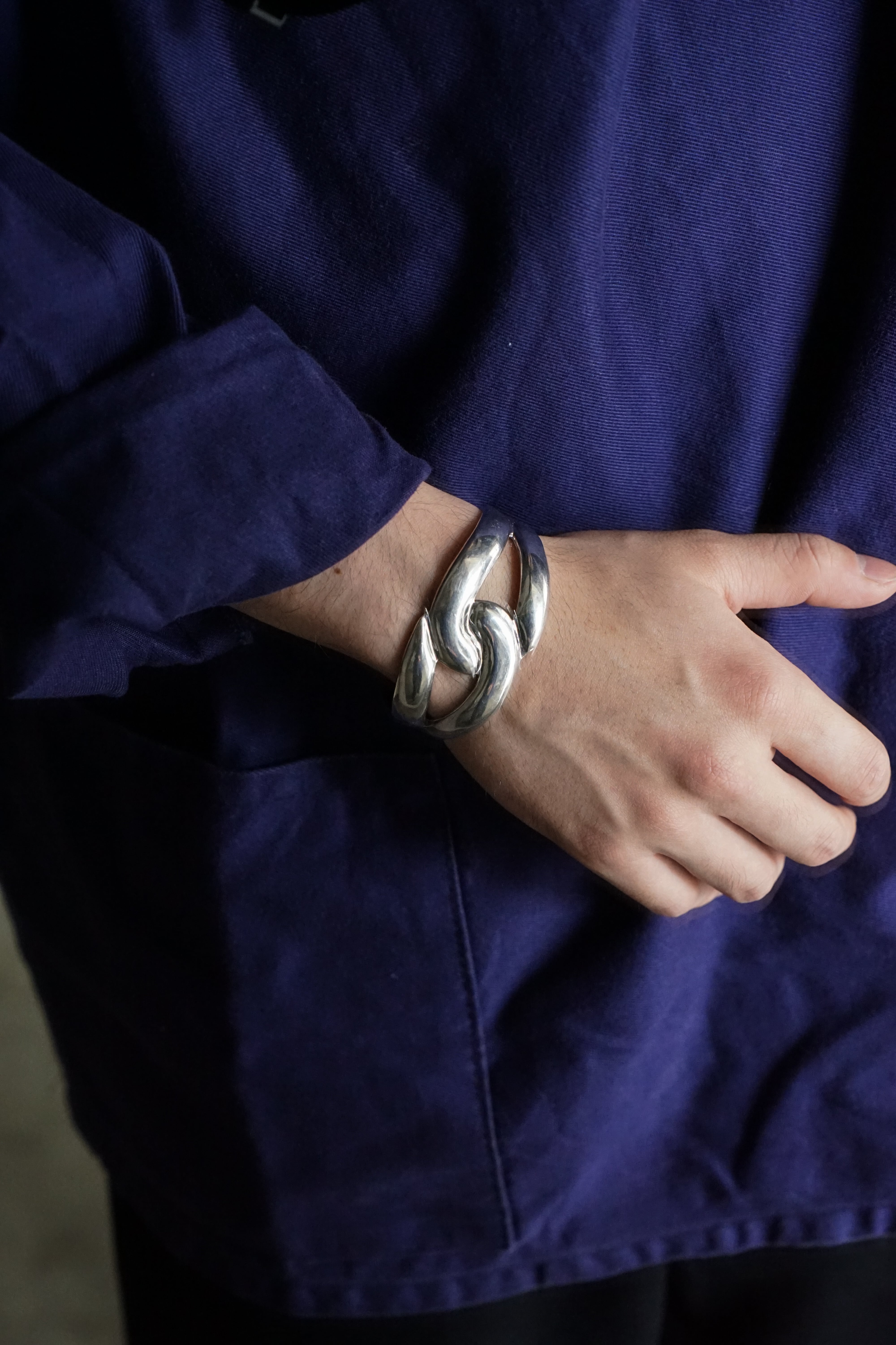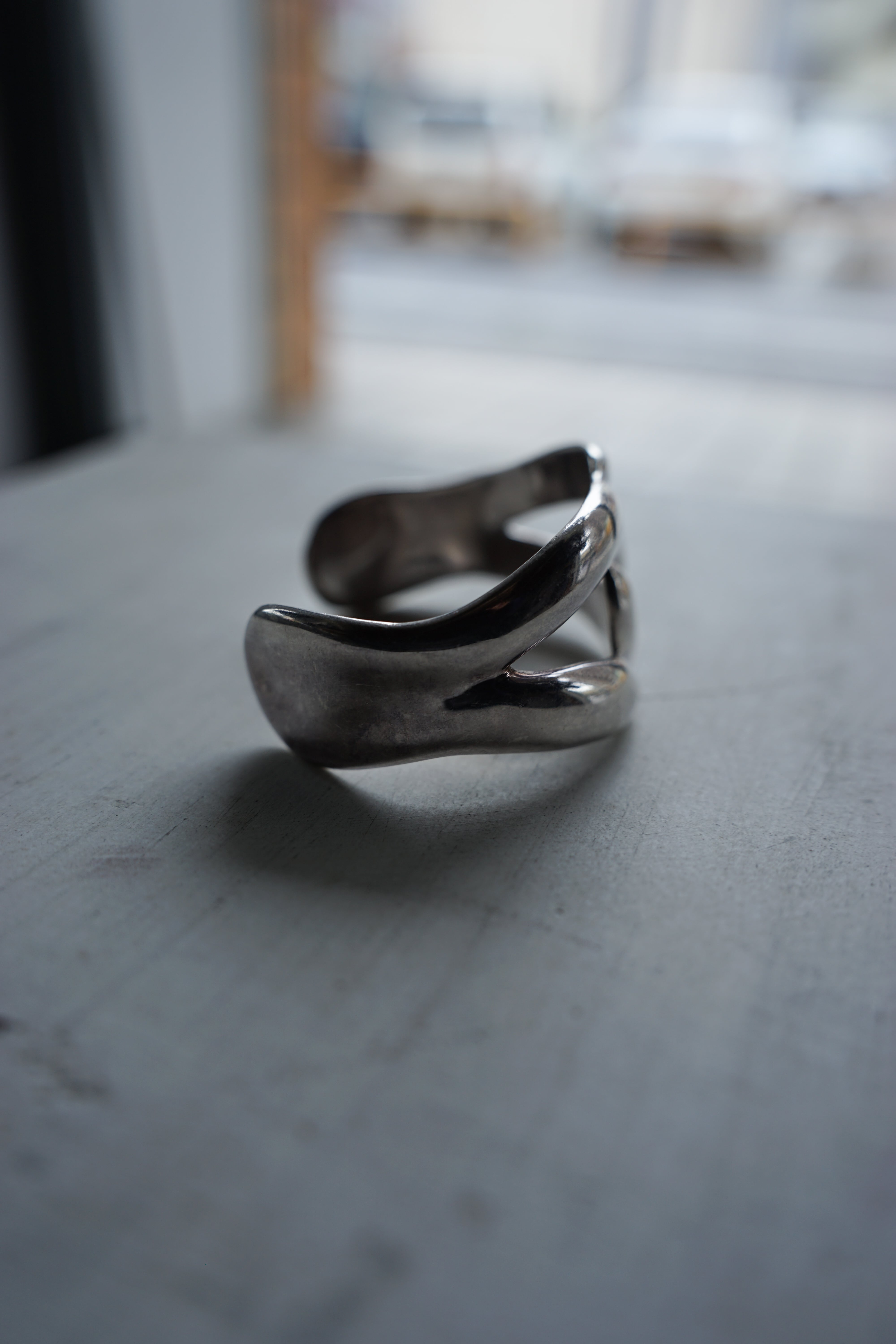肉厚なシルバーを贅沢に使用しながら、曲線が描く陰影はどこか有機的で、手作業による滑らかな面取りがシルバー特有の柔らかな光沢を引き立てています。
