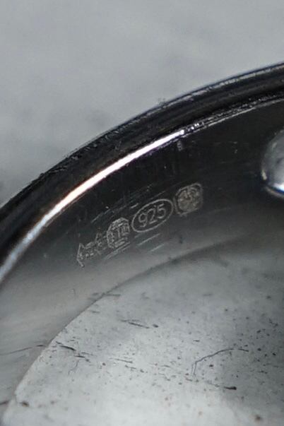 英国の伝統的な鑑定基準に加え、国際的な純度保証である共通コントロールマーク(天秤の刻印)が打たれており、厳しい基準をクリアしたシルバー925であることを証明しています。