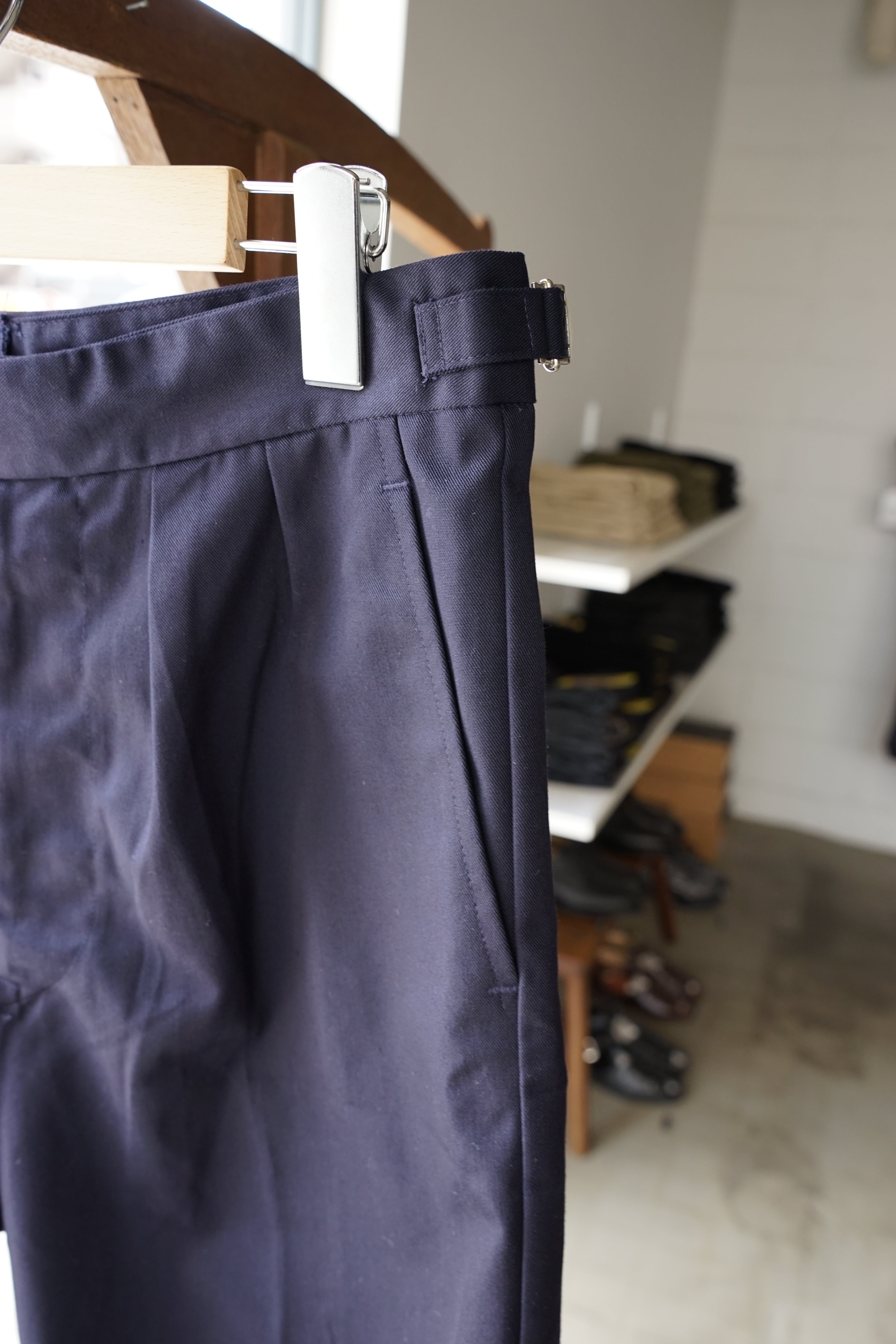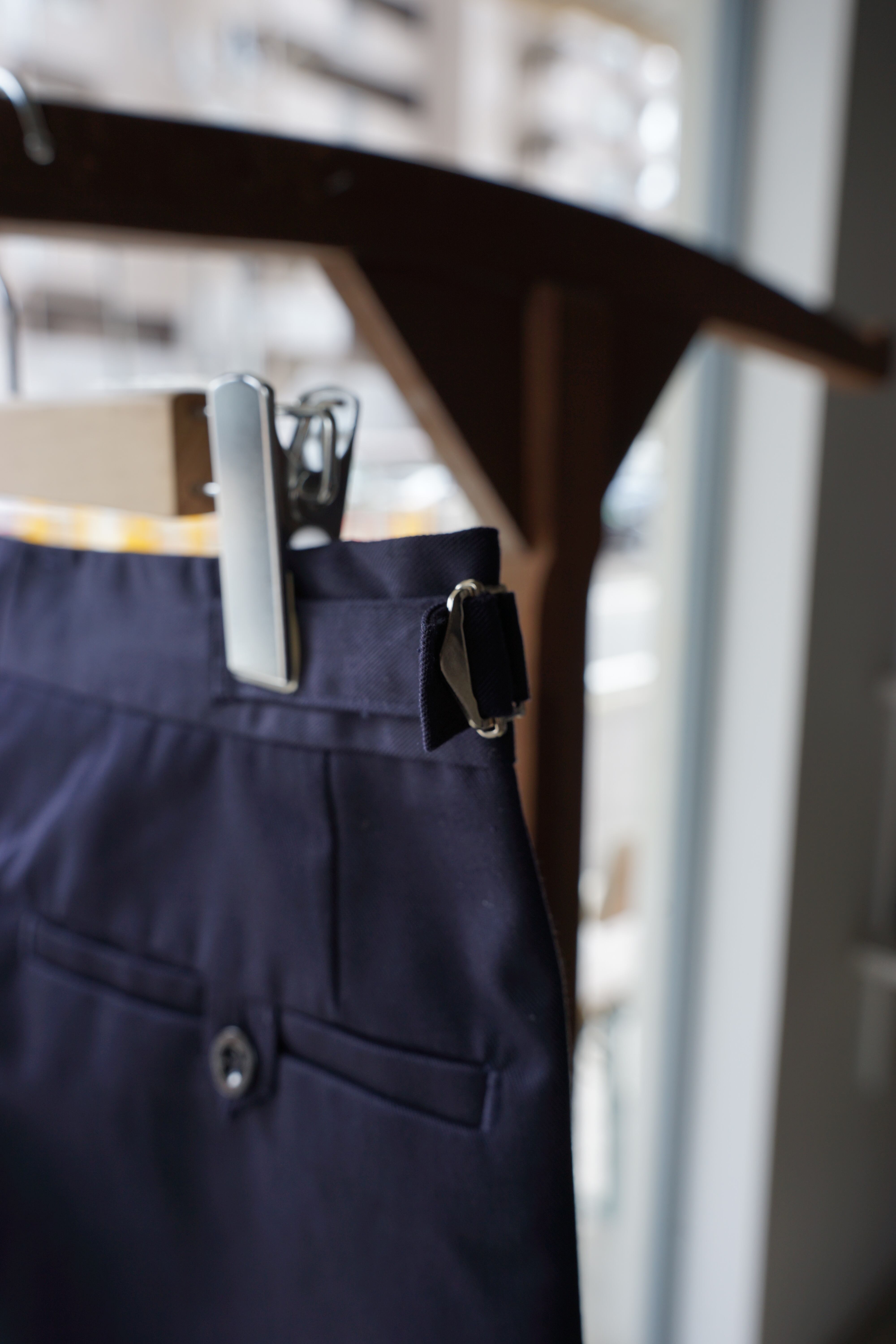 本モデルを象徴するのは、腰回りに程よいゆとりを持たせるツータックの仕様と、ベルトを介さずともウエストの微調整を可能にするサイドのアジャスター、そしてフロントの確実なホールドを実現するフック式のディテールです。