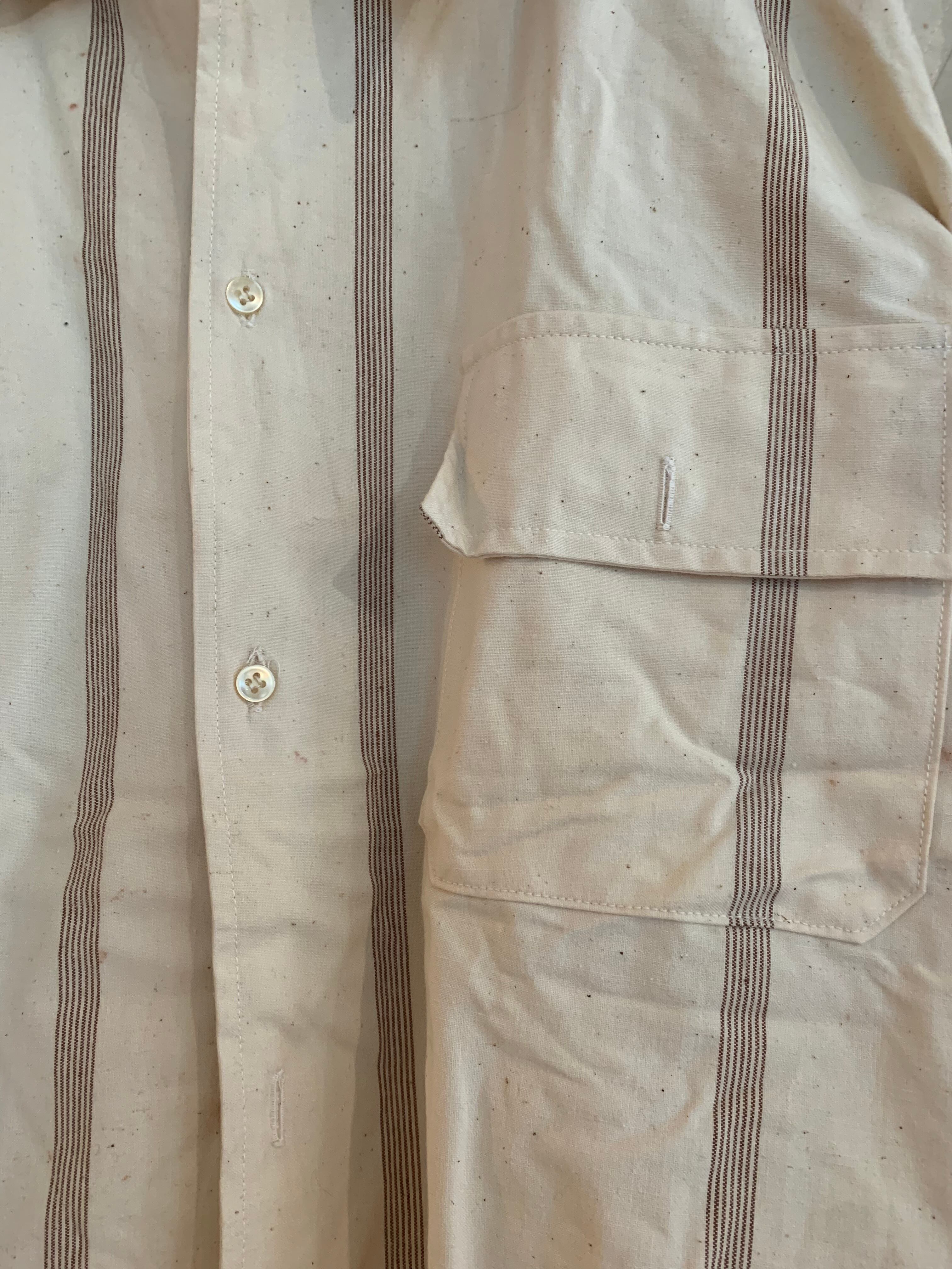 ネップの入った生成りの生地にブラウンのストライプという絶妙な組み合わせ。